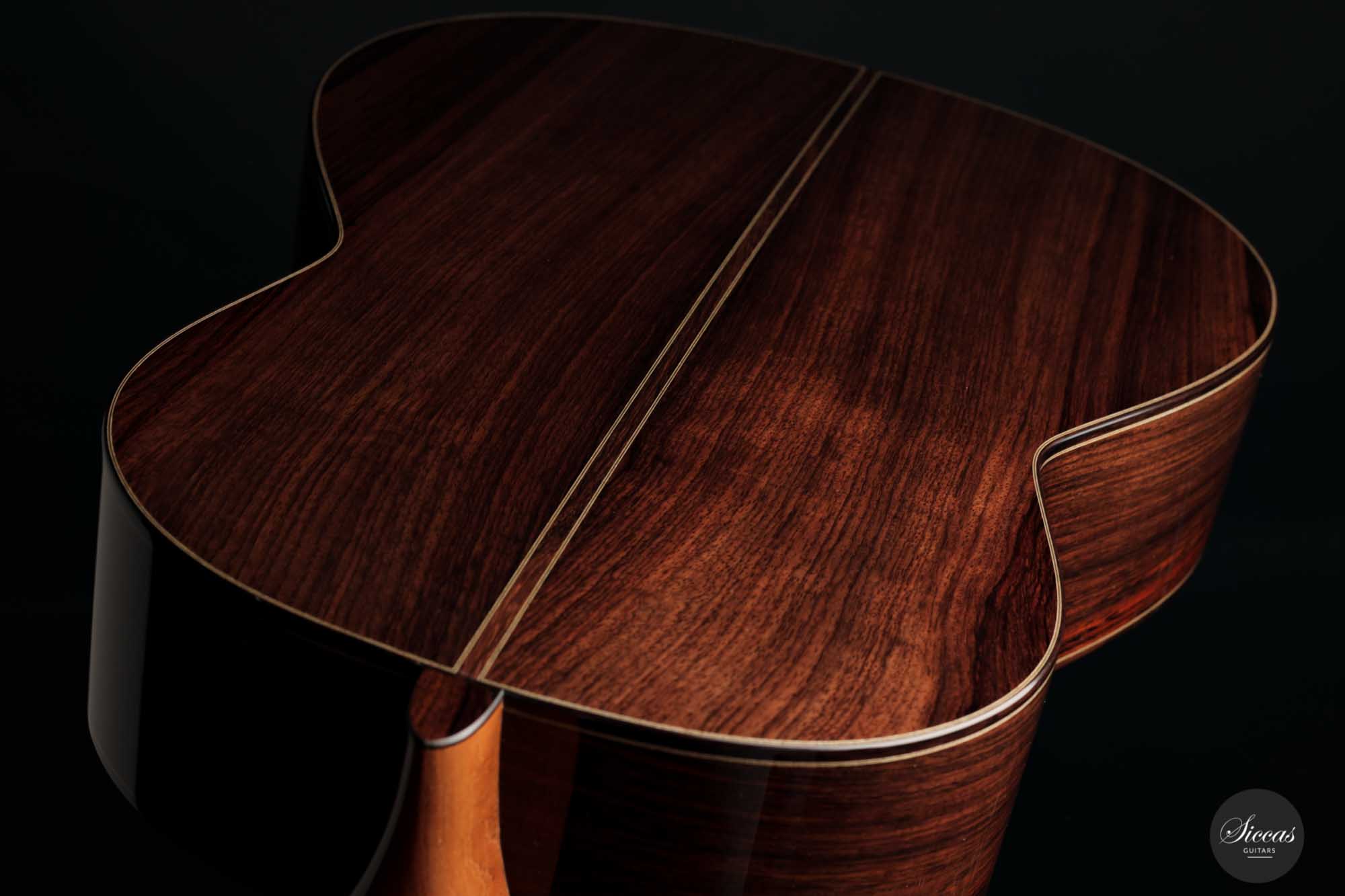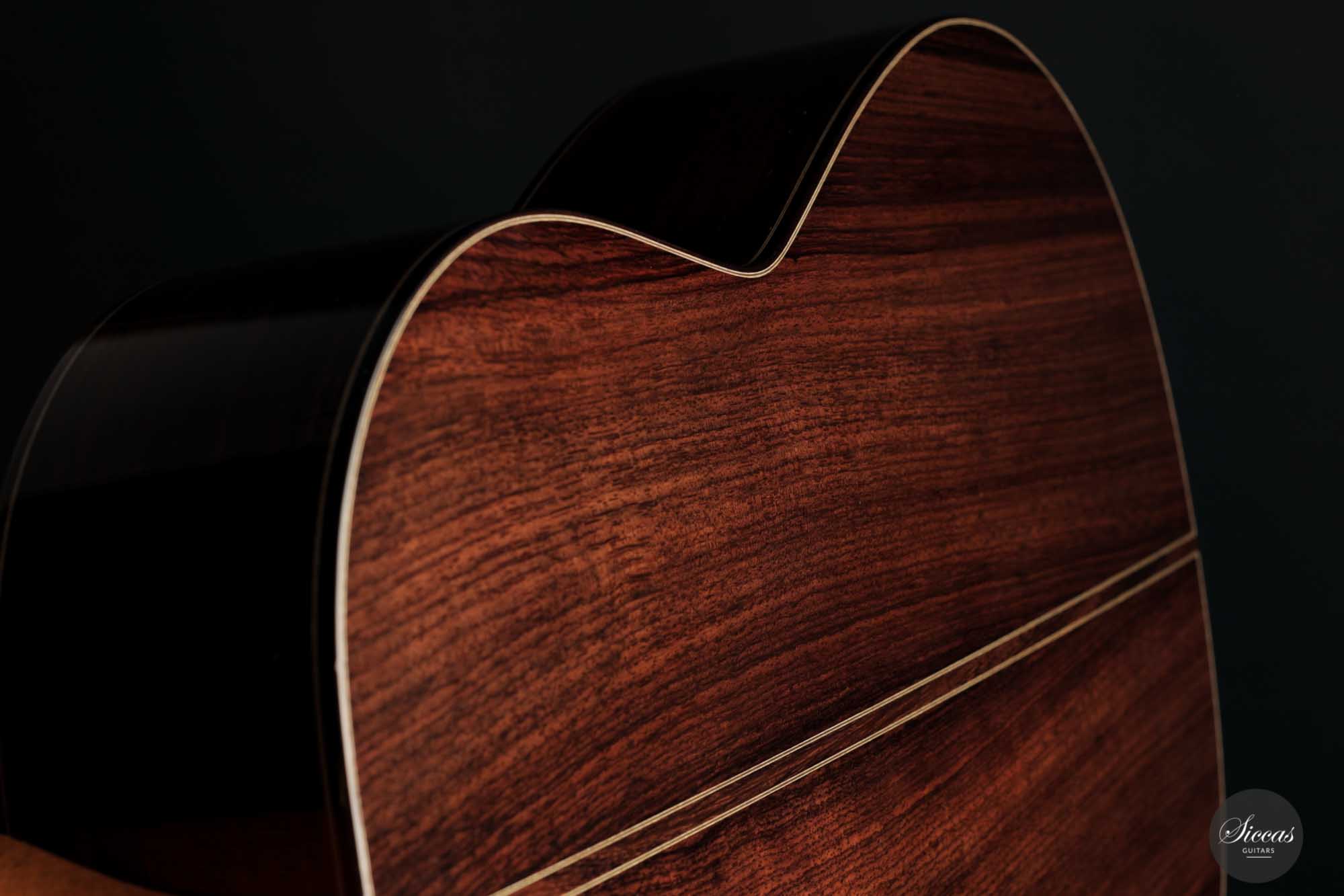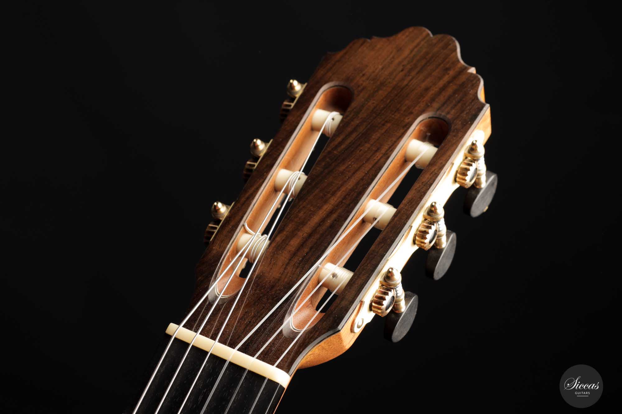 Was für eine Gitarre! Dieses Instrument, das 2021 gebaut wurde und die Nummer 89 trägt, ist nahezu neuwertig. Auf der spiegelglatten Schellackpolitur sind so gut wie keine Spielspuren zu sehen. Die französische Gitarrenbaukunst gilt seit 50 Jahren als führend in Sachen Finesse und Eleganz im weltweiten Gitarrenbau. Angefangen mit Robert Bouchet, dann Daniel Friederich und Dominique Field, gefolgt von Jean-Noel Rohé. Diese Tradition wird nun von Bertrand Ligier mit einer spektakulären handwerklichen Qualität noch weiter ausgebaut, wie diese Gitarre eindrucksvoll beweist. Unserer Ansicht nach ist diese Rosette ein echtes Zeichen von Genialität. Getreu dem Stil von Bertrand Ligier, mit Details im Zehntelmillimeterbereich, stellt sie eine versteckte Hommage an Daniel Friederichs Rosette dar, die uns emotional berührt. Die Farben und Formen des zentralen Mosaiks sind ein wahrhaftig hypnotisierendes, fresco-artiges Kunstwerk, das die Geschichte der französischen Gitarrenbauschule inne trägt.