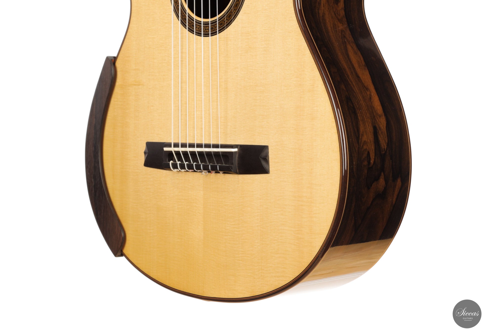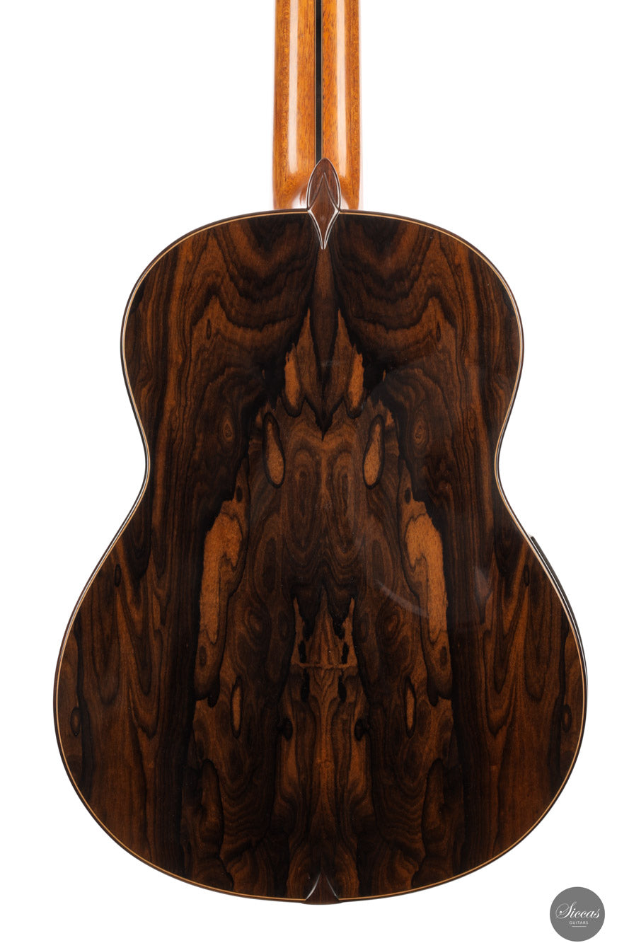 This 2019 seven-string concert guitar by Boguslaw Teryks features a modern double-top construction with a Nomex core, delivering exceptional projection, sustain, and responsiveness. The spruce outer layer and ziricote back and sides produce a clear and harmonically rich tone, supported by structural lightness and an impressively broad dynamic spectrum. Tonally, the guitar combines warmth and focus with a remarkably natural character—unlike many double-tops, this instrument avoids artificial compression and remains organic and open in sound. The trebles are lyrical and carry effortlessly, while the basses are deep and articulate, producing a piano-like clarity. It responds quickly to touch and offers a wide palette of tonal colors, accommodating subtle nuance as well as powerful projection. The extended fingerboard permits a full two-octave range on the first string, and the ergonomically shaped neck, paired with a comfortable armrest, makes this seven-string guitar especially accessible to players transitioning from six-string models. Tuned with Klaus Scheller machines and strung with Knobloch EDC 34.0 strings, this is a top-tier performance instrument offering both precision and expressivity. It is in excellent condition.Condition