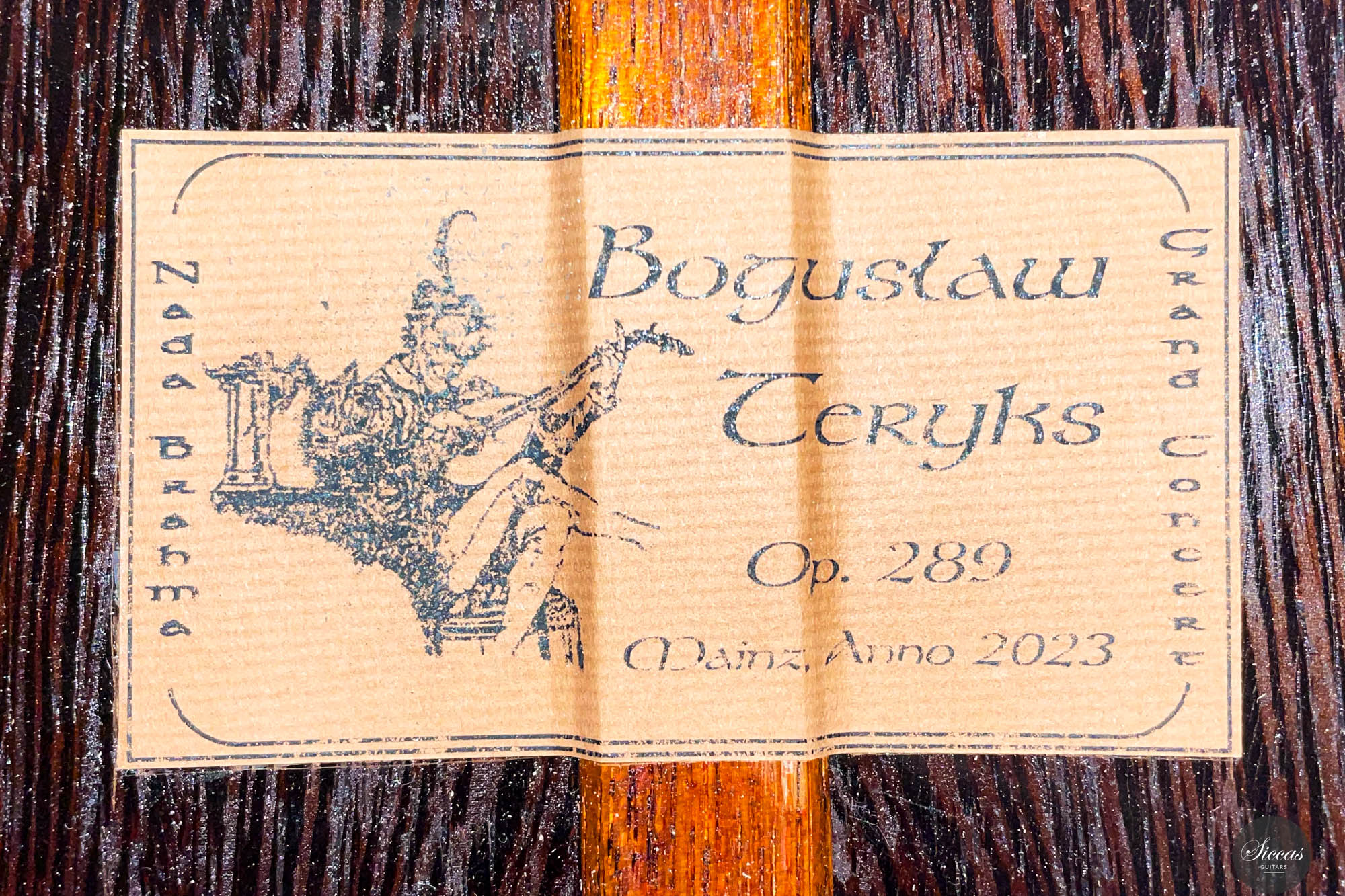 Bogusław Teryks, ein renommierter polnischer Gitarrenbauer, der in Mainz, Deutschland, lebt, baut seit 1982 Gitarren. Seine Reise in die Welt des Gitarrenbaus ist tief in seiner Kindheit verwurzelt, umgeben von Musik und den musikalischen Bestrebungen seiner Eltern. Diese Umgebung weckte nicht nur seine Faszination für Musik als eine einzigartige Form der Kommunikation, sondern nährte auch seine musikalische Leidenschaft und Sensibilität für Klang, entscheidende Eigenschaften für einen Gitarrenbauer. Teryks Abenteuer mit dem Gitarrenbau begann ernsthaft nach einer freundlichen Wette in der siebten Klasse, die darin bestand, innerhalb von zwei Wochen die meisten Lieder auf der Gitarre zu lernen – eine Herausforderung, die er gewann. Dieser Sieg markierte einen Wendepunkt in seinem Leben und lenkte ihn auf seine Berufung hin. Sein Wunsch, klassische Gitarre zu spielen, wurde weiter durch den venezolanischen Virtuosen Alirio Díaz sowie andere bemerkenswerte Musiker wie Jorge Cardoso und Wolfgang Lendle beeinflusst, nachdem er 1975 eine Konzertübertragung im polnischen Fernsehen gesehen hatte. Diese Erfahrungen legten den Grundstein für Teryks Überzeugung von der Wichtigkeit nicht nur der Spieltechnik, sondern auch der Notwendigkeit eines angemessenen Instruments, um die in der Musik eingebetteten Emotionen zu vermitteln.