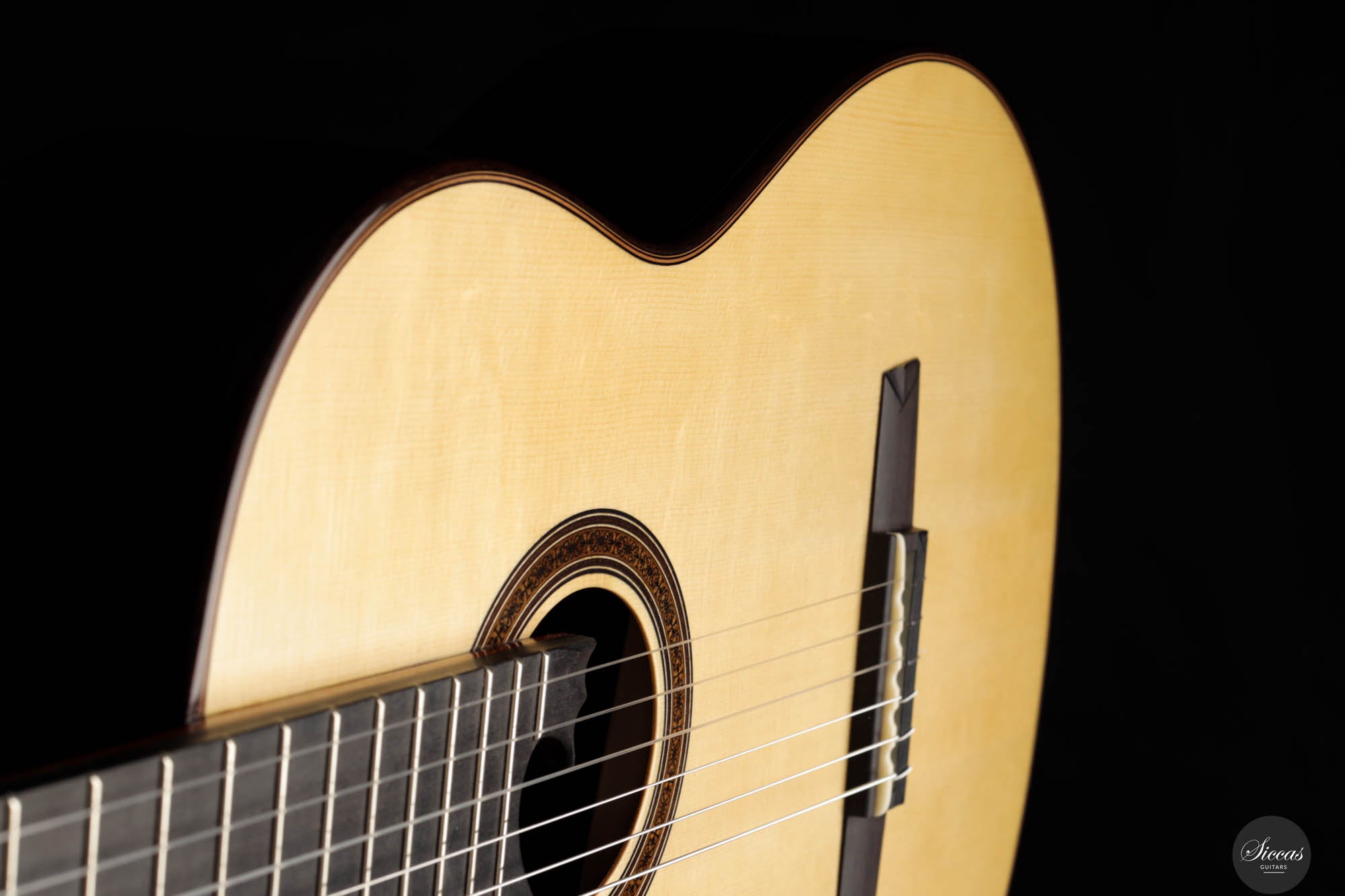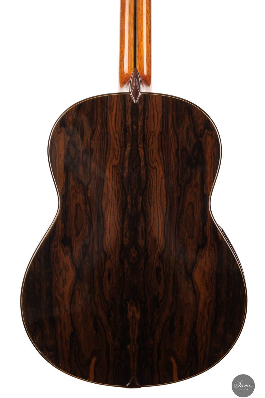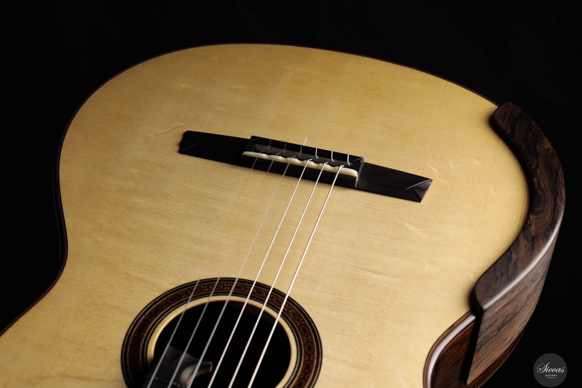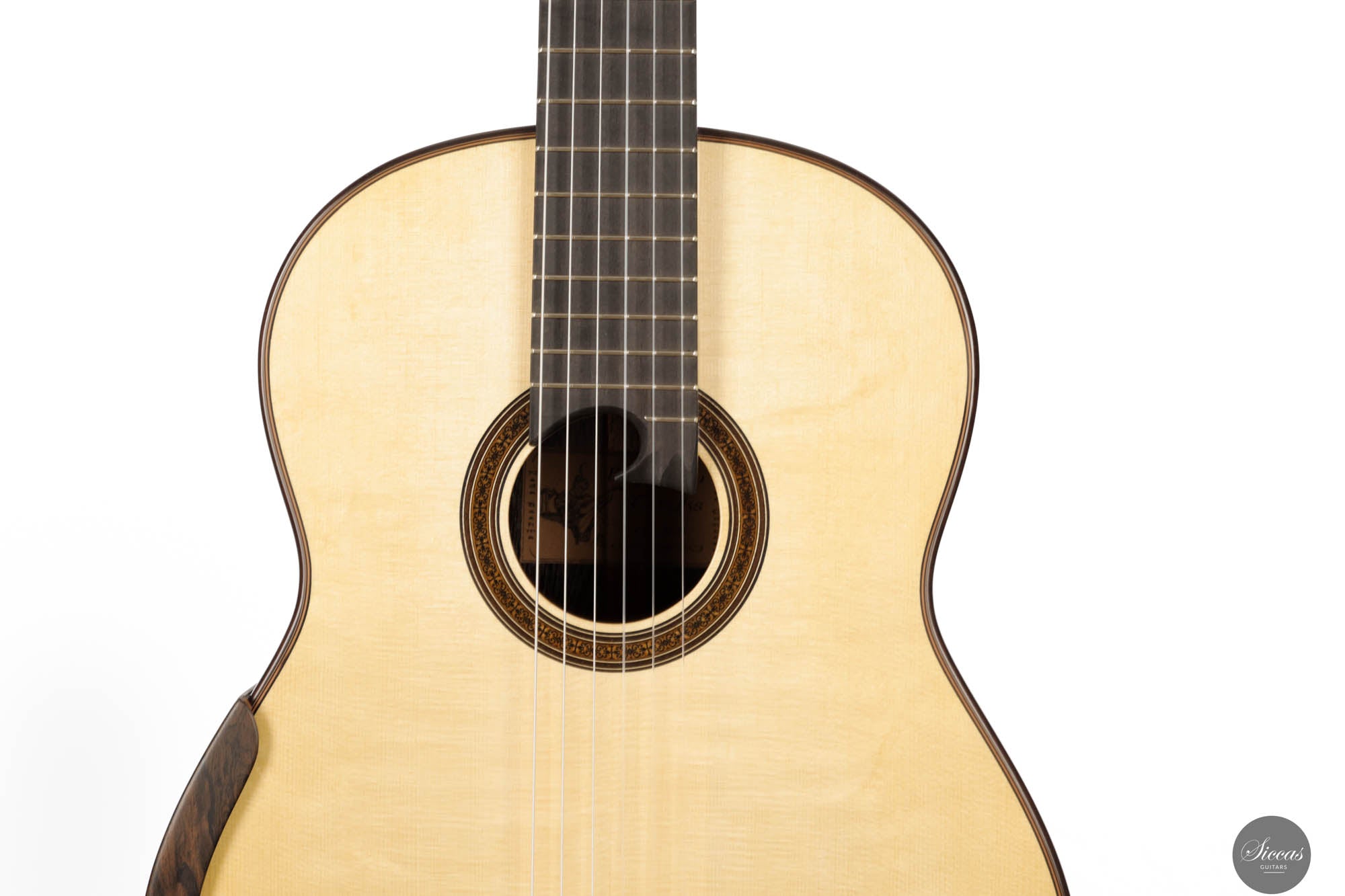 Diese brandneue Gitarre präsentiert sich als ein Paradebeispiel für ein Konzertinstrument, das sorgfältig gefertigt wurde, um den Anforderungen jeder Aufführungssituation gerecht zu werden. Sie steht als Zeugnis für Kraft und Präzision und bietet die Gewissheit eines ausreichenden Volumens, um Konzertsäle zu füllen und das Publikum zu fesseln. Neben ihrem robusten Klang ist diese Gitarre mit Blick auf den Komfort des Spielers konzipiert, mit einer leichten Spielbarkeit, die auch während der intensivsten Auftritte eine entspannte Haltung ermöglicht. Die Kombination einer Fichtendecke mit Ziricote-Rücken und -Seiten, die mit größter Sorgfalt für höchste Qualität ausgewählt wurden, trägt zum außergewöhnlichen Klang des Instruments bei. Der Bau der Gitarre zielt nicht nur auf ästhetische Schönheit ab, sondern verbessert auch ihre akustischen Fähigkeiten, um sicherzustellen, dass die Klarheit ihrer Höhen selbst in den komplexesten polyphonen Kompositionen durchscheint.