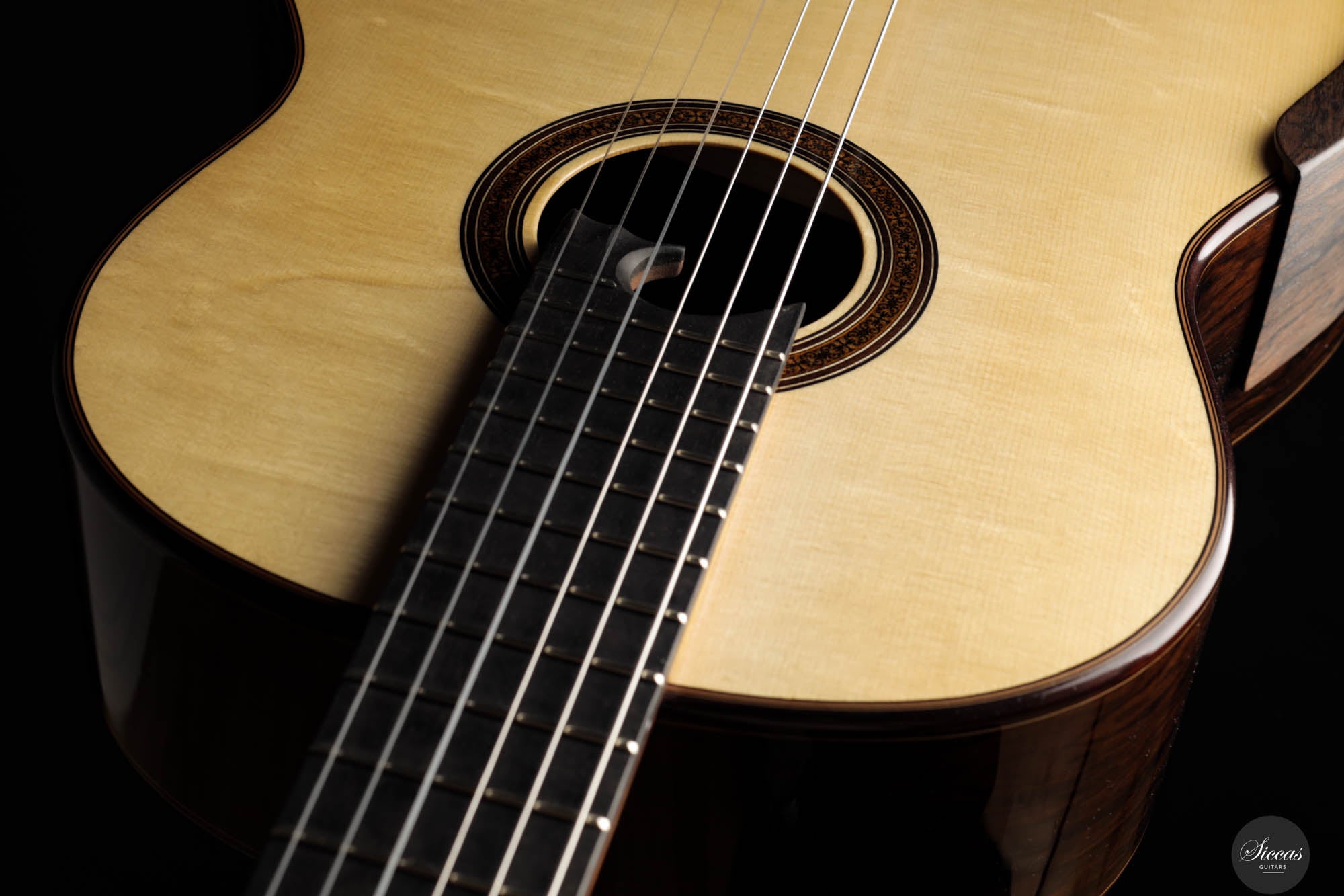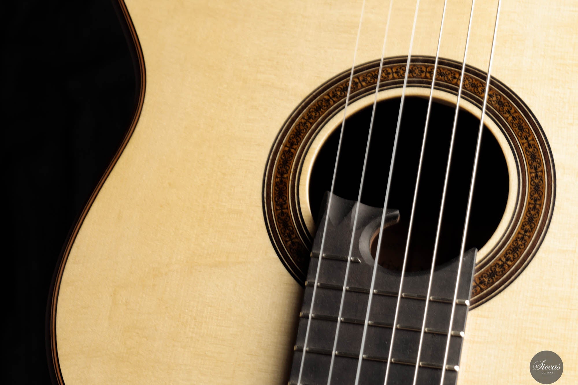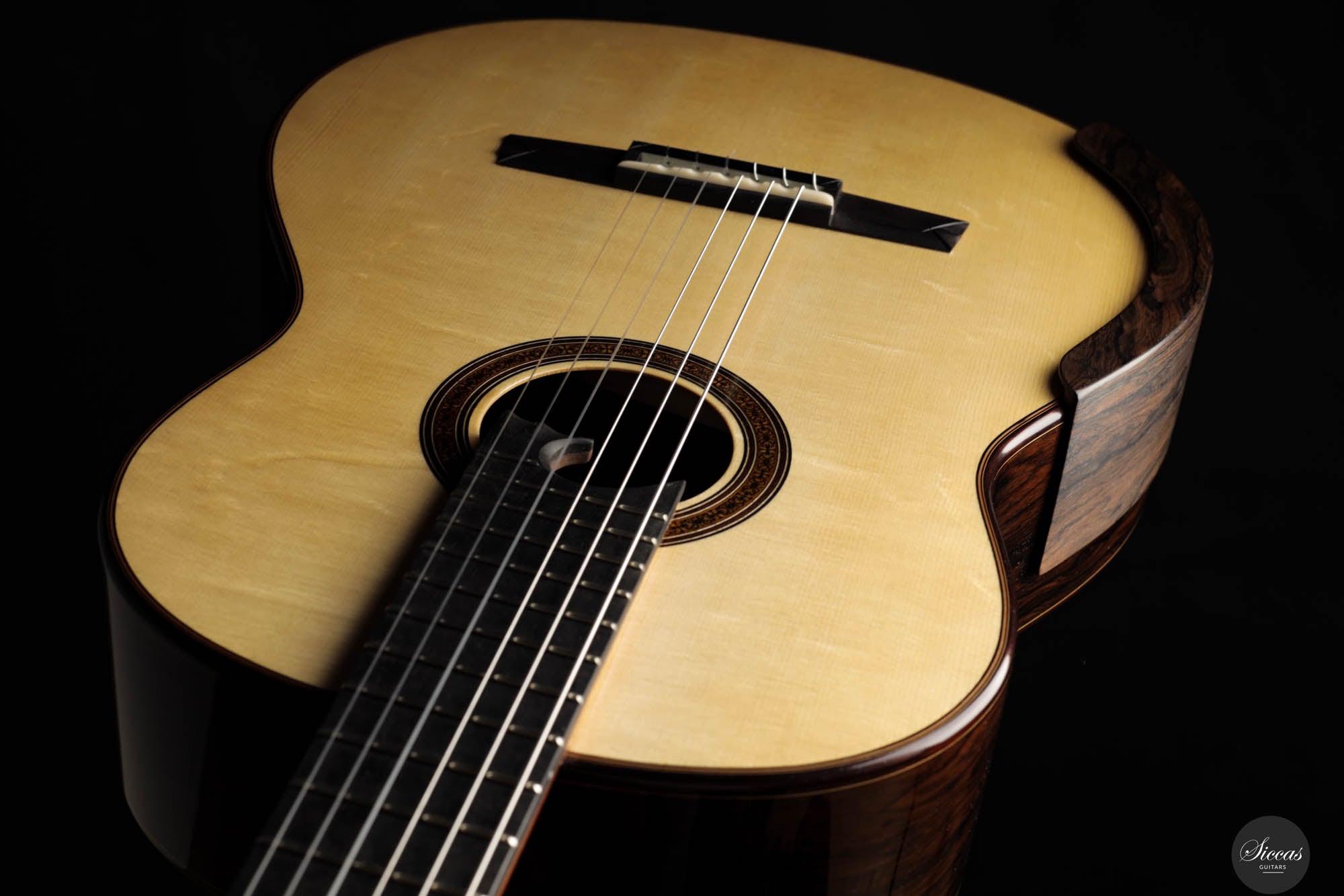 Diese brandneue Gitarre präsentiert sich als ein Paradebeispiel für ein Konzertinstrument, das sorgfältig gefertigt wurde, um den Anforderungen jeder Aufführungssituation gerecht zu werden. Sie steht als Zeugnis für Kraft und Präzision und bietet die Gewissheit eines ausreichenden Volumens, um Konzertsäle zu füllen und das Publikum zu fesseln. Neben ihrem robusten Klang ist diese Gitarre mit Blick auf den Komfort des Spielers konzipiert, mit einer leichten Spielbarkeit, die auch während der intensivsten Auftritte eine entspannte Haltung ermöglicht. Die Kombination einer Fichtendecke mit Ziricote-Rücken und -Seiten, die mit größter Sorgfalt für höchste Qualität ausgewählt wurden, trägt zum außergewöhnlichen Klang des Instruments bei. Der Bau der Gitarre zielt nicht nur auf ästhetische Schönheit ab, sondern verbessert auch ihre akustischen Fähigkeiten, um sicherzustellen, dass die Klarheit ihrer Höhen selbst in den komplexesten polyphonen Kompositionen durchscheint.