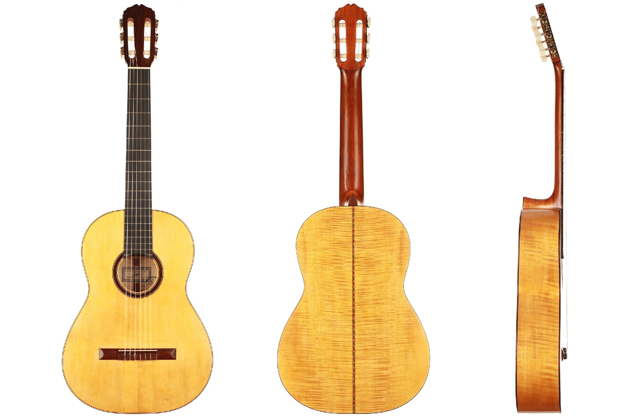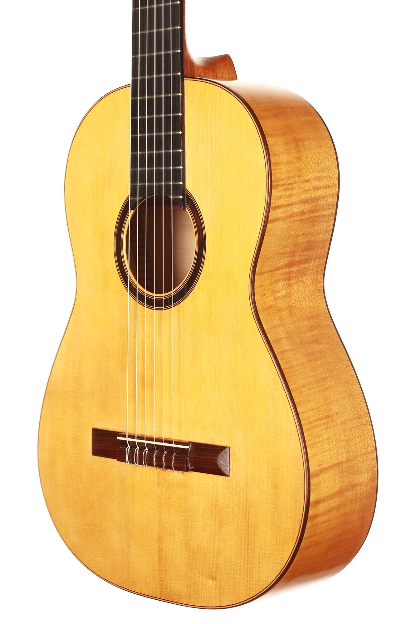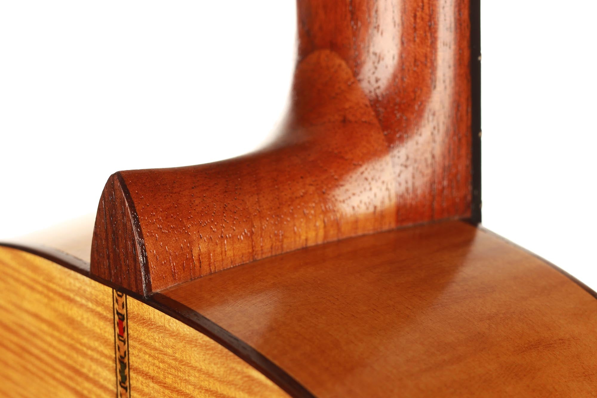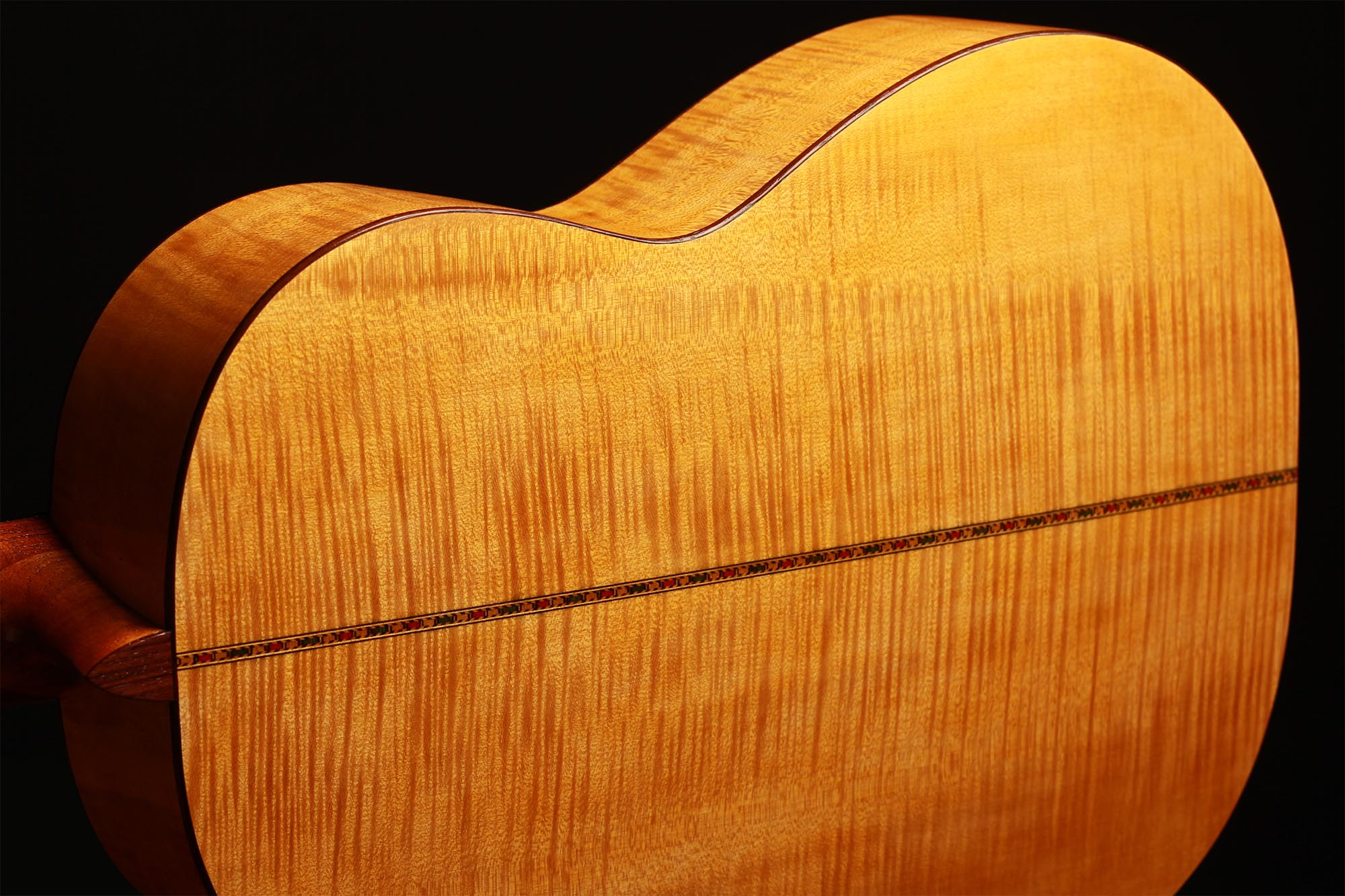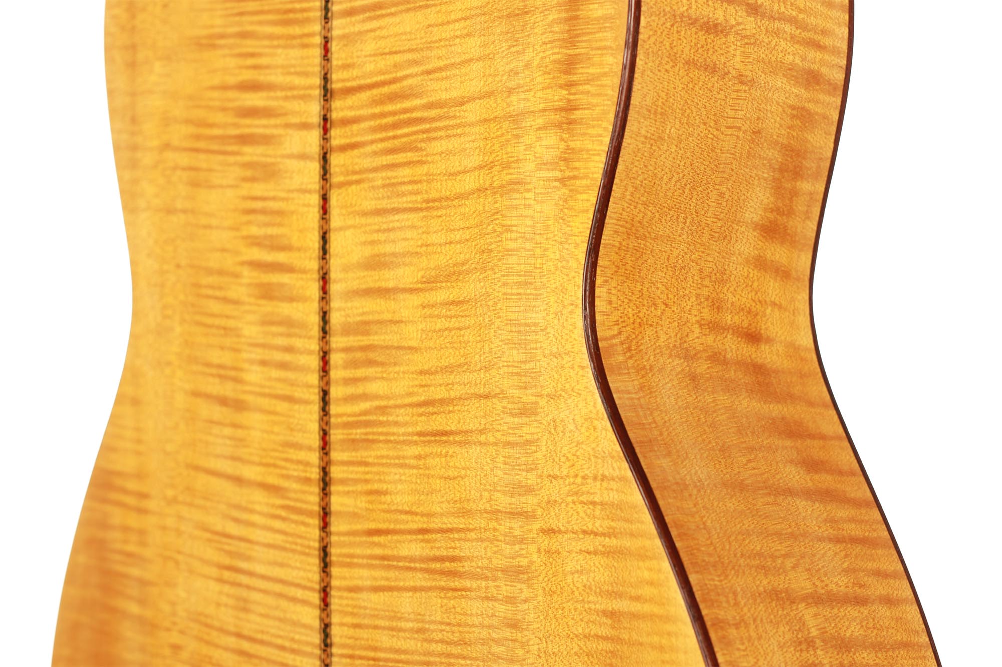 This guitar is a Santos Hernandez inspired model with a compact body size and short scale length. The label is a tribute to Santos Hernandez, with an adapted copy of the master's label. Its smaller size and lightweight remind of the “Señorita” models built in Spain during the 19th and beginning of the 20th century. This fine maple guitar has a huge sound, it is very spontaneous with great lyrical charm in the trebles and deep basses. It is the perfect guitar for a player looking for a short scale instrument, which not only meets high demands but also offers a great comfort.