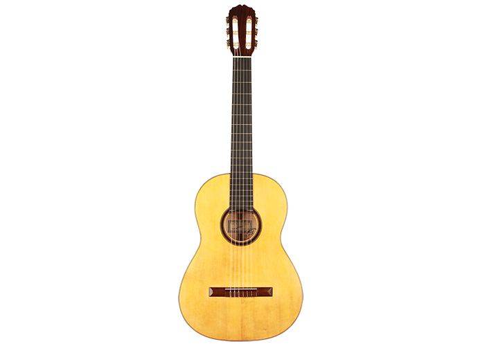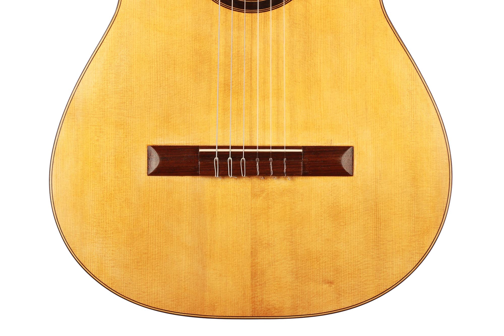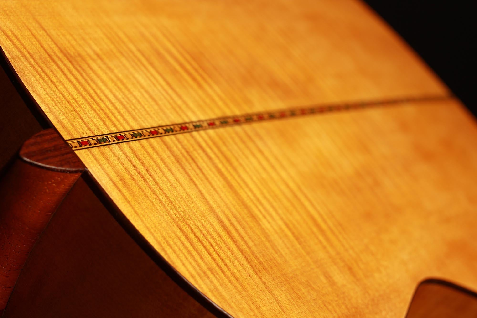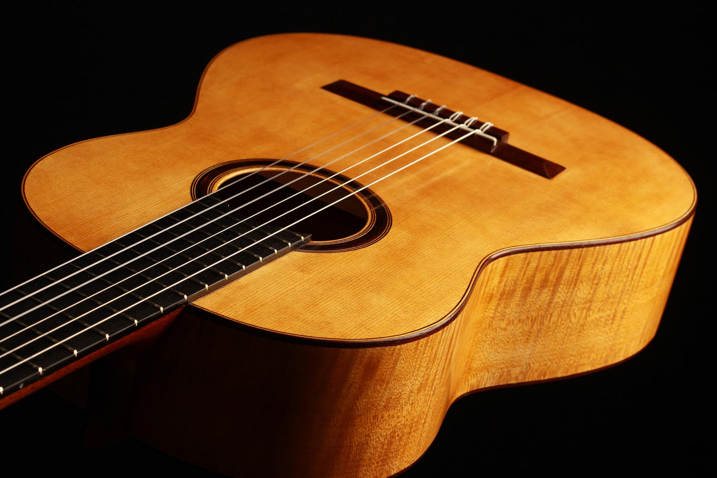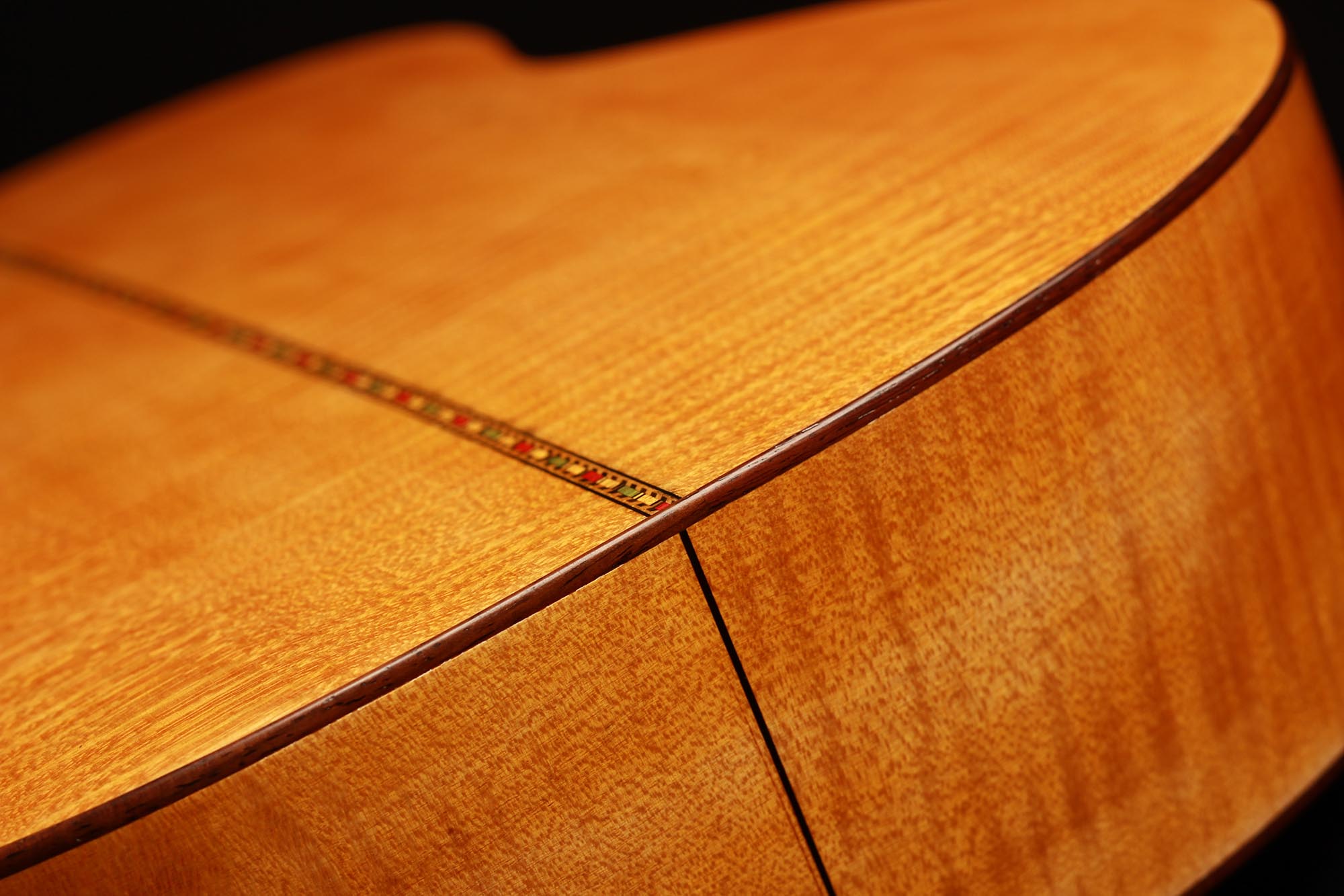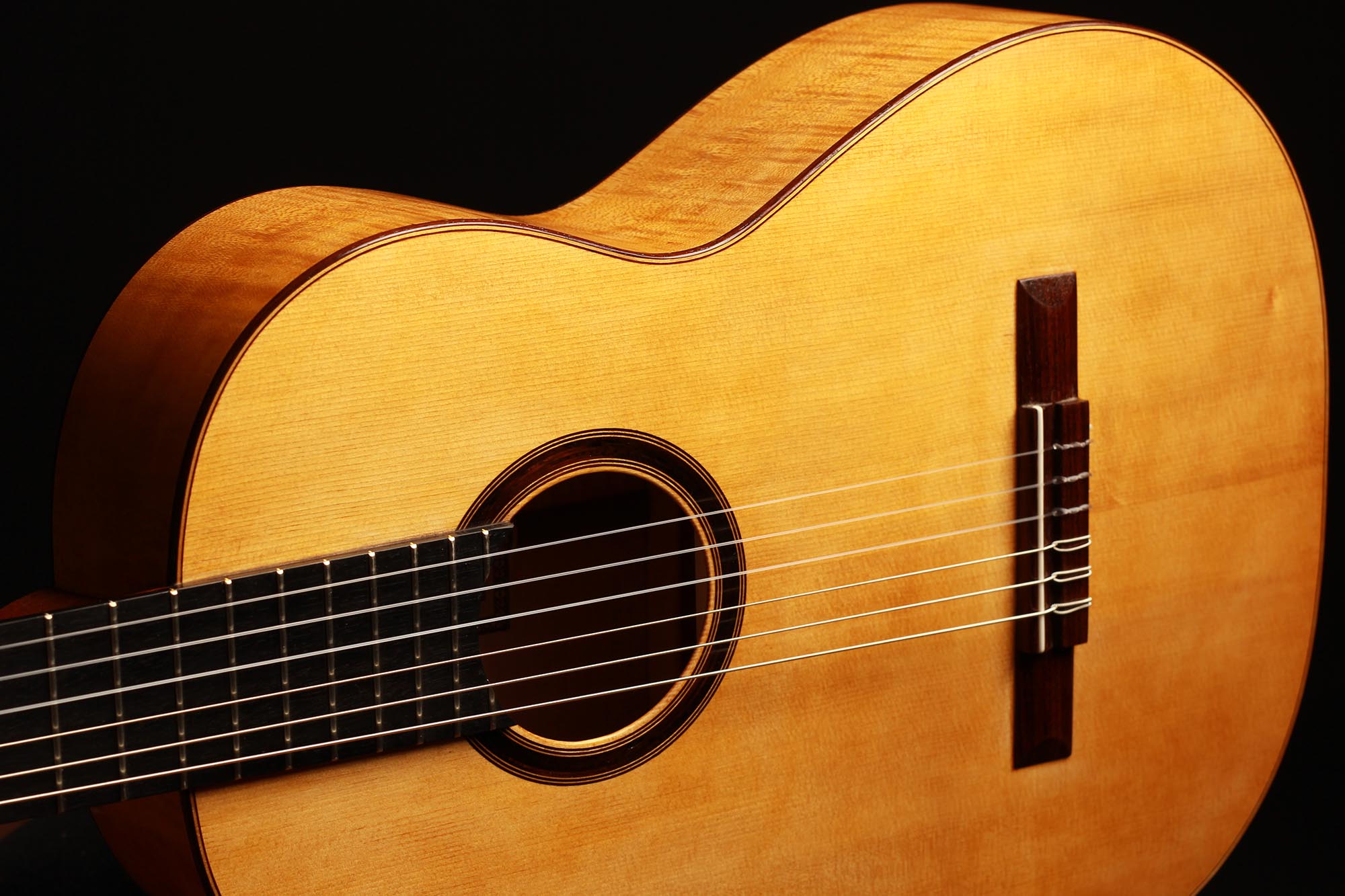 This guitar is a Santos Hernandez inspired model with a compact body size and short scale length. The label is a tribute to Santos Hernandez, with an adapted copy of the master's label. Its smaller size and lightweight remind of the “Señorita” models built in Spain during the 19th and beginning of the 20th century. This fine maple guitar has a huge sound, it is very spontaneous with great lyrical charm in the trebles and deep basses. It is the perfect guitar for a player looking for a short scale instrument, which not only meets high demands but also offers a great comfort.