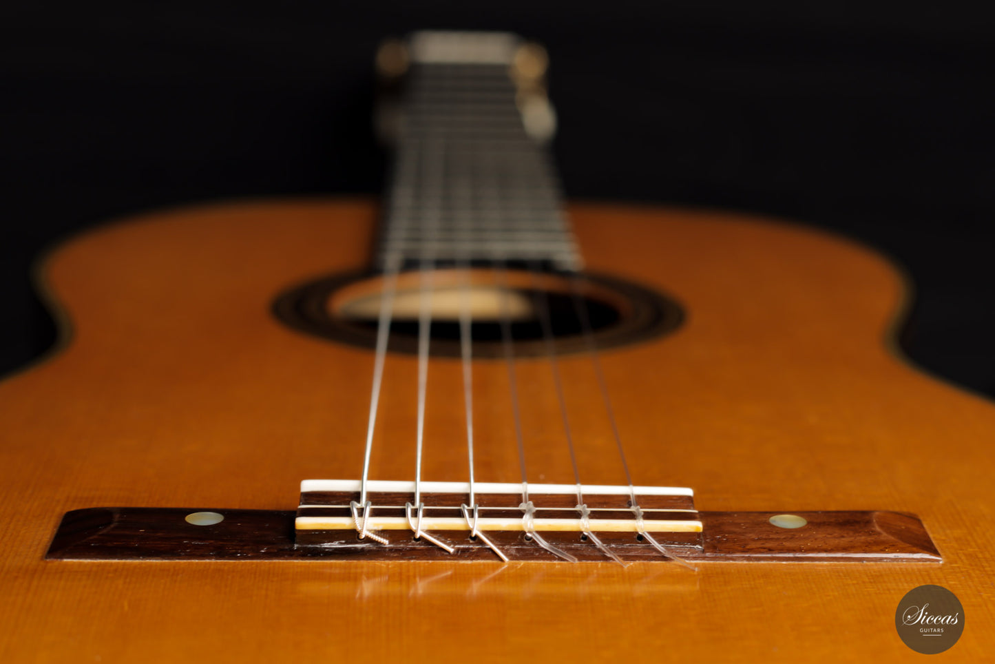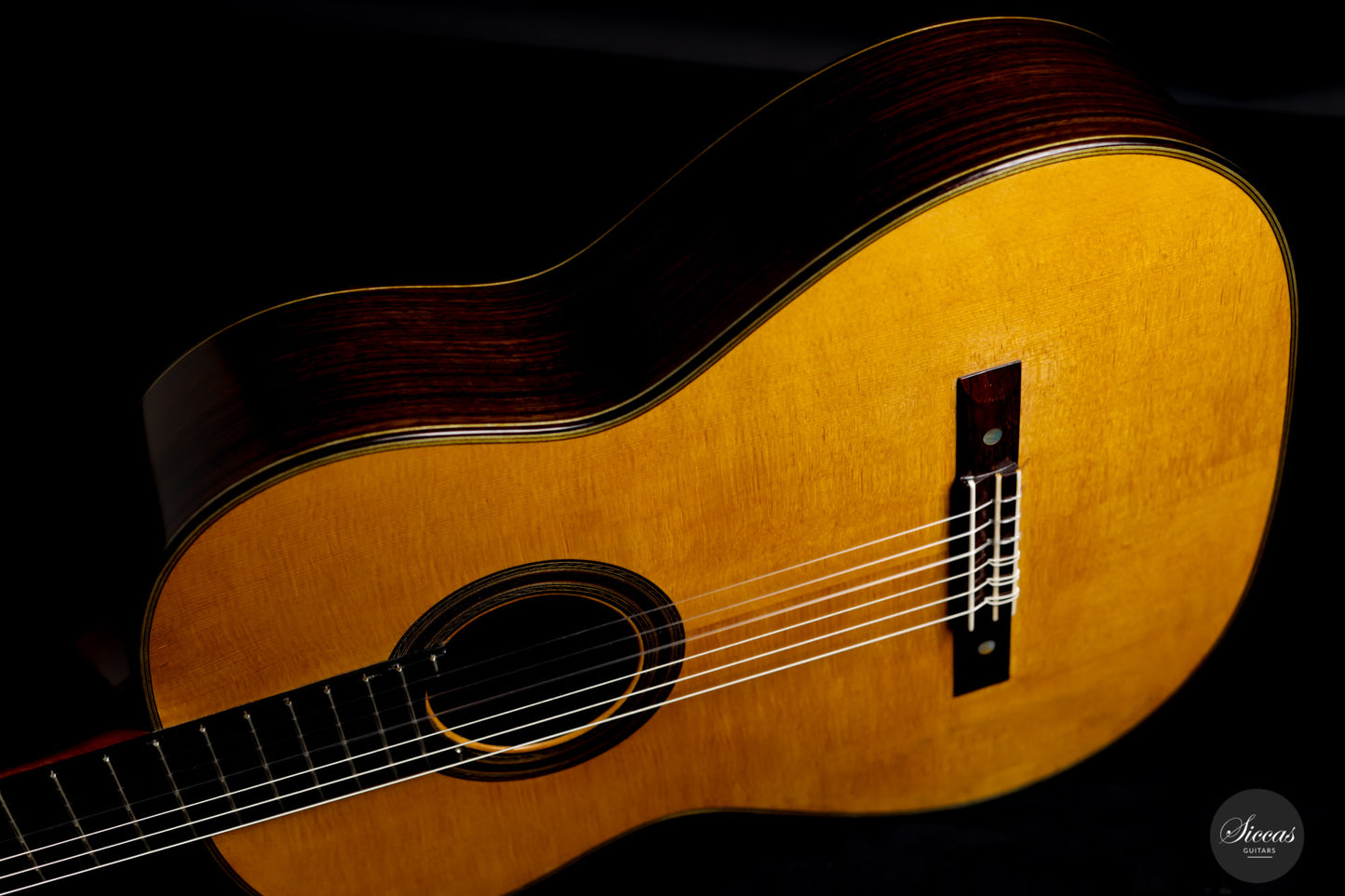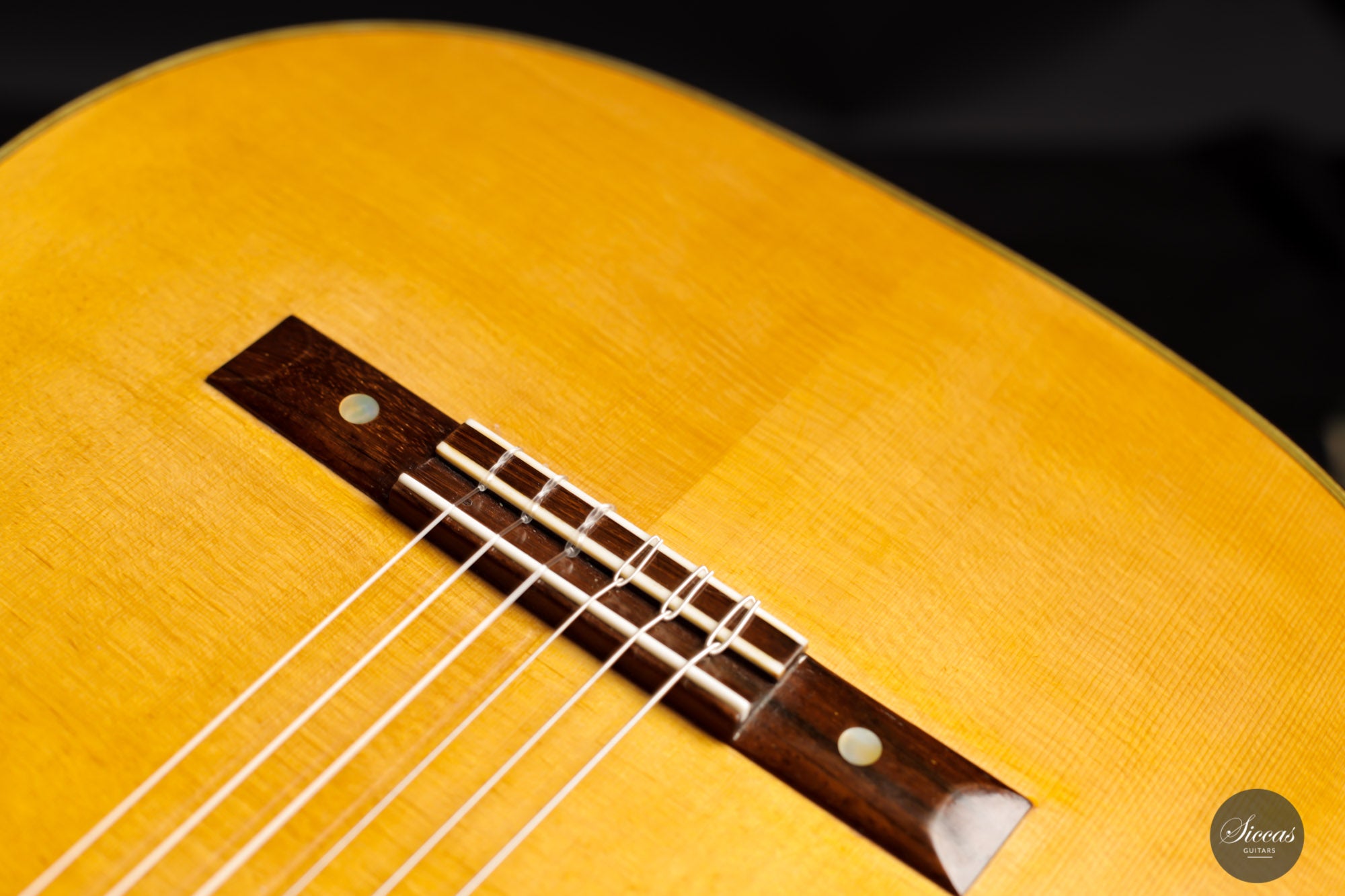 Boden und Zargen dieser Replika einer Gitarre von 1947 von einem der bekanntesten deutschen Gitarrenbauern des 20. Jahrhunderts sind aus indischem Palisander und die Decke aus einer wunderschönen Haselfichte gefertigt. Allein die Ästhetik der Hölzer ist bereits beeindruckend, aber auch die klanglichen Eigenschaften dieser Schäfer Gitarre sind äußerst faszinierend. Die erste Saite klingt wunderbar klar und präsent, mit einem langem Sustain und toller Strahlkraft. Die Bässe klingen warm und tragend und die einzelnen Töne lassen sich hervorragend formen. Die hochwertigen Mechaniken von Schaller passen hervorragend zum Gesamtbild dieser traditionell gebauten Gitarre und sorgen für eine perfektes und leichtgängiges Stimmen. Insgesamt befindet sich die Gitarre in einem sehr guten Zustand.