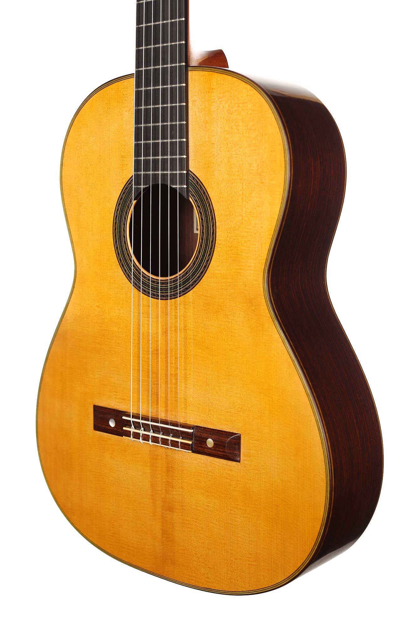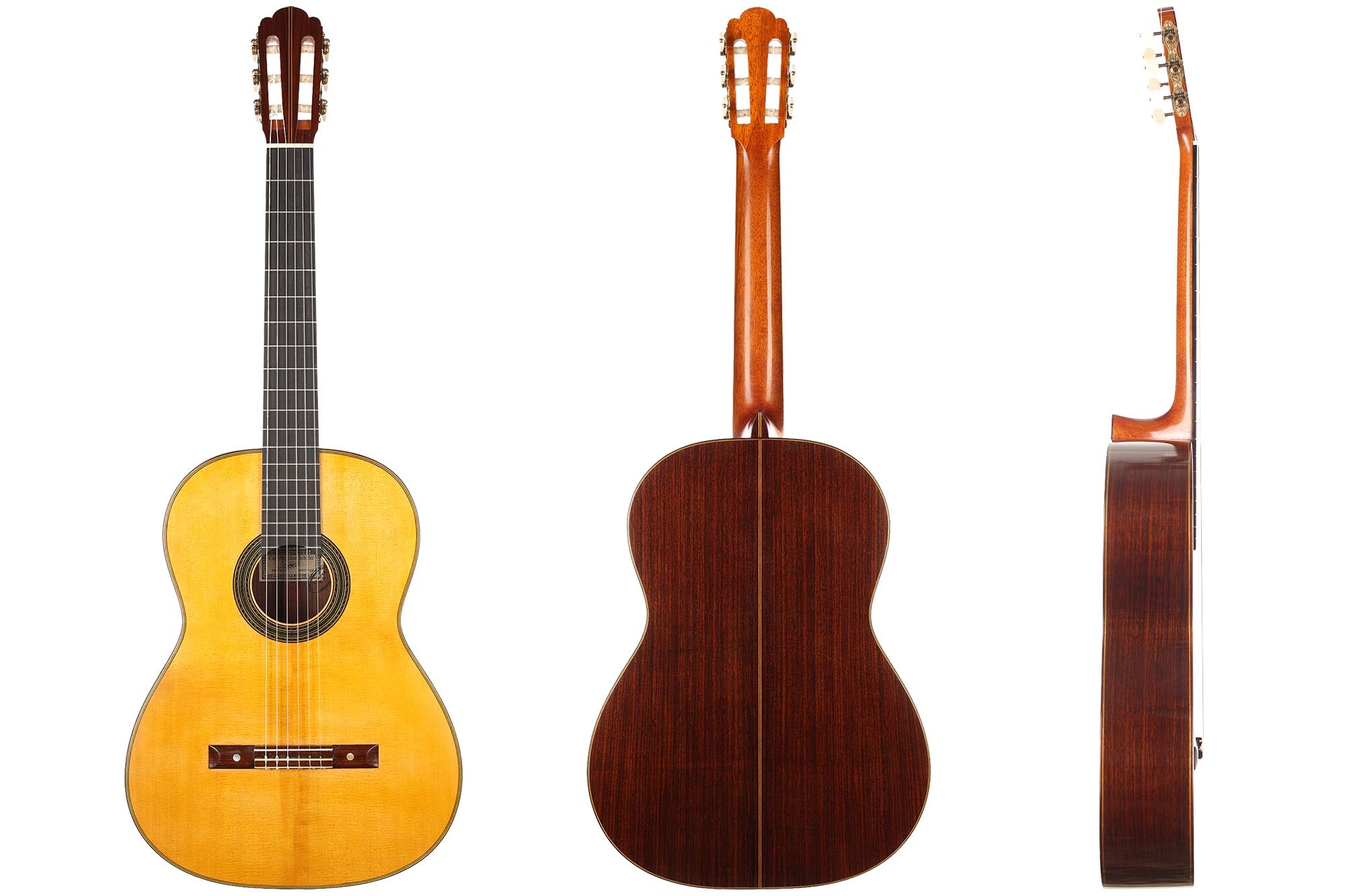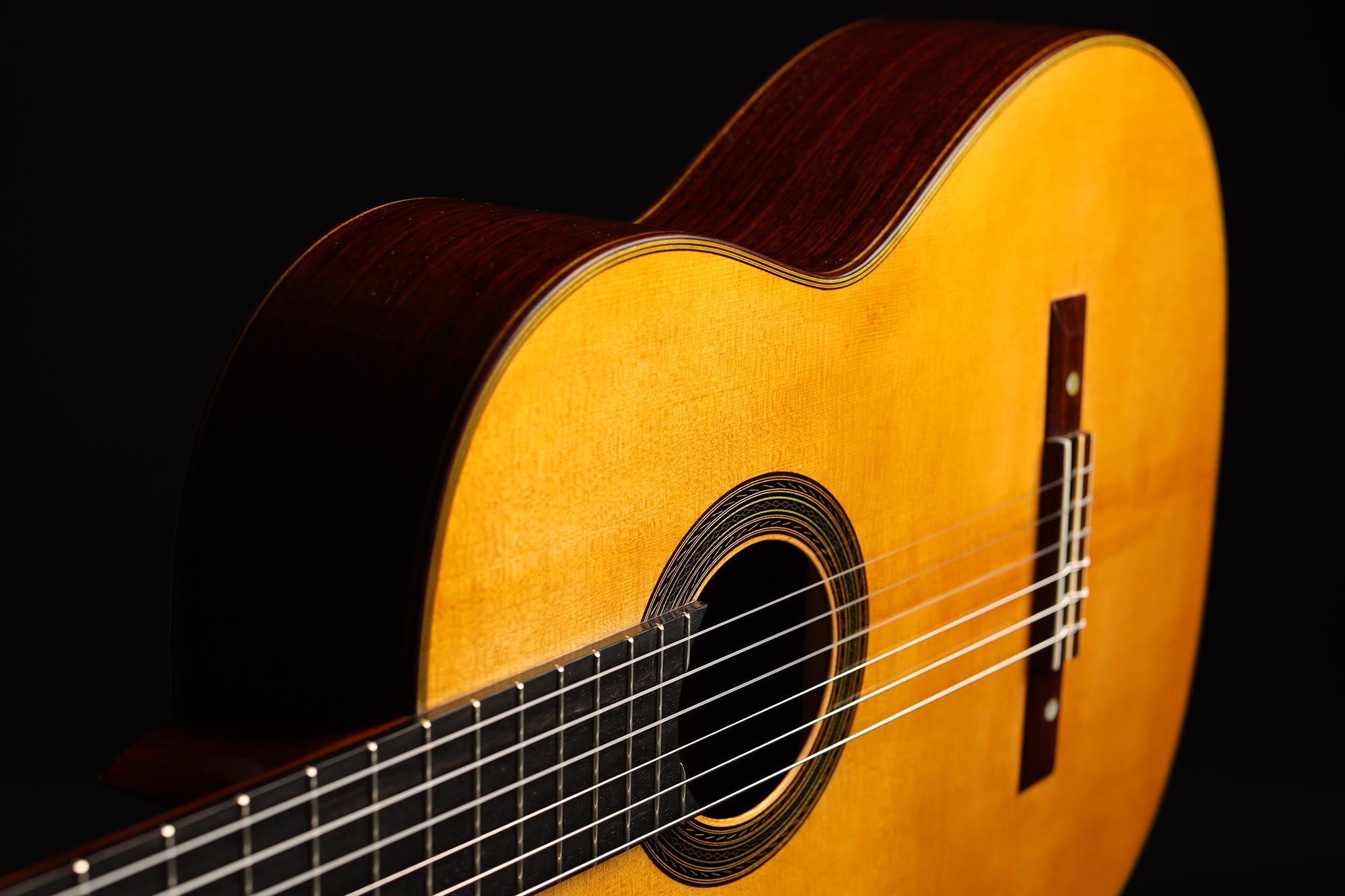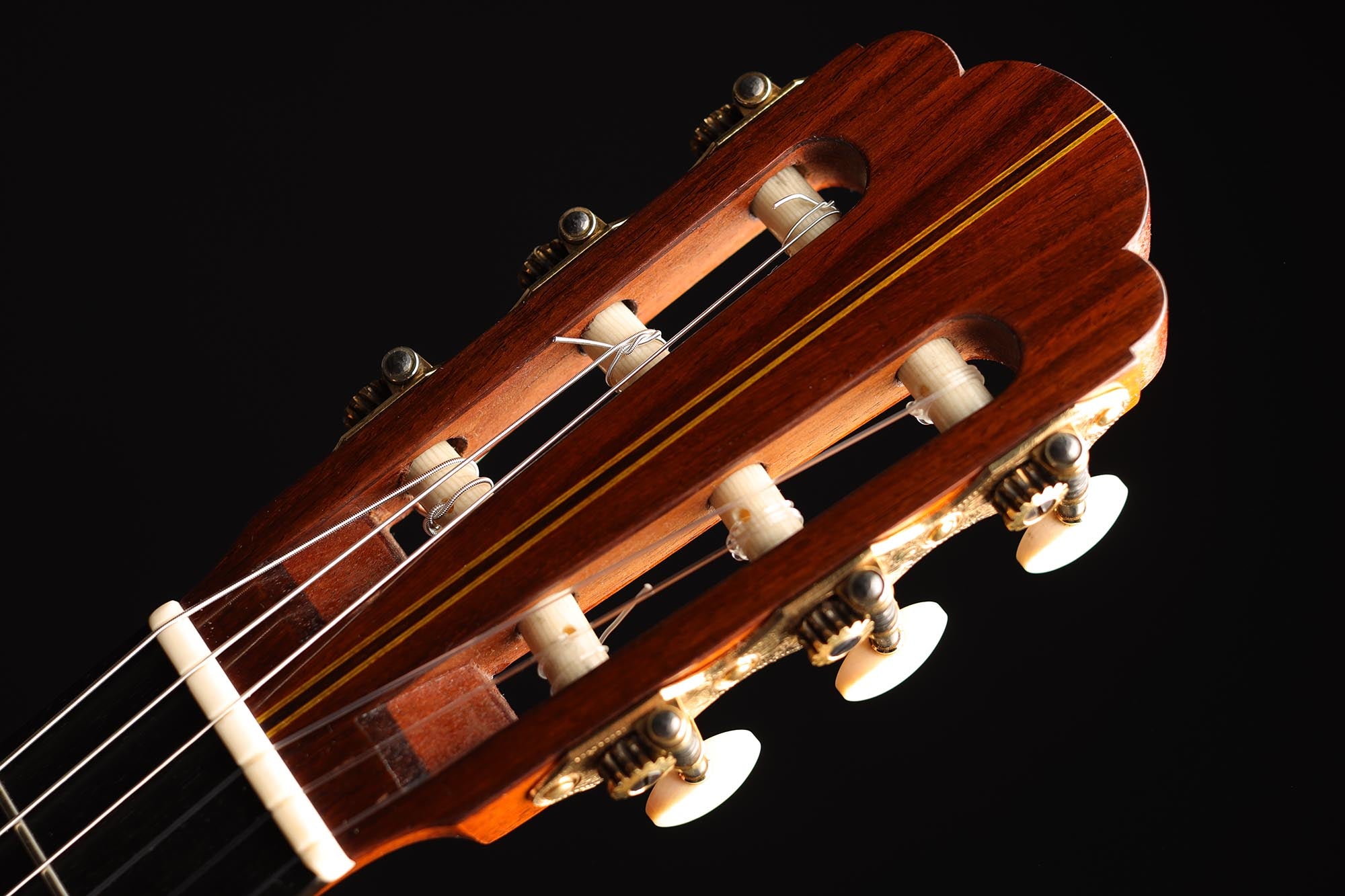 Diese Gitarre hat eine wunderbare Decke aus deutscher Fichte sowie über einen Boden und Zargen aus herrlichem indischen Palisander. Außerdem ist die sehr markante Verzierung am Steg sofort erkennbar und verleiht dieser Gitarre ein sehr charakteristische Aussehen. Obwohl die Mechaniken von Reischl fast 50 Jahre alt sind, wurden sie weder auf einer Gitarre montiert noch gebraucht und sind praktisch neu. Schließlich ist die Rosette aus sehr dunkler Intarsienarbeit mit grünen Randeinlagen wieder ein sehr schönes Faksimile des Originals. Der Zustand dieser Gitarre ist ausgezeichnet, mit nur wenigen oberflächlichen Spielspuren auf der Decke.