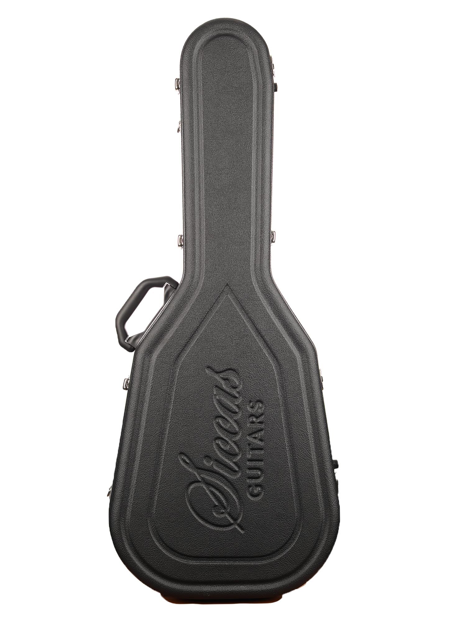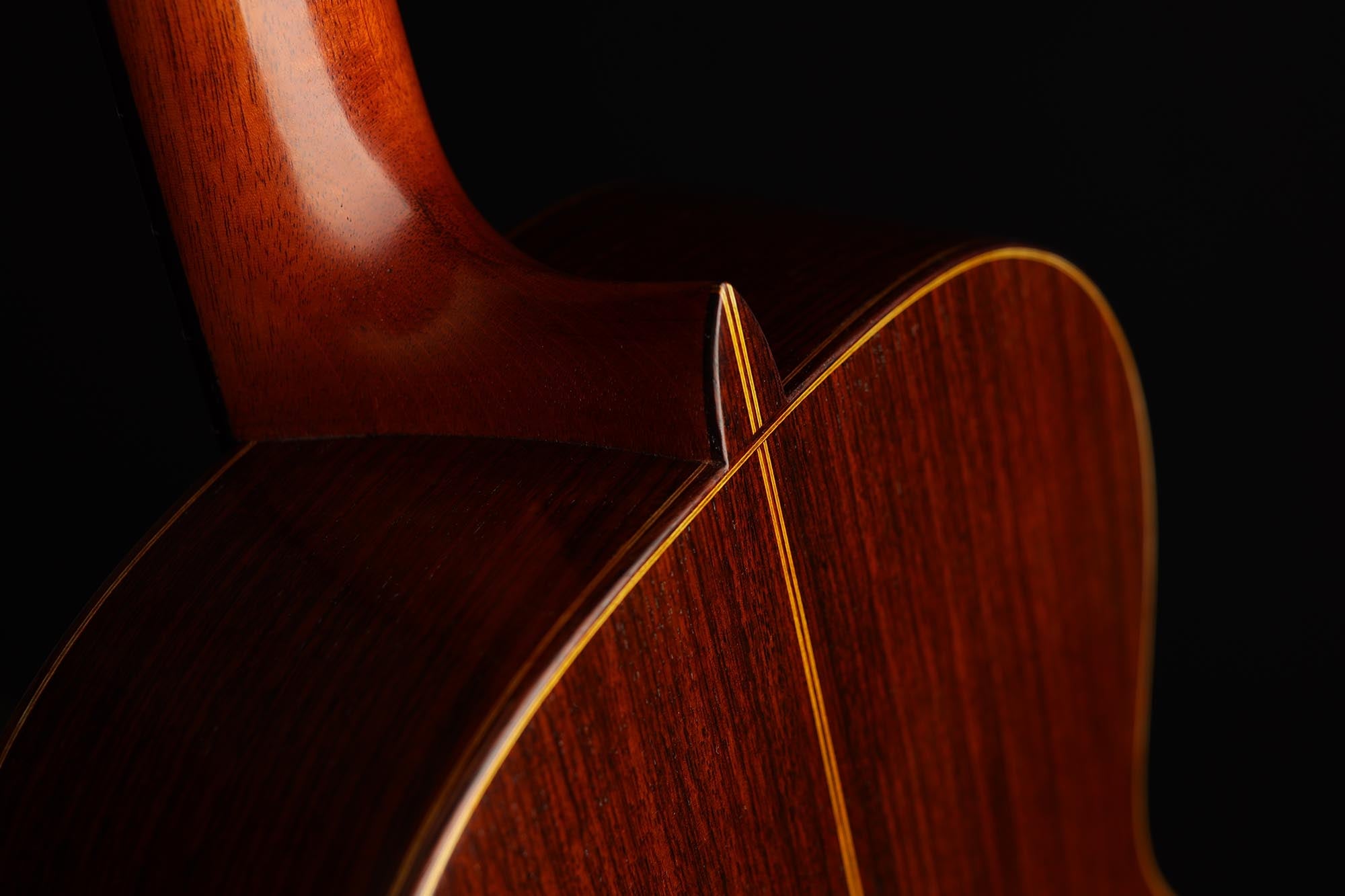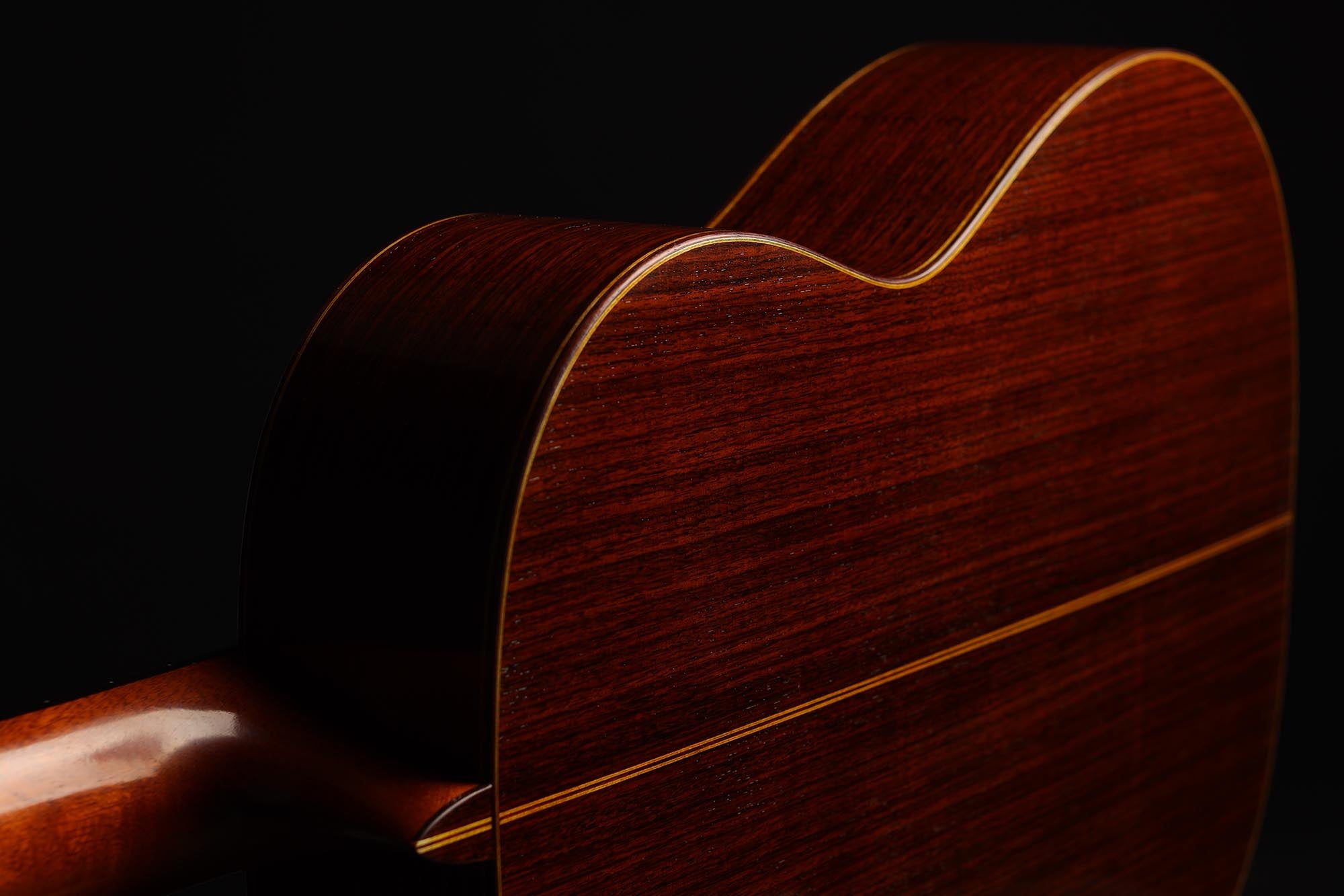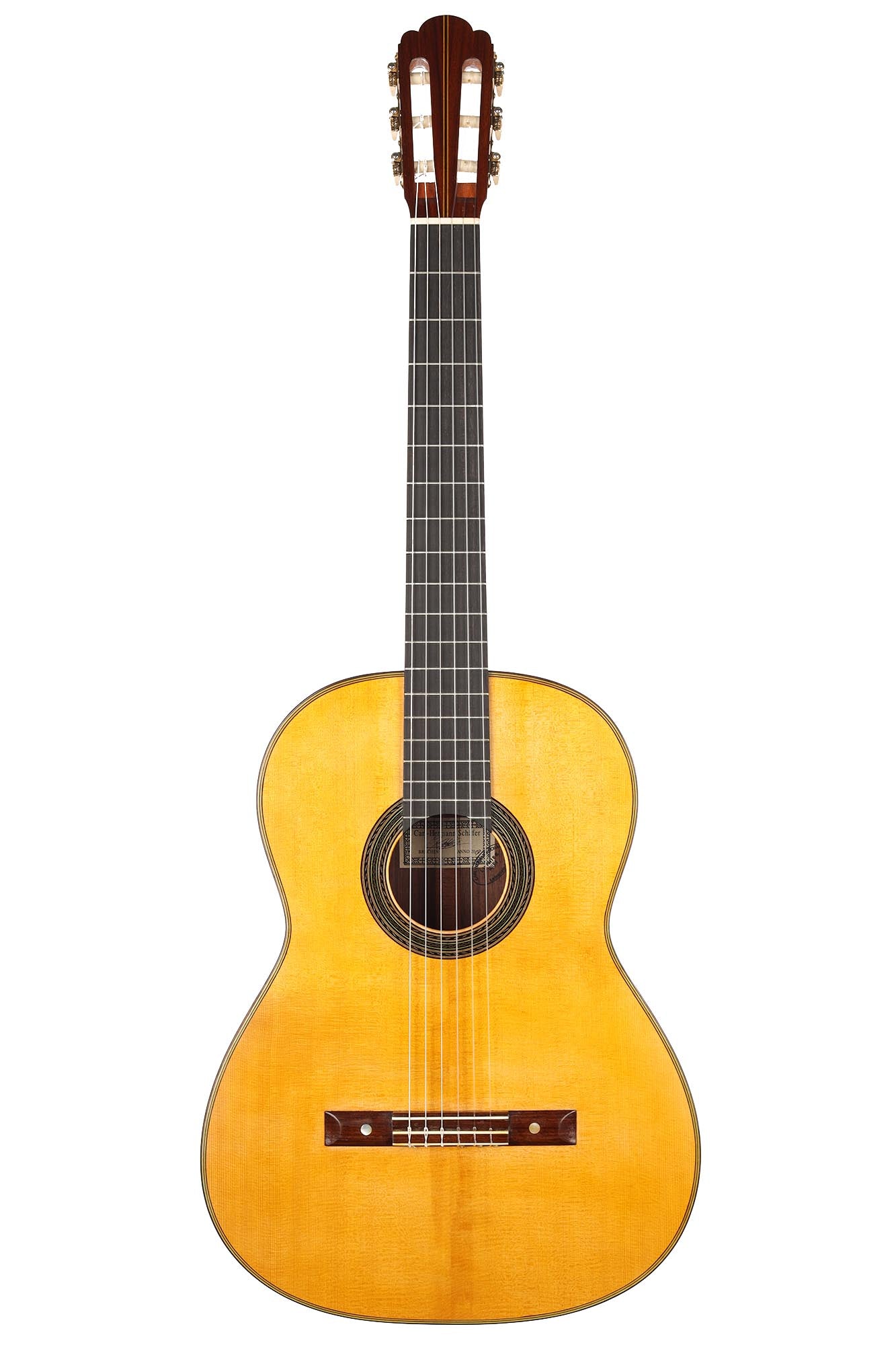 Diese Gitarre hat eine wunderbare Decke aus deutscher Fichte sowie über einen Boden und Zargen aus herrlichem indischen Palisander. Außerdem ist die sehr markante Verzierung am Steg sofort erkennbar und verleiht dieser Gitarre ein sehr charakteristische Aussehen. Obwohl die Mechaniken von Reischl fast 50 Jahre alt sind, wurden sie weder auf einer Gitarre montiert noch gebraucht und sind praktisch neu. Schließlich ist die Rosette aus sehr dunkler Intarsienarbeit mit grünen Randeinlagen wieder ein sehr schönes Faksimile des Originals. Der Zustand dieser Gitarre ist ausgezeichnet, mit nur wenigen oberflächlichen Spielspuren auf der Decke.