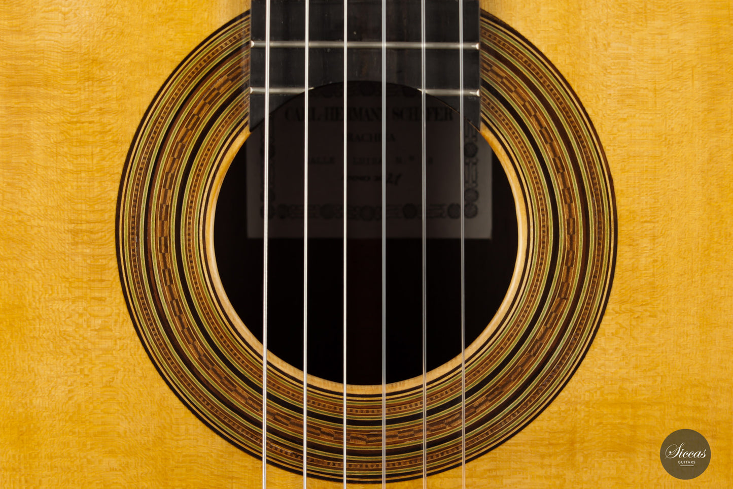 Faithful copies of Antonio de Torres’ instruments are rare and extremely demanding for guitar builders. This guitar built by Carl-Hermann Schäfer is a true gem of lutherie and a splendid facsimile of the SE 116 “La Italica” guitar built by Antonio de Torres in 1888. The degree of refinement of this guitar is astonishing. Especially the inlays of the rosette are of impressive precision and delicacy, and the top is an excellent piece of spruce with an antique vintage look. The label is a fine interpretation of the original and a beautiful homage to the work of the “father of the modern classical guitar”. The Scheller machine heads are also a perfect match for the overall look of this Carl-Hermann Schäfer guitar.