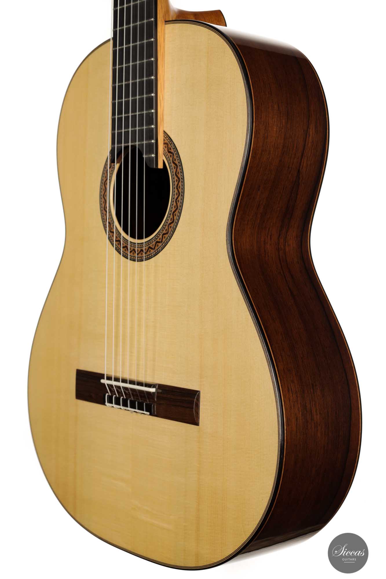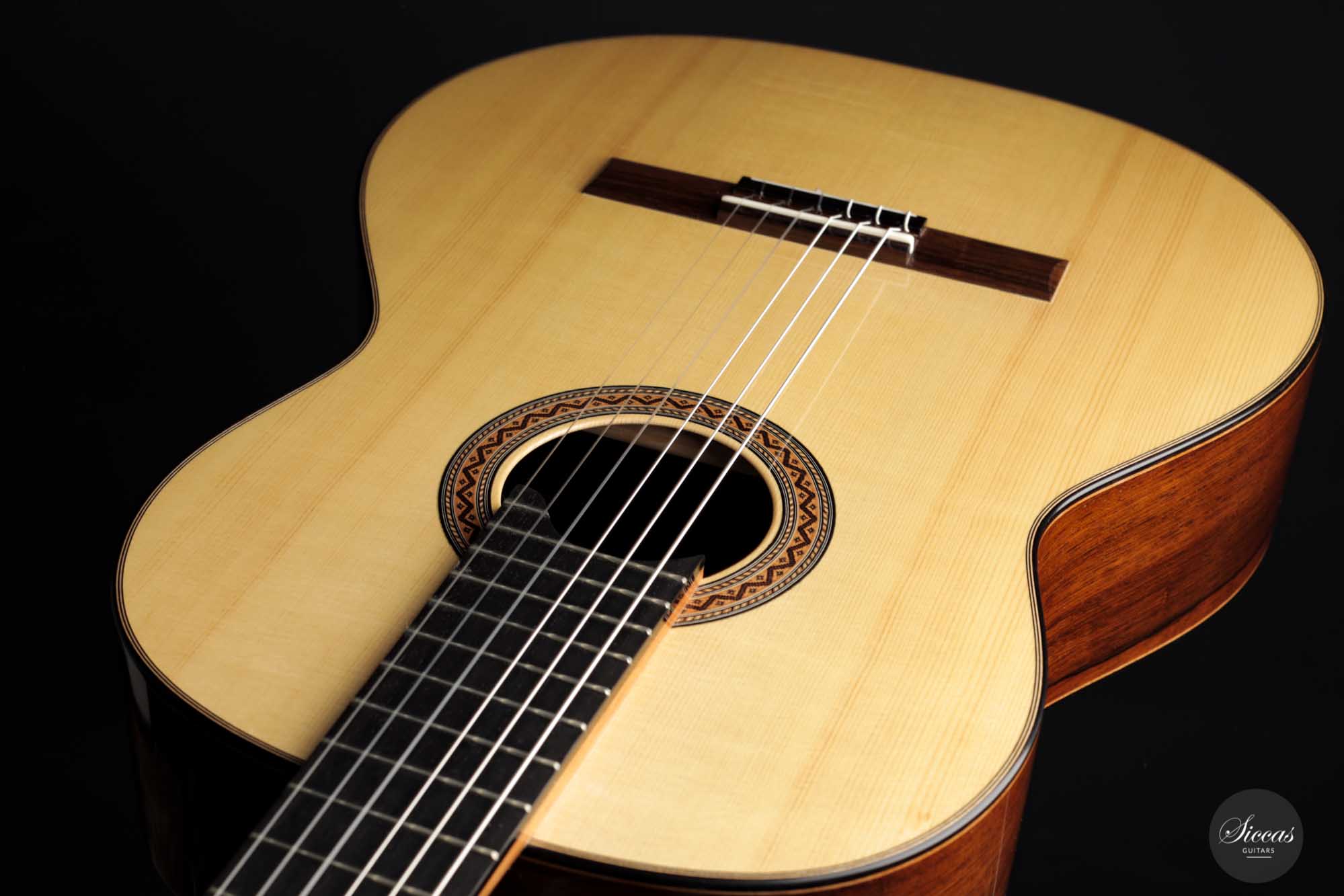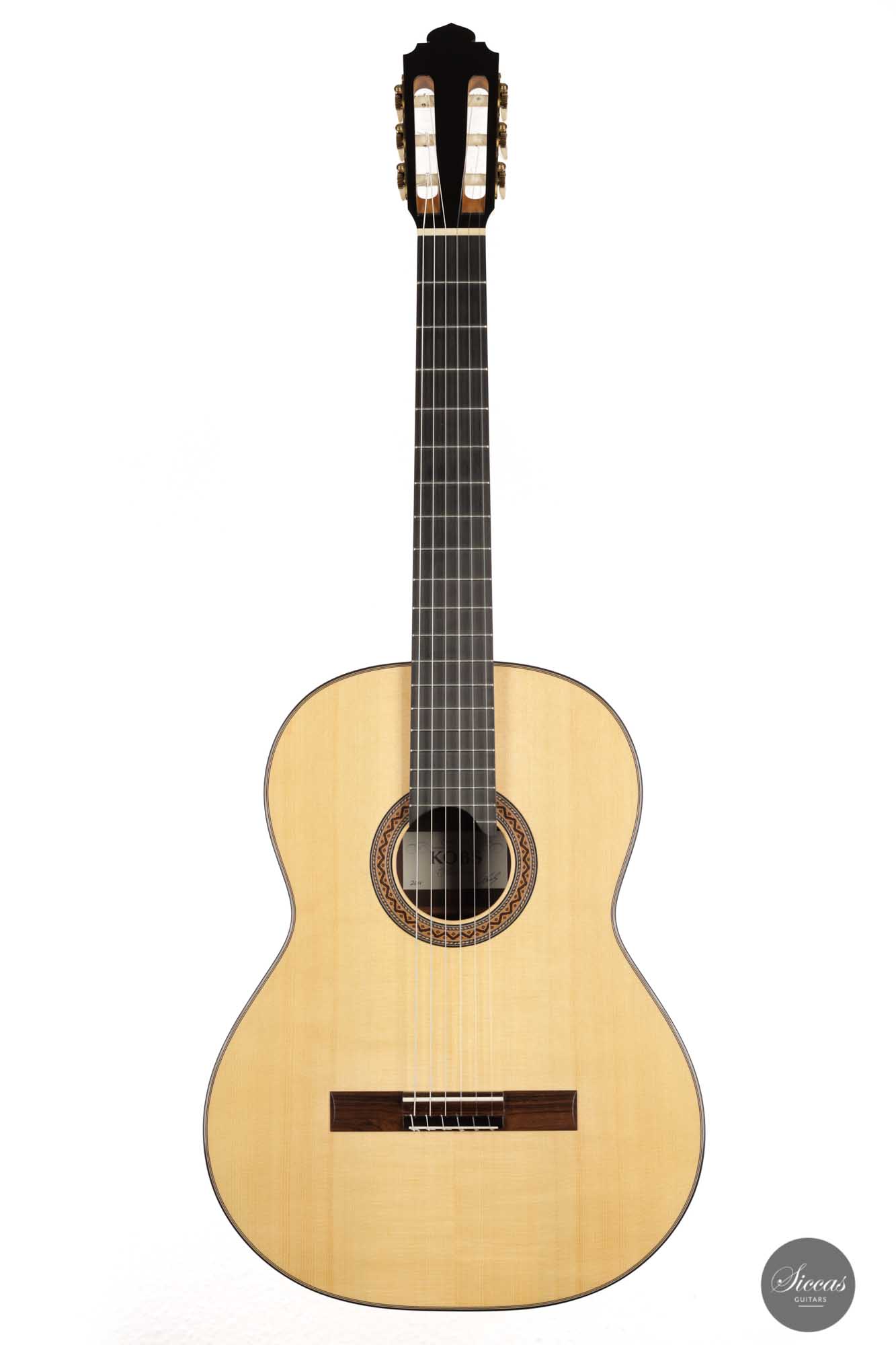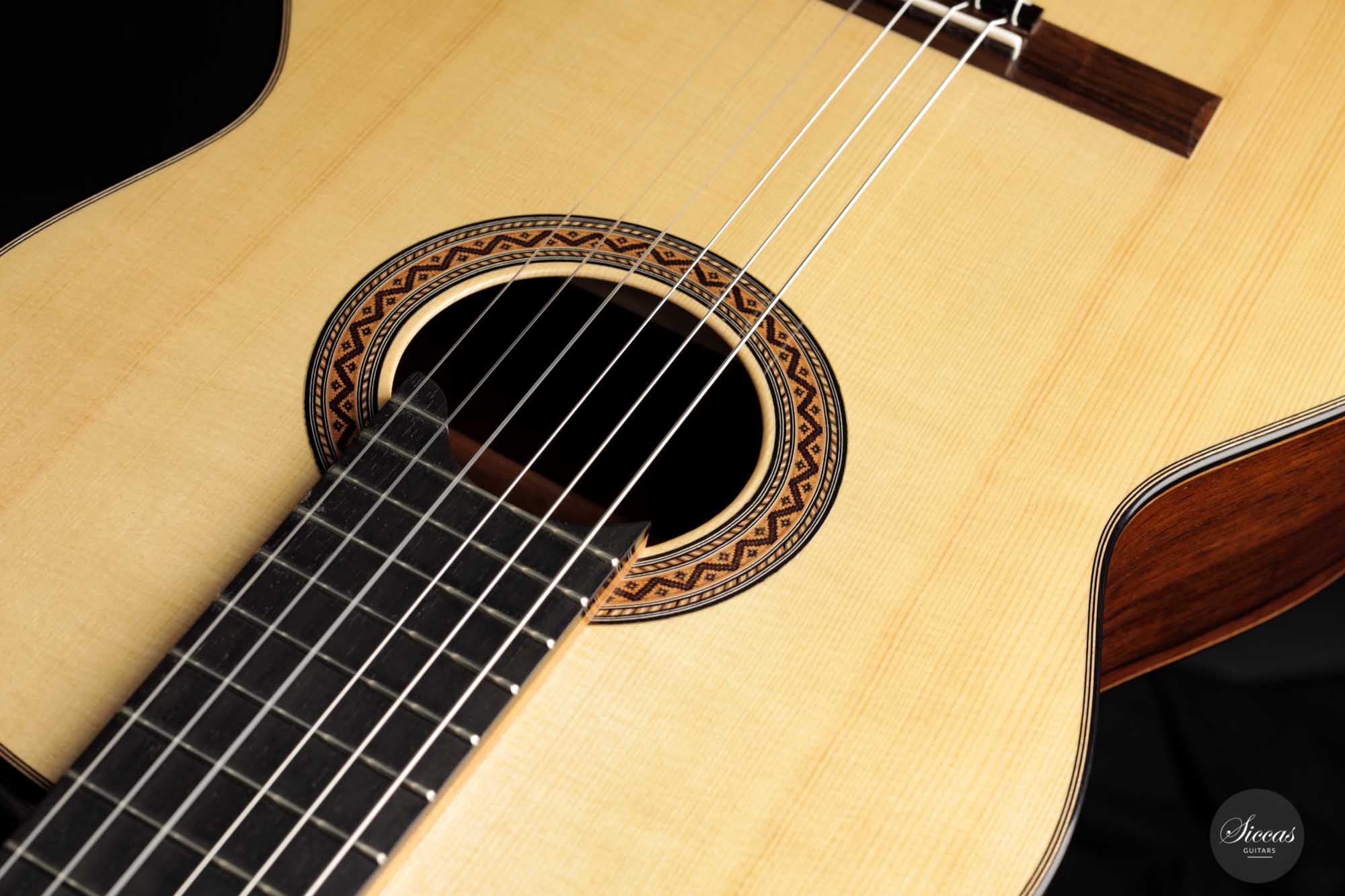 Die Gitarre ist etwas ganz Besonderes, denn die Decke besteht Außen aus Fichte, im Inneren aus Zedernholz und besitzt eine traditionelle Fächerbeleistung. Dadurch entwickelt sie einen einzigartigen Klang, der sowohl präzise als auch warm, kraftvoll, facettenreich und gehaltvoll ausfällt. Darüber hinaus ist die Bespielbarkeit ideal, und die hochwertigen Scheller-Mechaniken unterstreichen den Wert dieser inspirierenden Gitarre.