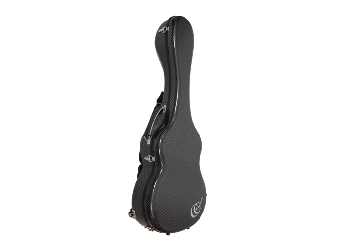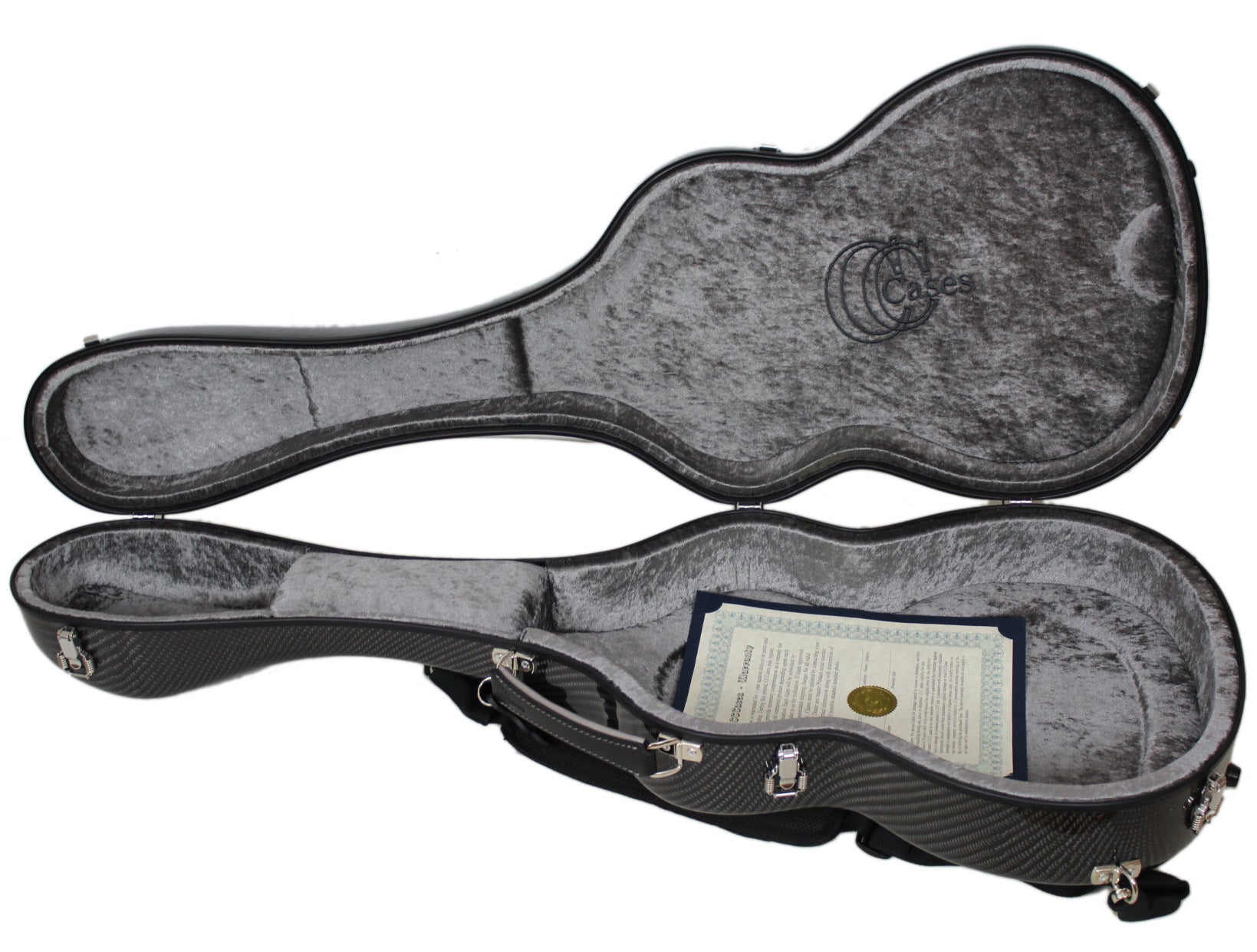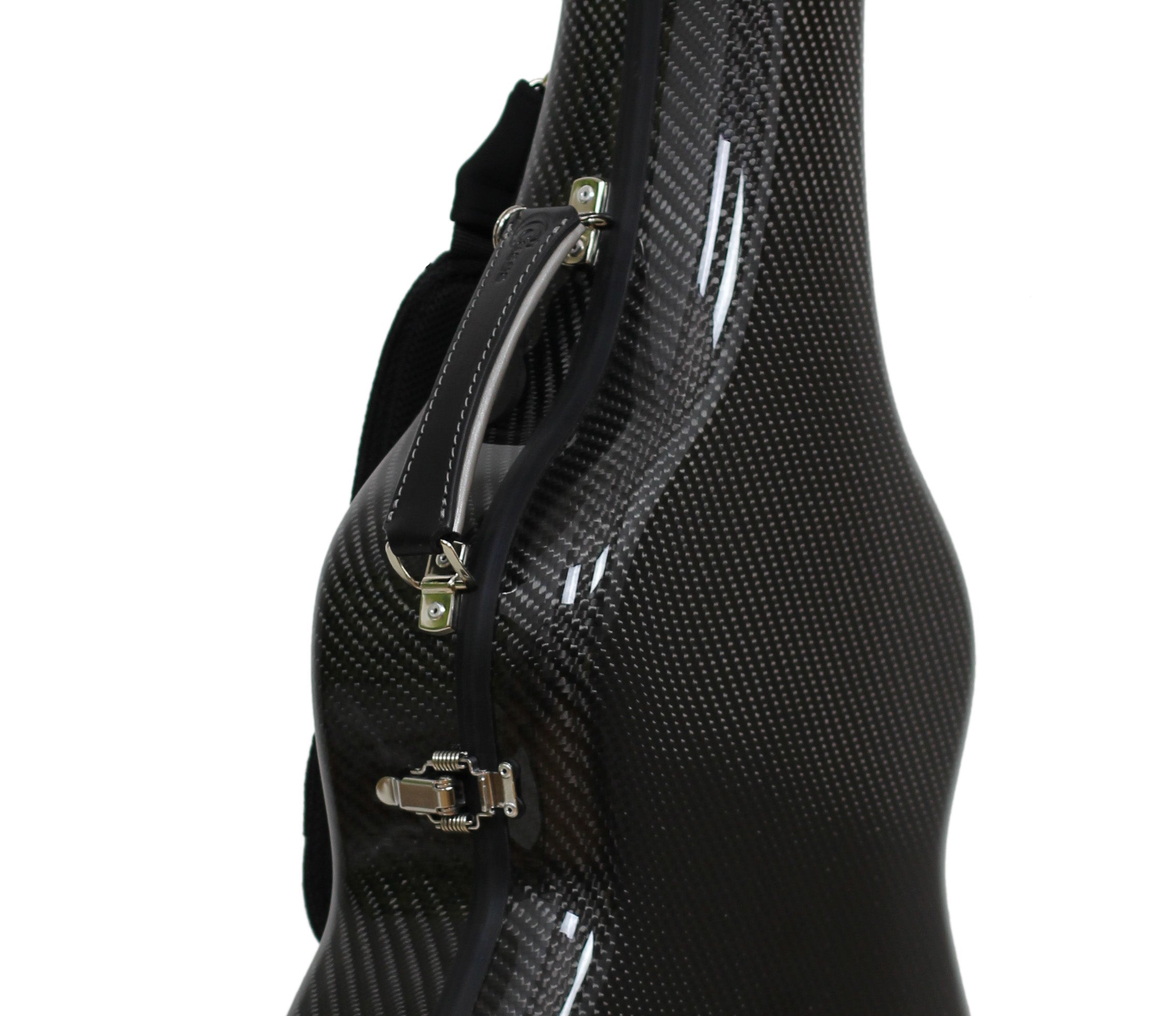 Carbon fiber case with gloss finish, Genuine leather hand-made handle, comfortable shoulder straps, High quality interior velvet padding, Interior Storage/string box, Certificate of authenticity.