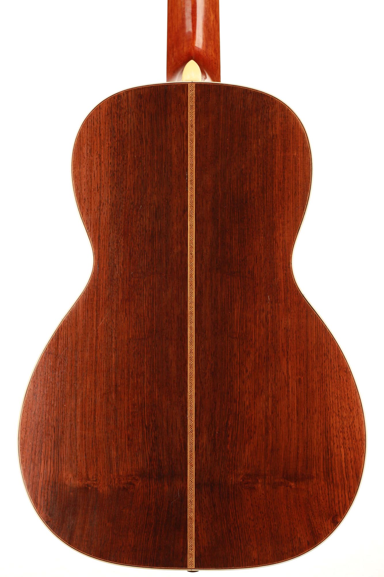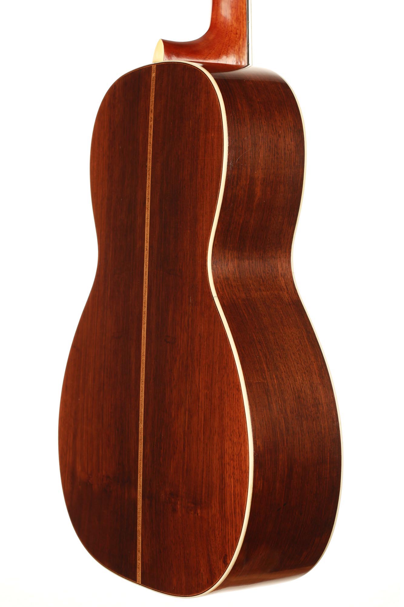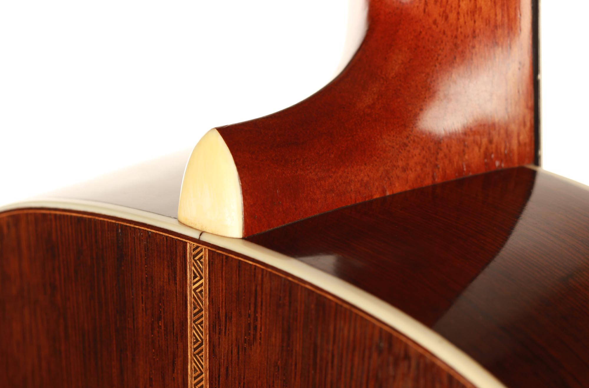 Dieses Instrument befindet sich in einem ausgezeichneten Zustand. Es hat zwei reparierte Risse unter dem Steg und einen sehr dünnen Riss auf der Rückseite. Die Qualität der verwendeten Materialien ist bemerkenswert. Die Wirbel sind original und aus Elfenbein gefertigt, wie viele andere Elemente des Instruments. Der Boden und die Zargen sind aus einem atemberaubenden südamerikanischen Palisander mit einer sehr engen und geraden Maserung gefertigt. Diese Gitarre ist ein außergewöhnliches Musikinstrument und ein sehr seltenes Sammlerstück.