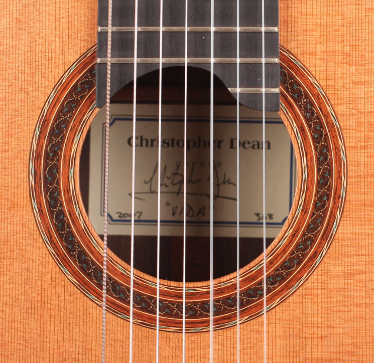 Christopher Dean wurde in 1958 in Lincoln, England, geboren. Im Alter von 17 Jahren baute er sein erstes Instrument. 1985 eröffnete er seine eigene Werkstatt in Cotswolds und konnte sich eine weltweite Kundschaft aufbauen. Seine Gitarren sind nicht nur wunderschön gebaut, sondern auch die Klangeigenschaften überzeugen durch Klarheit, Sustain und Brillanz. Diese Sonderanfertigung mit sieben Saiten hat eine Zederndecke und Boden/Zargen sind aus indischem Palisander. Veredelt wurde die Gitarre mit einer Schellackhandpolitur. Die Mechaniken sind von Sloane/Rodgers. Inklusive Hiscox Pro II Koffer.
