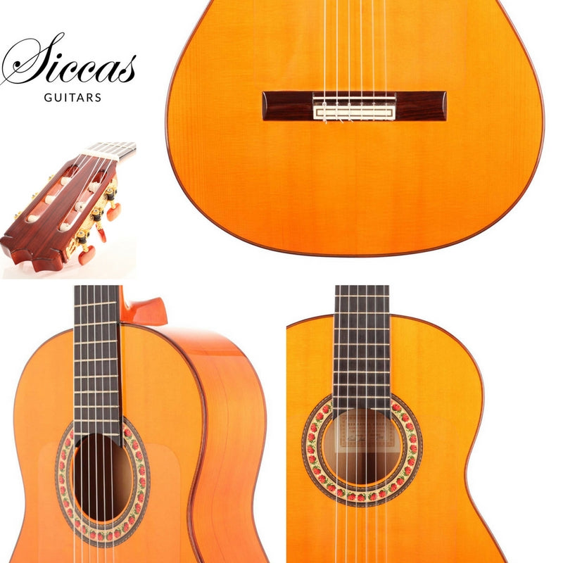 This flamenco guitar was built in 1999 and has a very fine spruce top. This guitar has a “Media Luna” headstock and one of the exclusive traditional rosette designs. The guitar is made from highest quality tone-woods that have matured for several decades. The tuning machines are made by Fustero. A hardshell case is included.