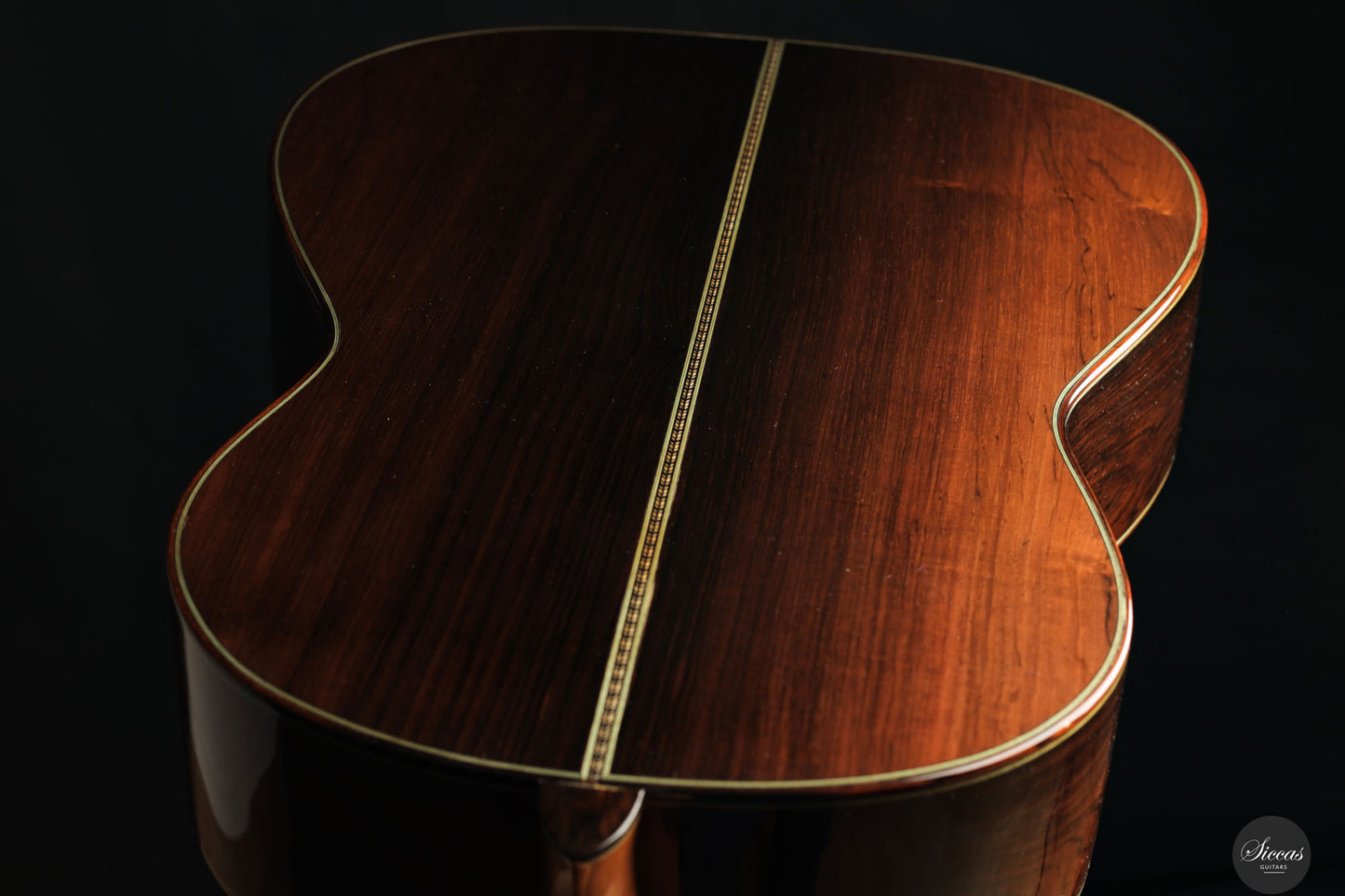 This beautiful guitar is inspired by the work of Antonio de Torres. Aesthetically, it features many ornamental elements reminiscent of Torres’s original instruments, while also incorporating modern touches such as an elevated fingerboard. The spruce soundboard is visually striking, adorned with prominent bearclaw figures. The back and sides are made from straight-grained Brazilian rosewood of the highest quality. Tonally, the guitar offers excellent balance between basses and trebles, with great clarity and warmth. It is easy to play and responds exceptionally well to the right-hand attack. The volume is impressive—an essential characteristic of a modern concert guitar.Condition
