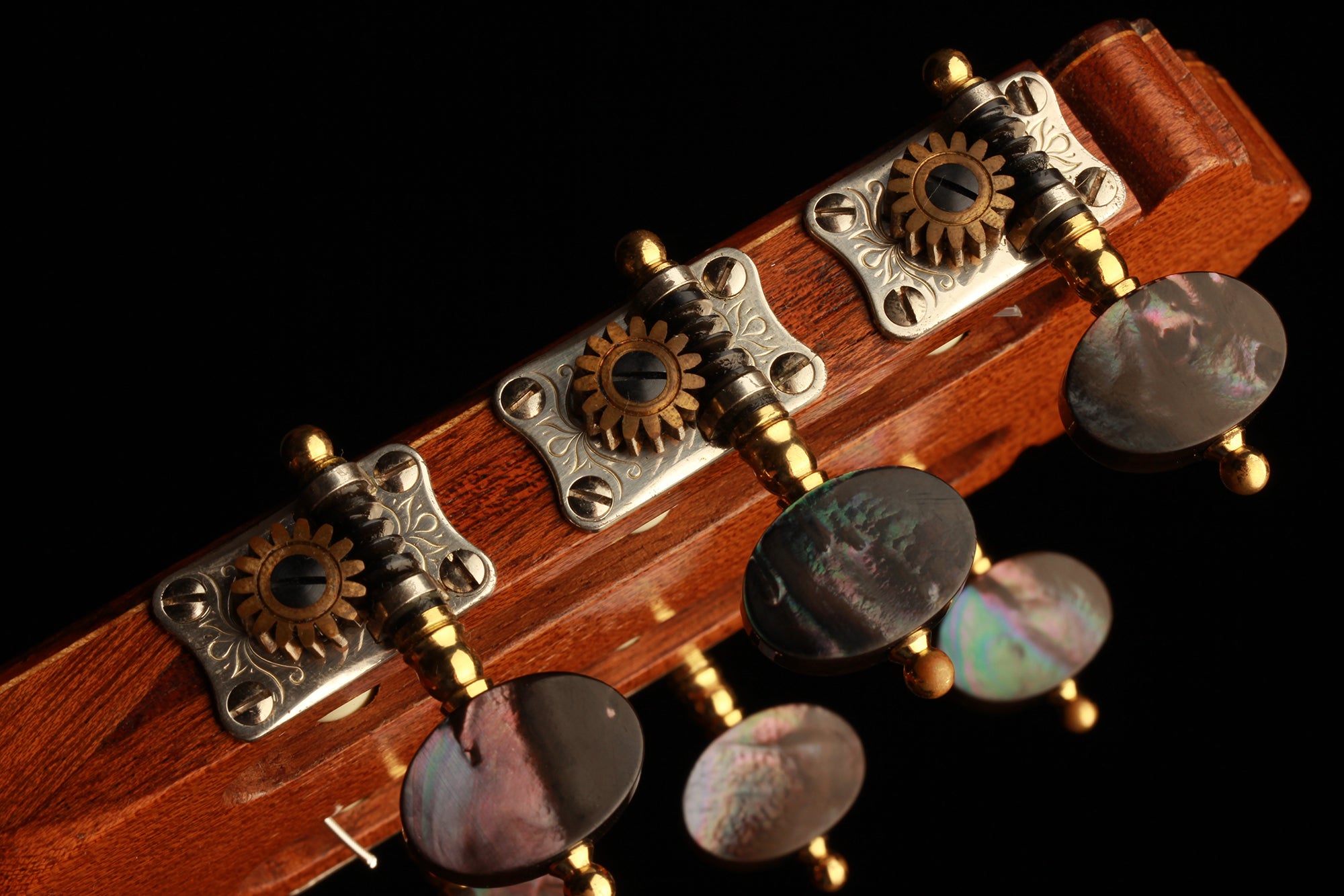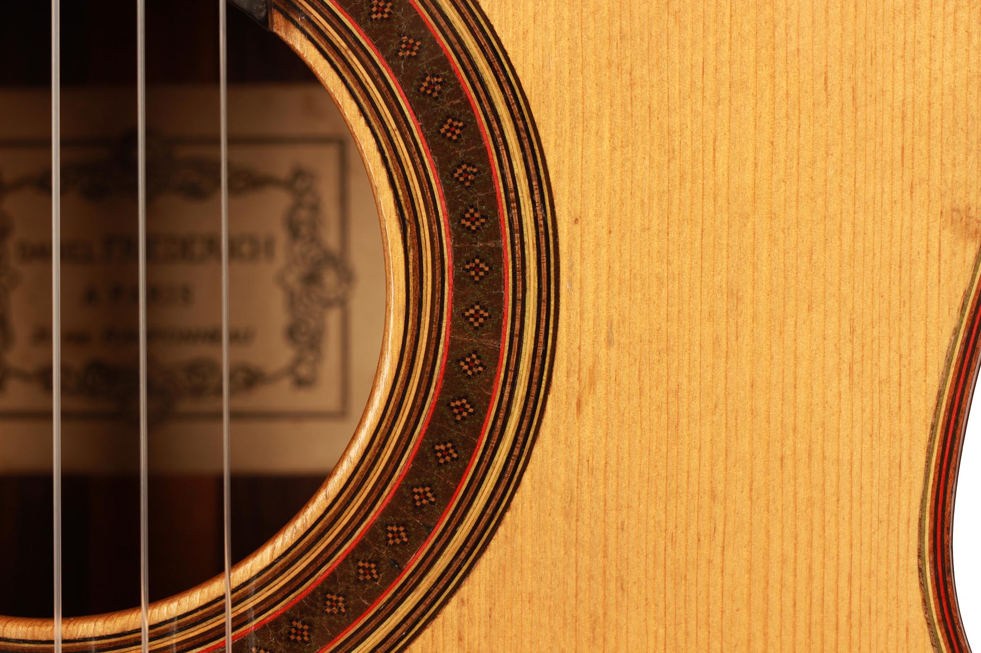 Was für eine prächtige frühe Gitarre von Daniel Friederich. Dies ist ein wunderschönes Instrument mit Fichtendecke welches sich in exzellentem Zustand befindet. Auf der Rückseite befinden sich nur zwei kleine restaurierte Risse von je etwa 2 cm Länge. Der Rest der Gitarre ist absolut rissfrei. Sie wurde mit traditioneller Schellack Politur neu lackiert und besitzt wunderschöne Mechaniken von Rodgers.