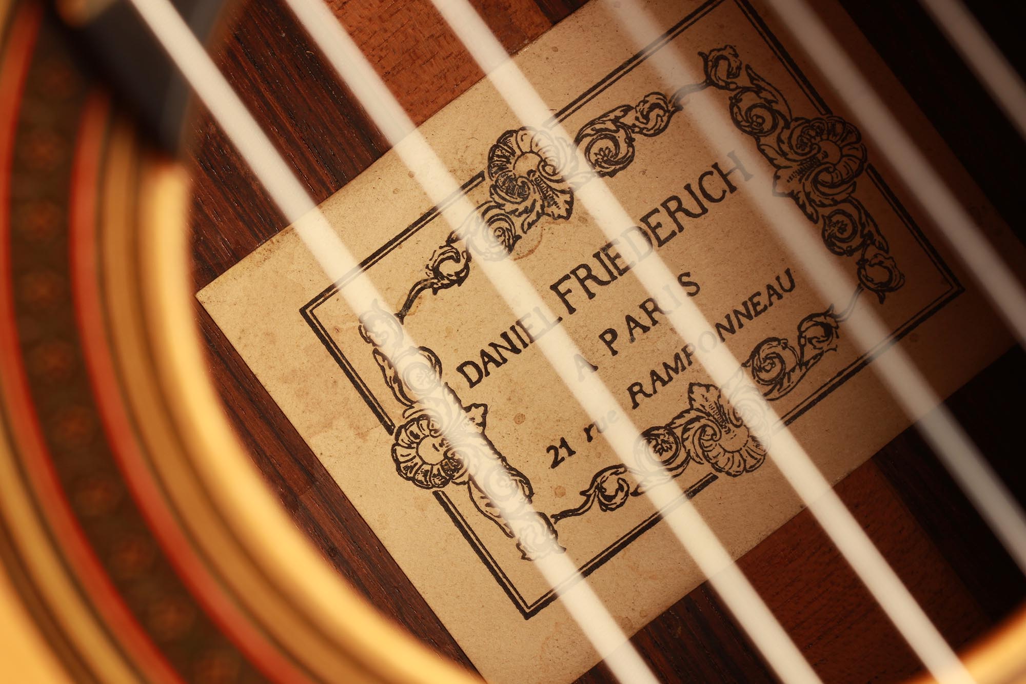 Daniel Friederich wurde am 16. Januar 1932 geboren. Obwohl er den starken Wunsch hatte, Gitarre zu spielen, hatte er mit einem Mangel an Geld zu kämpfen. Im Alter von 23 Jahren löste Friederich dieses Dilemma, indem er seine erste Gitarre selbst baute: eine Kopie einer Simplicio-Gitarre. Daniel Friederich wurde um 1955 von seinem Gitarrenlehrer Christian Aubin unterstützt. Nachdem er Werkzeuge gebaut und Erfahrungen im Gitarrenbau gesammelt hatte, zeigte Daniel Friederich Robert Bouchet seine fünfzehnte Gitarre. Seitdem hat R. Bouchet seine Arbeit inspiriert. Im Laufe seiner Karriere entwickelte er persönlich einige Ideen von R. Bouchet. Daniel Friederich ist seit Jahrzehnten einer der wichtigsten Gitarrenbauer der Welt. Im Jahr 2015 stellte er den Gitarrenbau ein und verkaufte alle seine Werkzeuge. Er ist heute definitiv einer der angesehensten und am meisten bewunderten Gitarrenbauer der Geschichte.