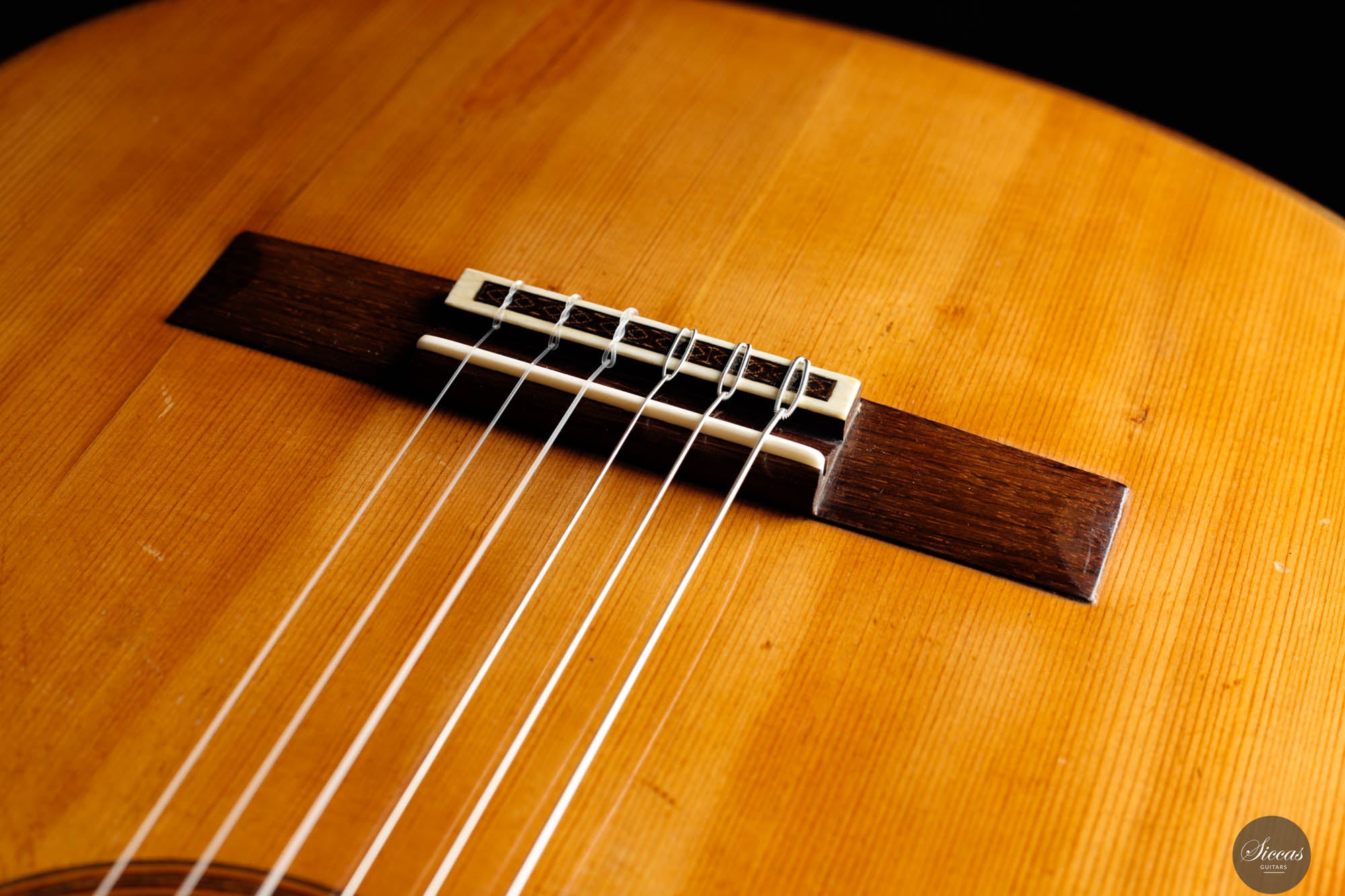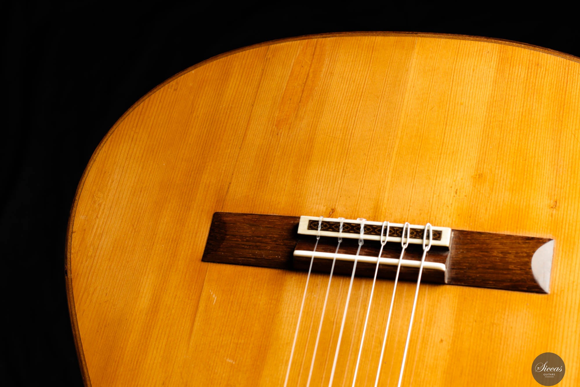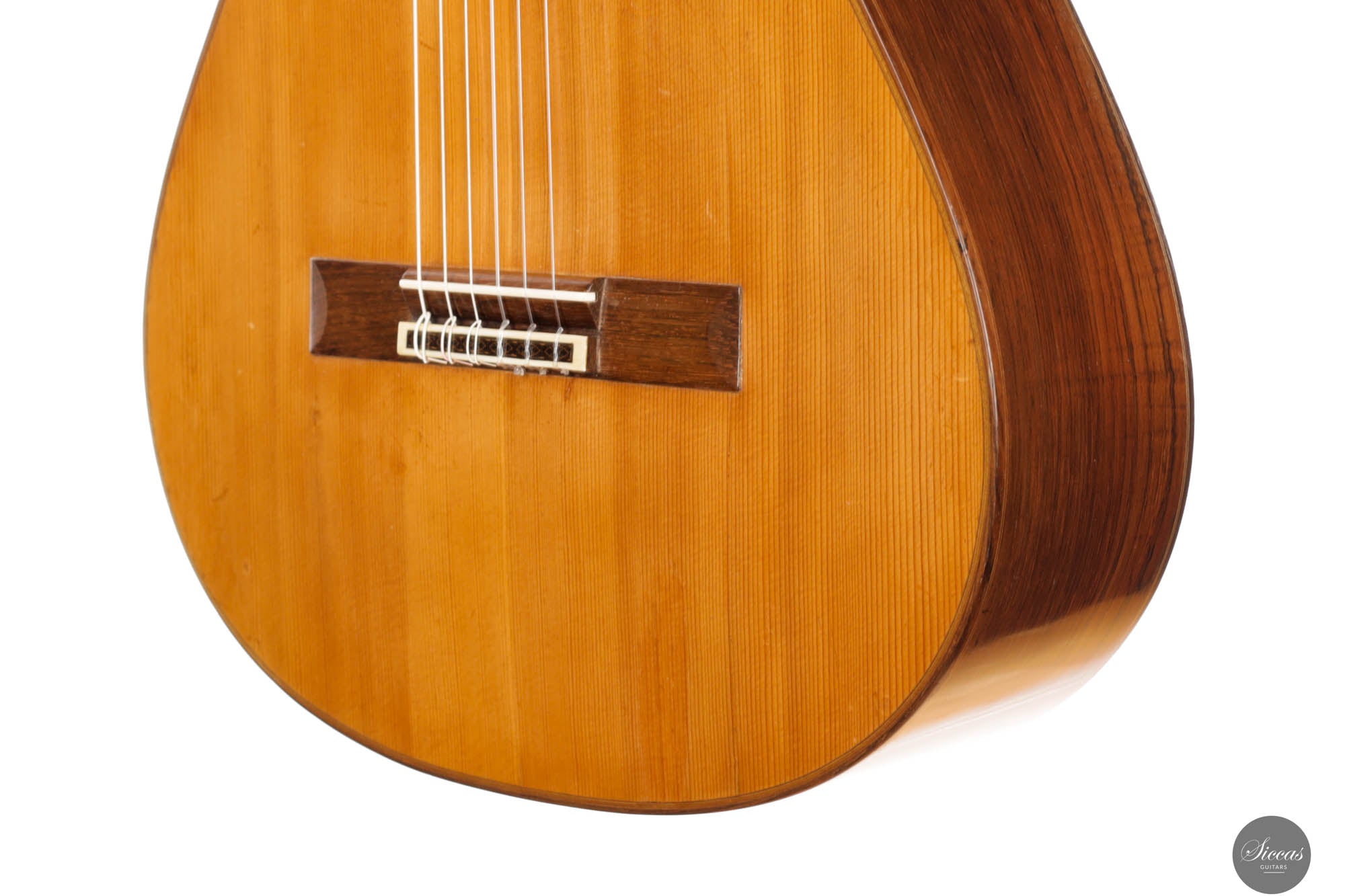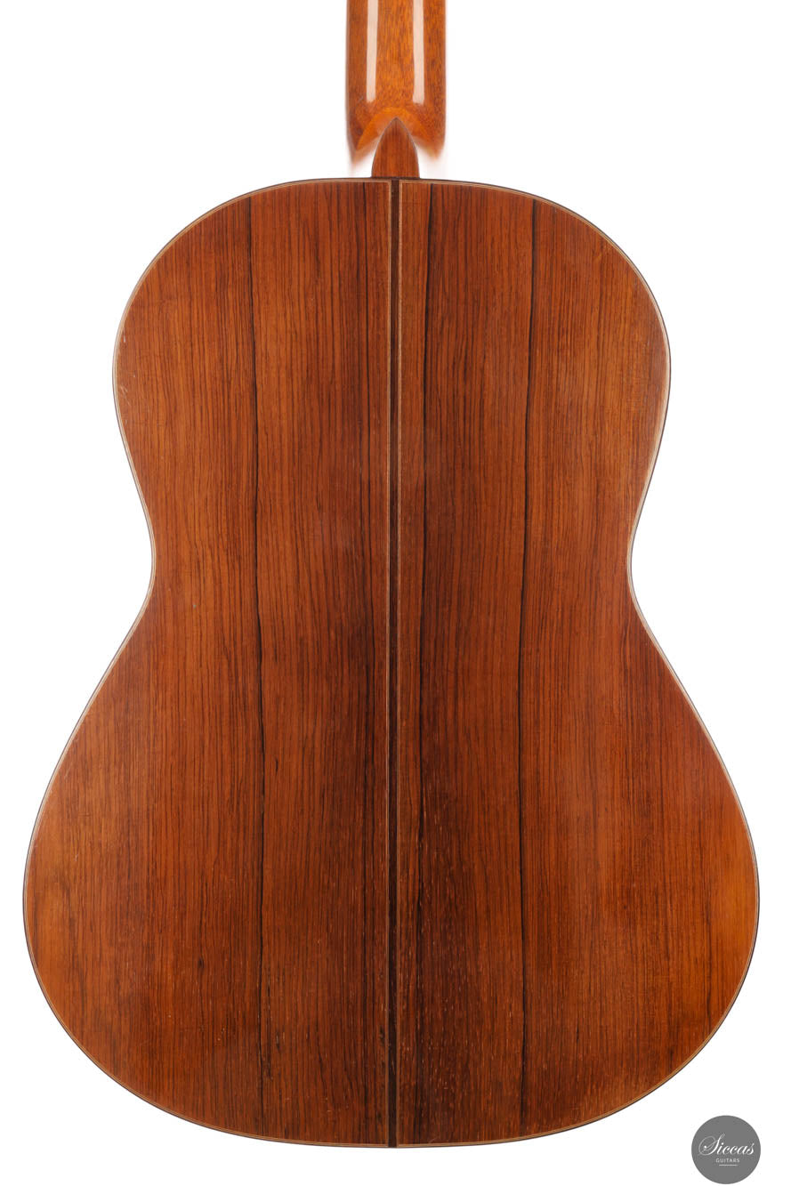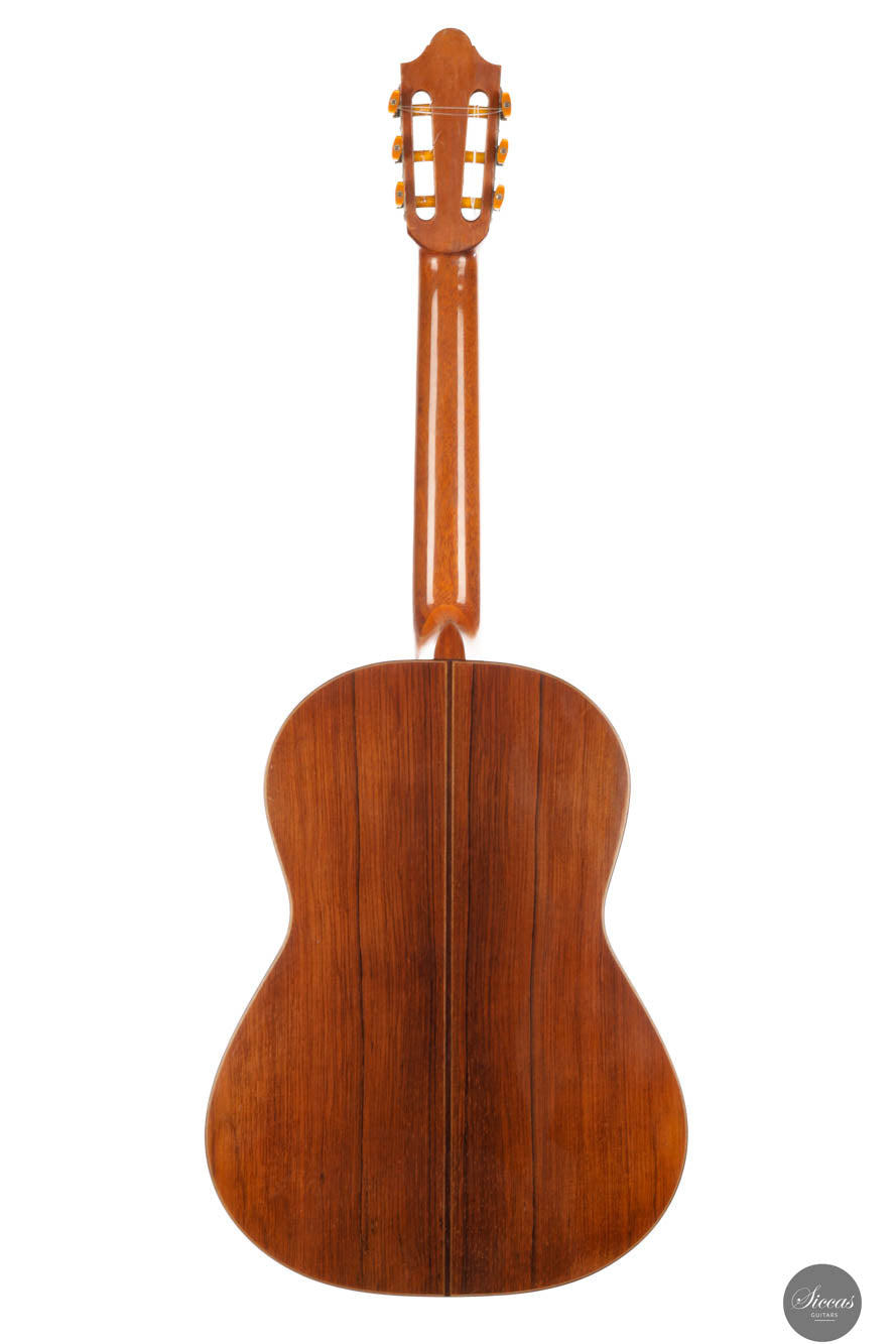 Das „Concert Model“ Nr. 158, gefertigt im Jahr 1965 vom angesehenen Gitarrenbauer Daniel Friederich, nimmt einen bedeutenden Platz in der Welt der Konzertgitarren ein und markiert den Beginn seiner gefeierten Karriere. Inspiriert von dem großen Antonio de Torres, verfügt diese Gitarre über eine akribisch gefertigte Fichtendecke mit einem modifizierten siebenteiligen Fächerbeleistungssystem, das die dritte Evolutionsstufe von Friederichs Verstrebungsdesign widerspiegelt. Diese innovative Konstruktion erzeugt einen Klang, der sowohl reich als auch resonant ist, mit lebendiger Tiefe und Klarheit. Die Höhen stechen durch ihre klare Reinheit und komplexen Obertöne hervor, die an das Läuten einer Glocke erinnern, verstärkt durch ein außergewöhnliches Sustain, das zur bezaubernden Klangpalette des Instruments beiträgt. Die Bässe bieten eine warme, kräftige Grundlage und schaffen ein ausgewogenes und harmonisch abgerundetes Klangprofil. Trotz ihres Alters ist die Gitarre in gutem Zustand, mit drei fachmännisch reparierten (von Daniel Friederich selbst) Rissen an der unteren Saite und einem neben dem Griffbrett auf der Diskantseite, die ihren Wert oder ihre historische Bedeutung als seltenes und wertvolles Beispiel für Friederichs frühe Handwerkskunst nicht schmälern. Darüber hinaus wurde die Lackierung dieser Gitarre erneuert, wodurch sie sehr frisch aussieht.
