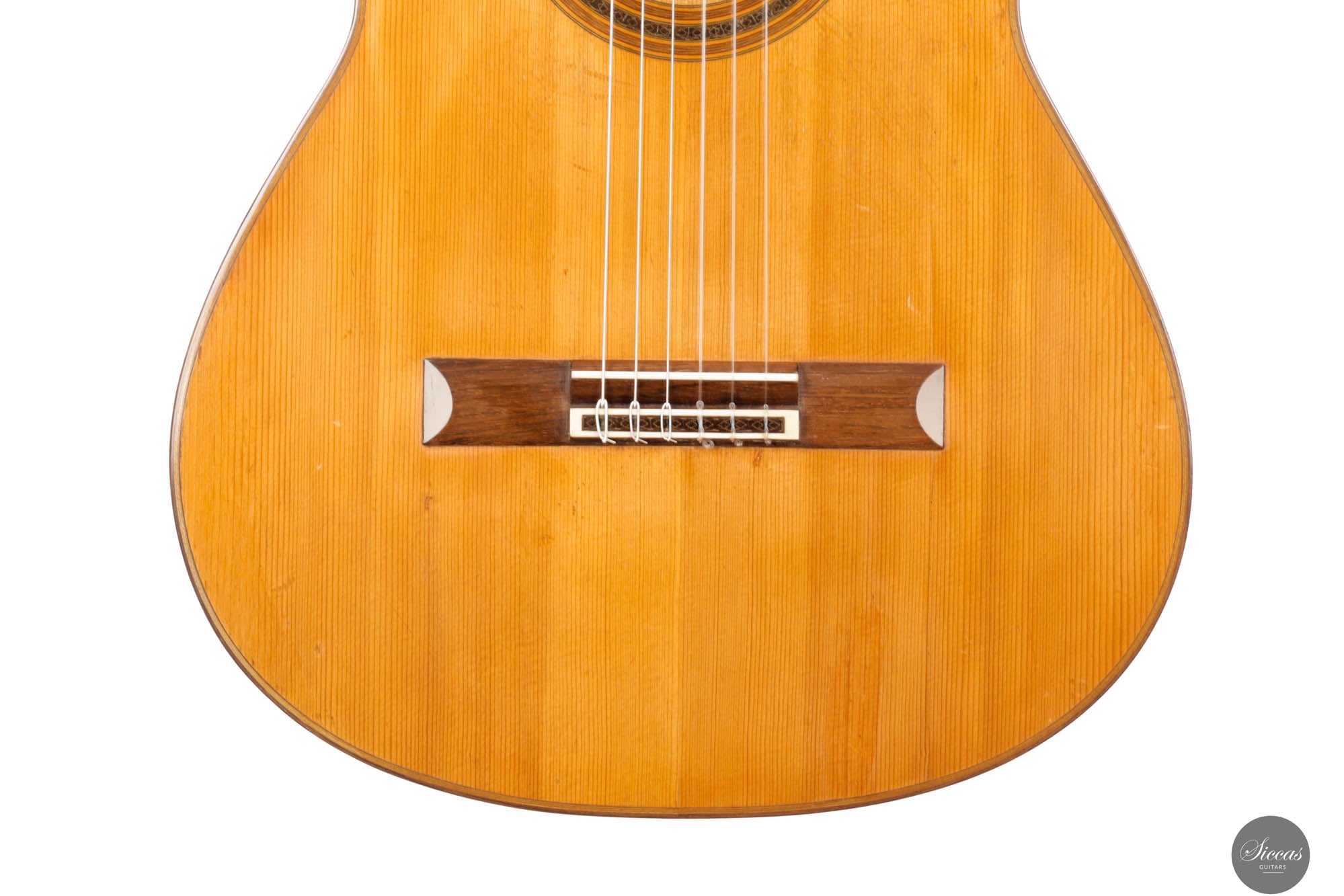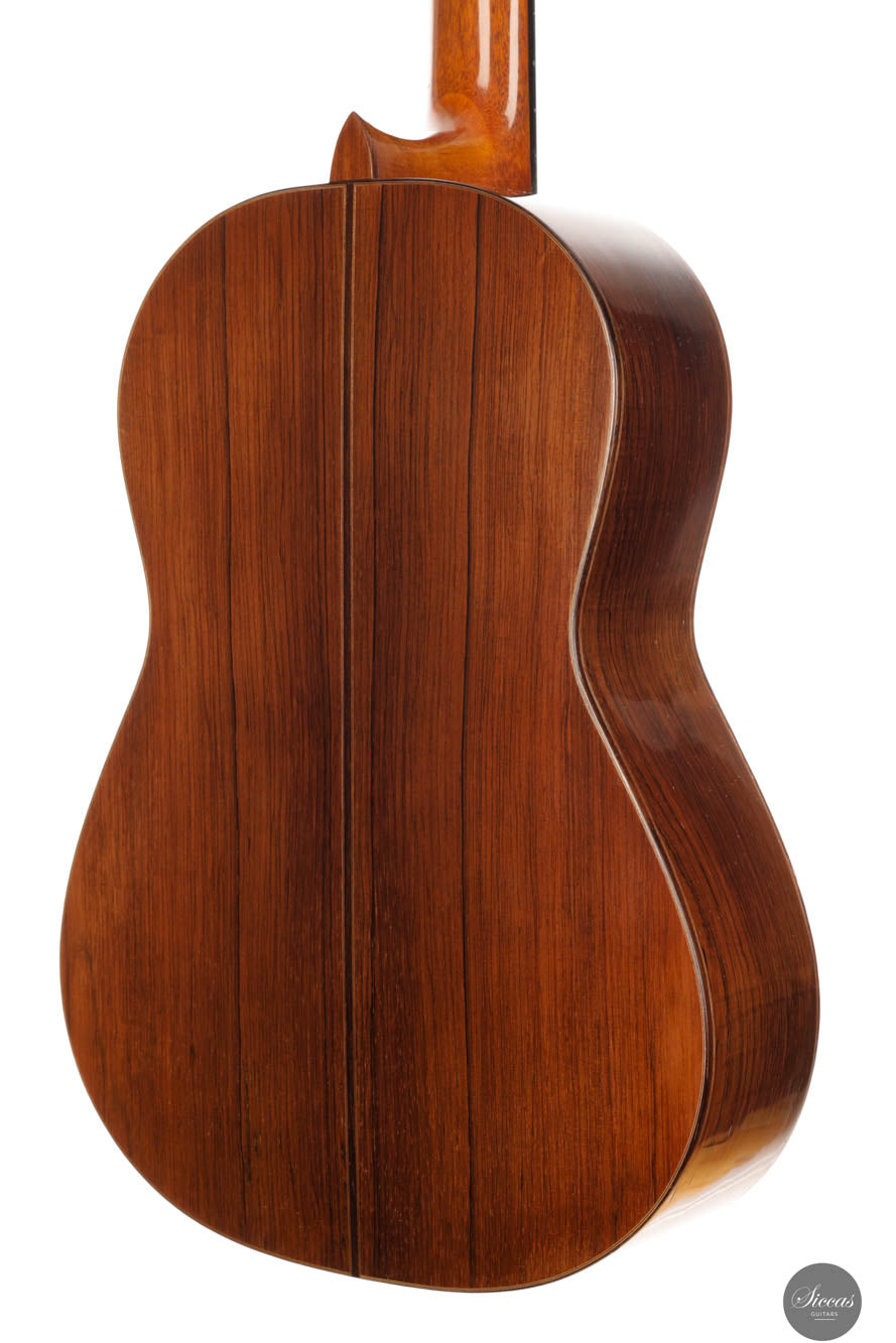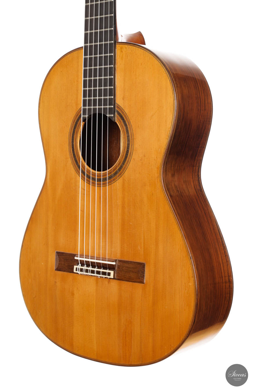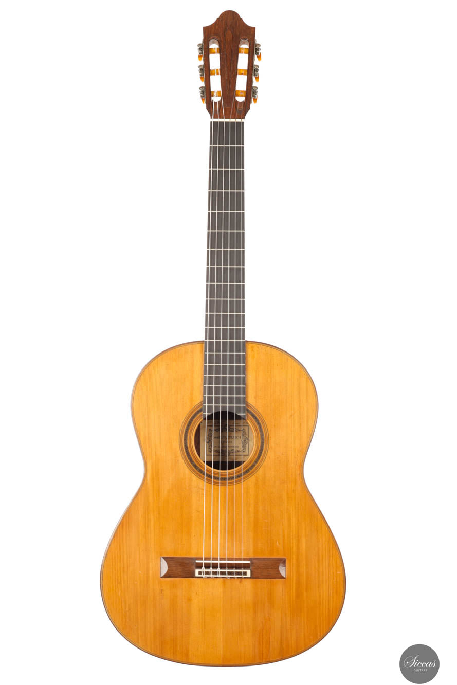 Das „Concert Model“ Nr. 158 von Daniel Friederich aus dem Jahr 1965 gehört zu den frühen Meisterwerken des Pariser Gitarrenbauers und zeigt die Entwicklung seines unverwechselbaren Stils unter dem Einfluss von Robert Bouchet und Antonio de Torres. Die sorgfältig gearbeitete Fichtendecke mit modifizierter siebenfächriger Beleistung verleiht dem Instrument einen reichen, resonanten Klang mit außergewöhnlicher Tiefe und Klarheit. Die Höhen leuchten mit glockenähnlicher Reinheit und langem Sustain, während die Bässe Wärme und Tragkraft hinzufügen und so ein harmonisches Klangbild schaffen. Trotz ihres Alters befindet sich die Gitarre in gutem Zustand: mehrere Risse wurden von Friederich selbst repariert, zudem wurde die Lackierung erneuert, was ihr ein frisches Erscheinungsbild verleiht. Dieses Instrument ist ein seltenes Zeugnis seiner frühen Schaffensphase und zugleich von hohem musikalischen wie historischen Wert.