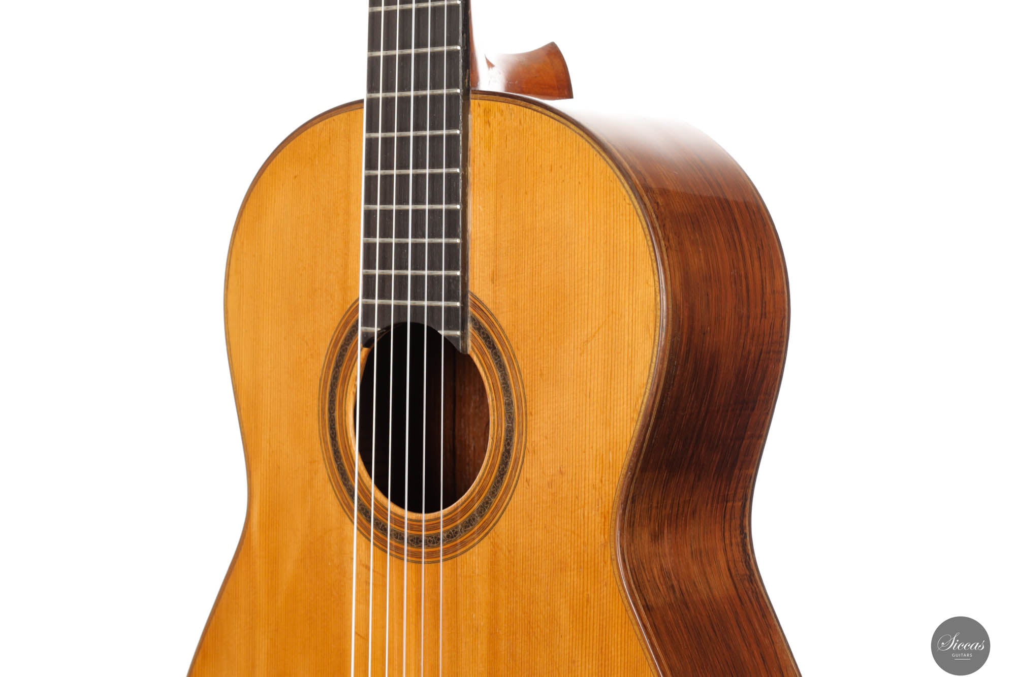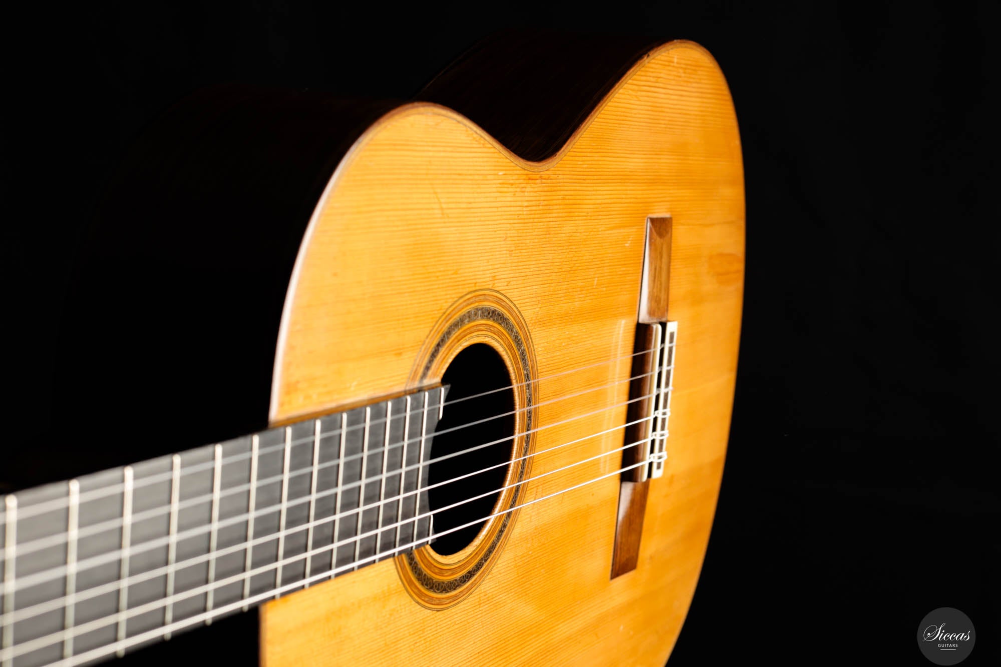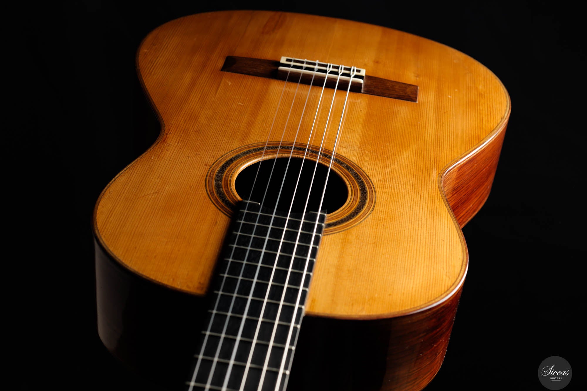 Das „Concert Model“ Nr. 158 von Daniel Friederich aus dem Jahr 1965 gehört zu den frühen Meisterwerken des Pariser Gitarrenbauers und zeigt die Entwicklung seines unverwechselbaren Stils unter dem Einfluss von Robert Bouchet und Antonio de Torres. Die sorgfältig gearbeitete Fichtendecke mit modifizierter siebenfächriger Beleistung verleiht dem Instrument einen reichen, resonanten Klang mit außergewöhnlicher Tiefe und Klarheit. Die Höhen leuchten mit glockenähnlicher Reinheit und langem Sustain, während die Bässe Wärme und Tragkraft hinzufügen und so ein harmonisches Klangbild schaffen. Trotz ihres Alters befindet sich die Gitarre in gutem Zustand: mehrere Risse wurden von Friederich selbst repariert, zudem wurde die Lackierung erneuert, was ihr ein frisches Erscheinungsbild verleiht. Dieses Instrument ist ein seltenes Zeugnis seiner frühen Schaffensphase und zugleich von hohem musikalischen wie historischen Wert.