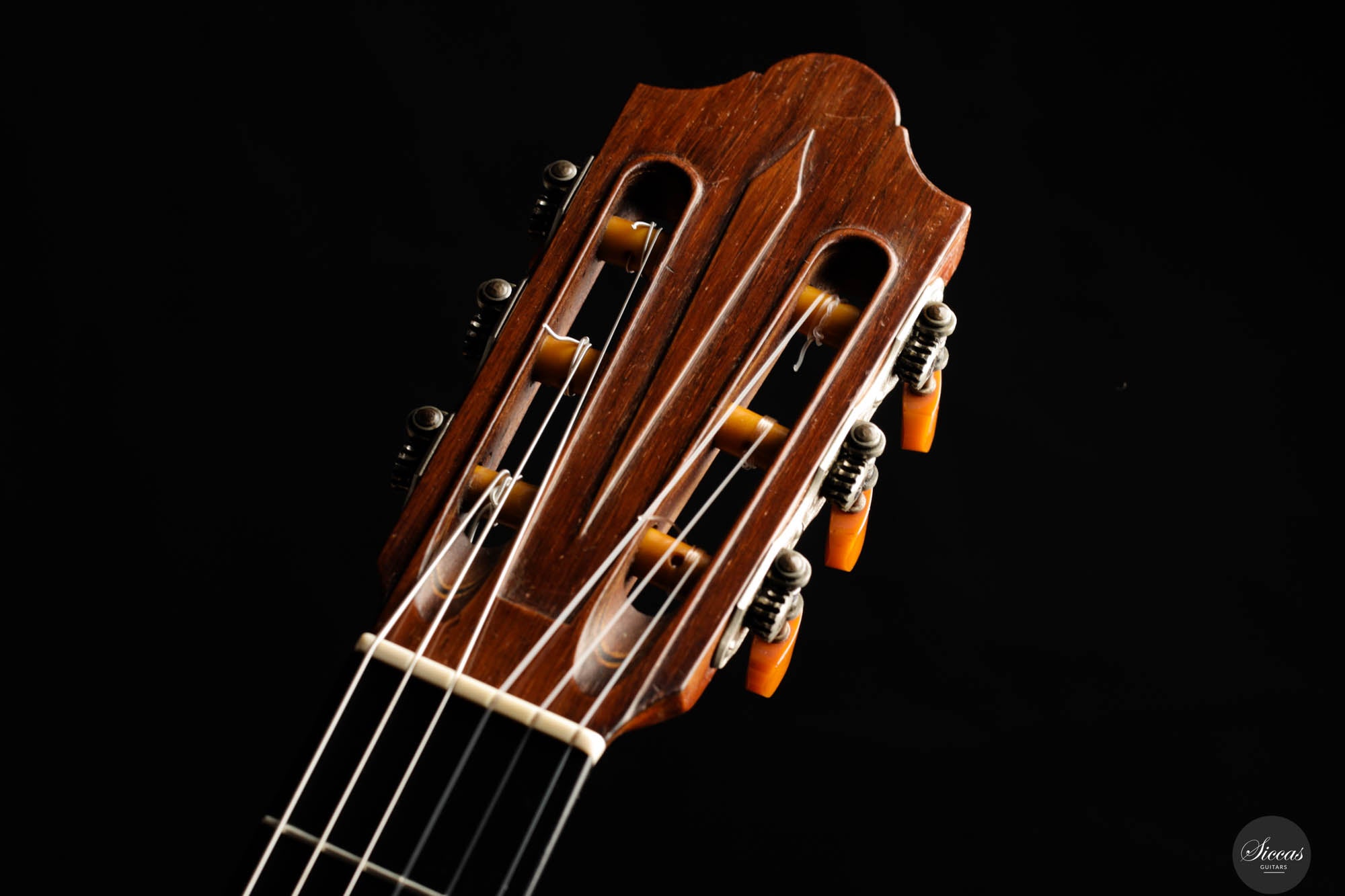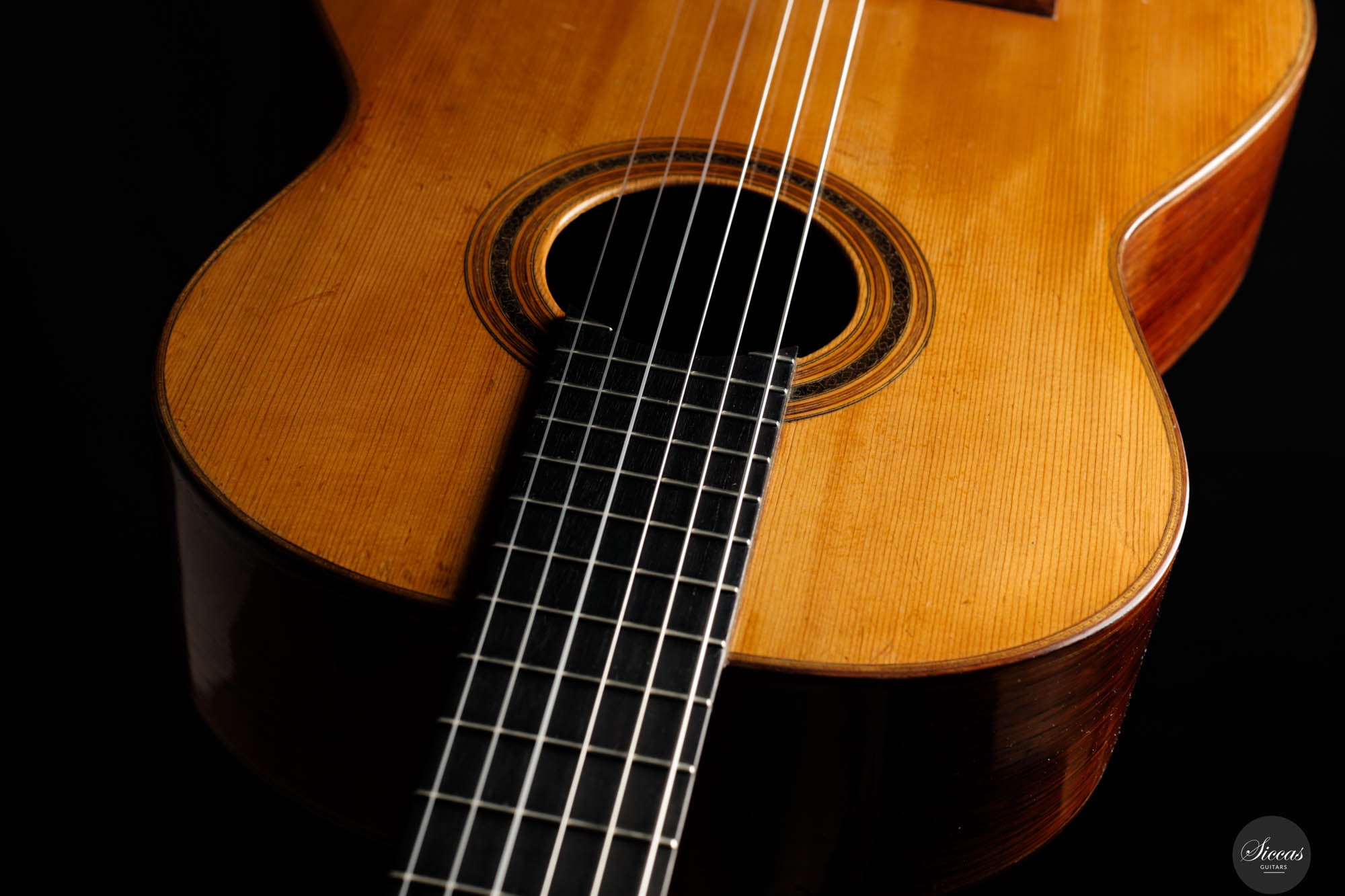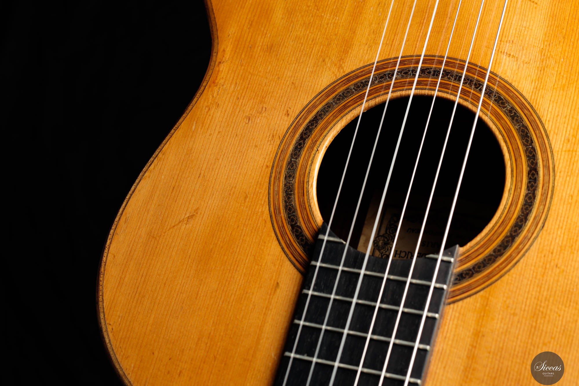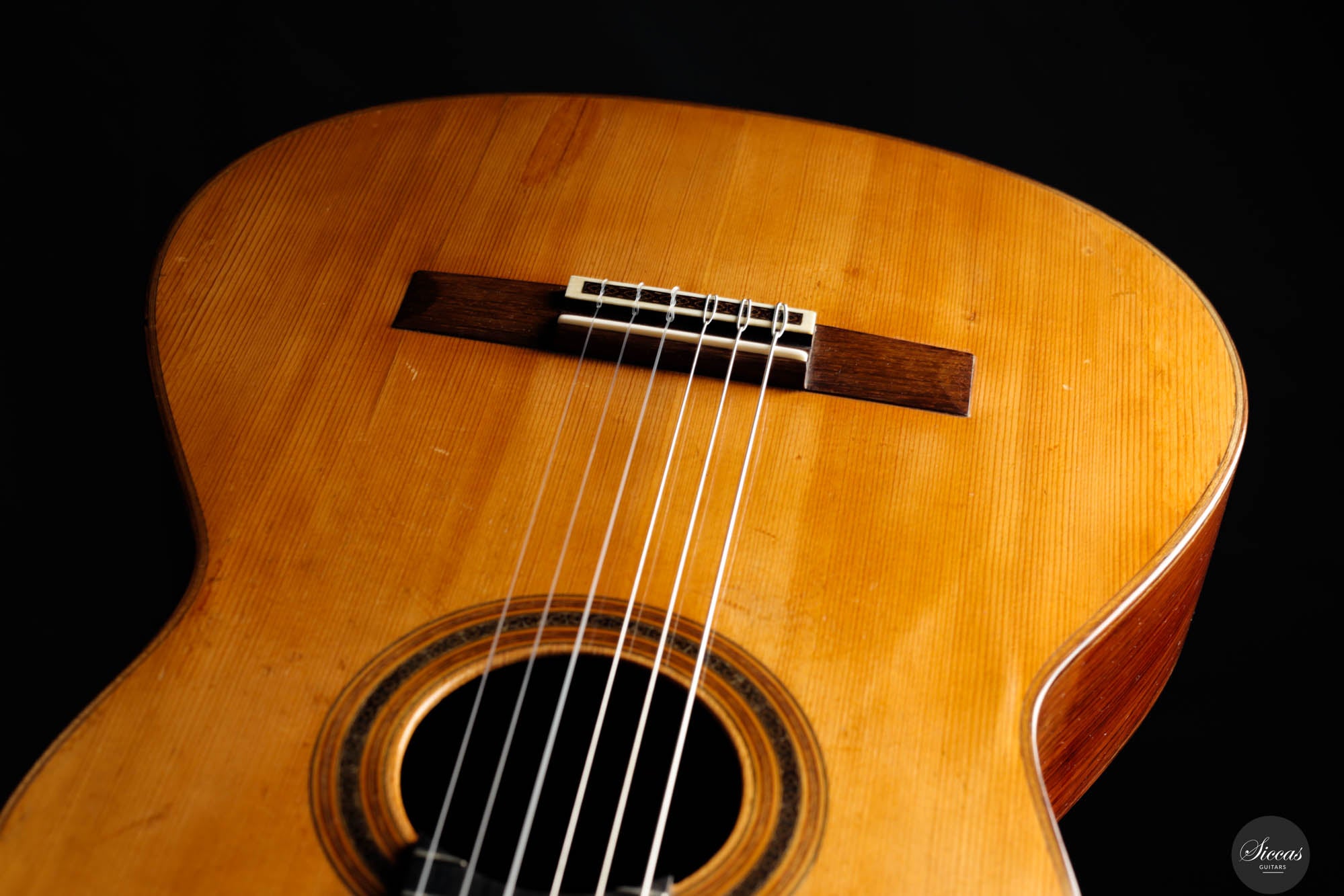 Das „Concert Model“ Nr. 158 von Daniel Friederich aus dem Jahr 1965 gehört zu den frühen Meisterwerken des Pariser Gitarrenbauers und zeigt die Entwicklung seines unverwechselbaren Stils unter dem Einfluss von Robert Bouchet und Antonio de Torres. Die sorgfältig gearbeitete Fichtendecke mit modifizierter siebenfächriger Beleistung verleiht dem Instrument einen reichen, resonanten Klang mit außergewöhnlicher Tiefe und Klarheit. Die Höhen leuchten mit glockenähnlicher Reinheit und langem Sustain, während die Bässe Wärme und Tragkraft hinzufügen und so ein harmonisches Klangbild schaffen. Trotz ihres Alters befindet sich die Gitarre in gutem Zustand: mehrere Risse wurden von Friederich selbst repariert, zudem wurde die Lackierung erneuert, was ihr ein frisches Erscheinungsbild verleiht. Dieses Instrument ist ein seltenes Zeugnis seiner frühen Schaffensphase und zugleich von hohem musikalischen wie historischen Wert.