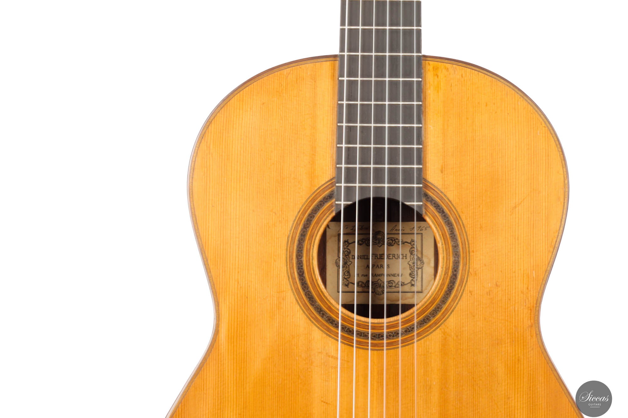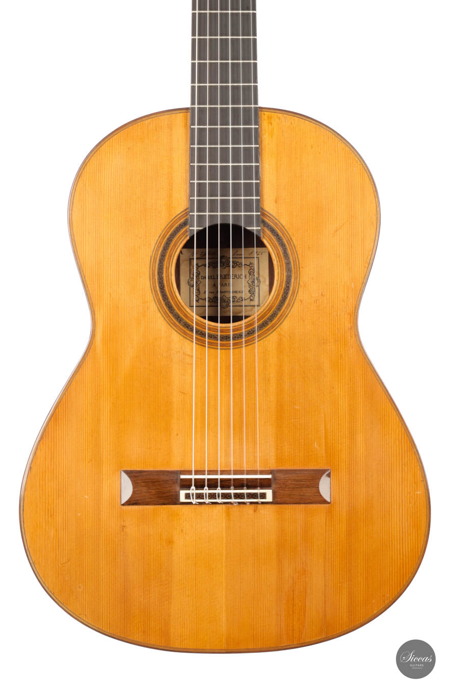 Daniel Friederich wurde am 16. Januar 1932 geboren und ist im Jahr 2020 verstorben. Obwohl er den festen Wunsch hatte, Gitarre zu spielen, mangelte es ihm an Geld, um sich ein Instrument zu kaufen. Im Alter von 23 Jahren fand er jedoch eine Lösung, indem er seine erste Gitarre selbst baute, eine Kopie einer Simplicio-Gitarre. Hierbei war ihm sein Gitarrenlehrer und renommierter Gitarrenbauer, Christian Aubin, eine große Stütze. Nachdem Friederich selbst Werkzeuge hergestellt und Erfahrung im Gitarrenbau gesammelt hatte, zeigte er seine fünfzehnte Gitarre Robert Bouchet, der fortan seine Arbeit beeinflusste. Während seiner Karriere integrierte und modifizierte Friederich auch einige von Bouchets Ideen.