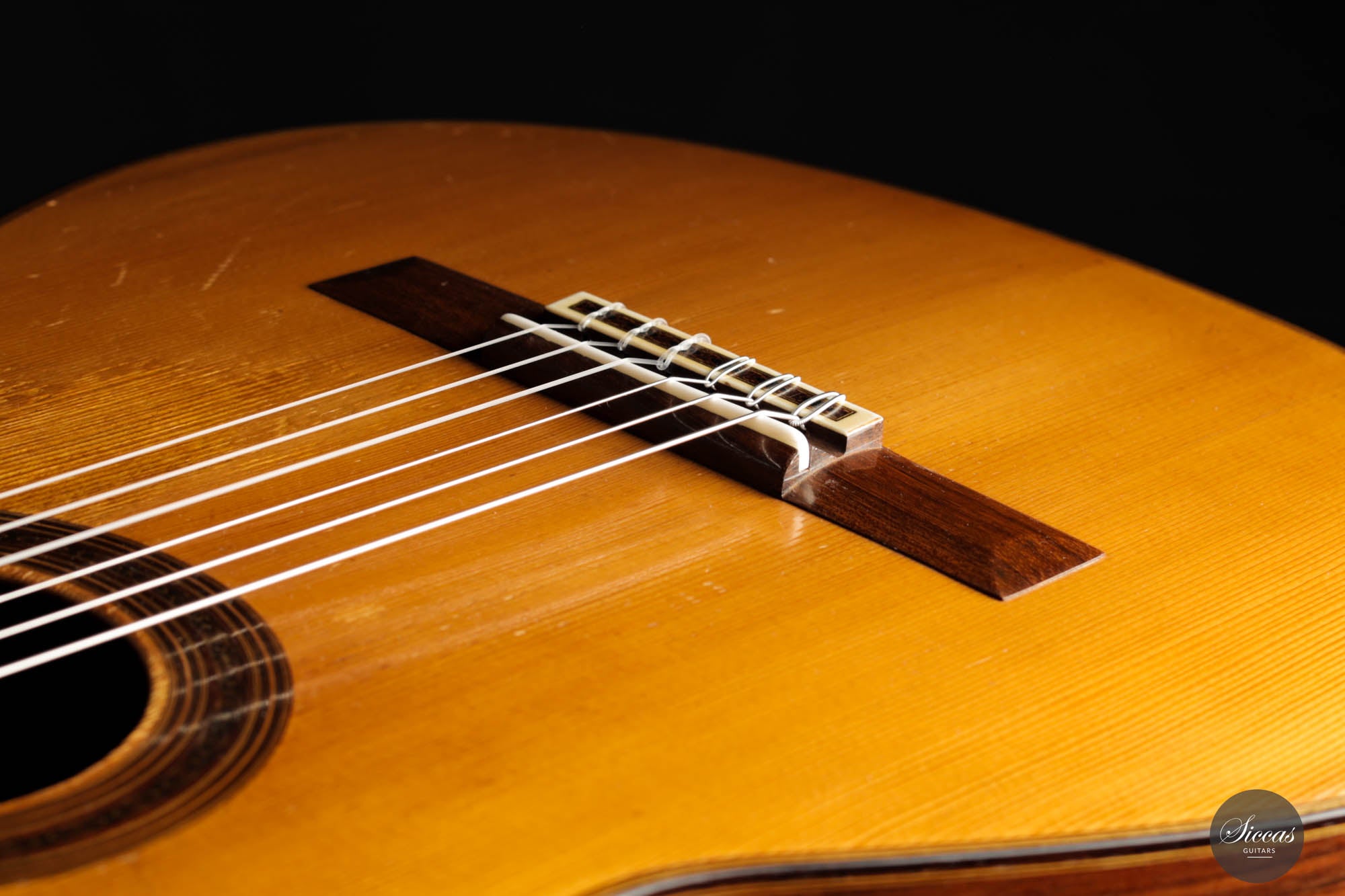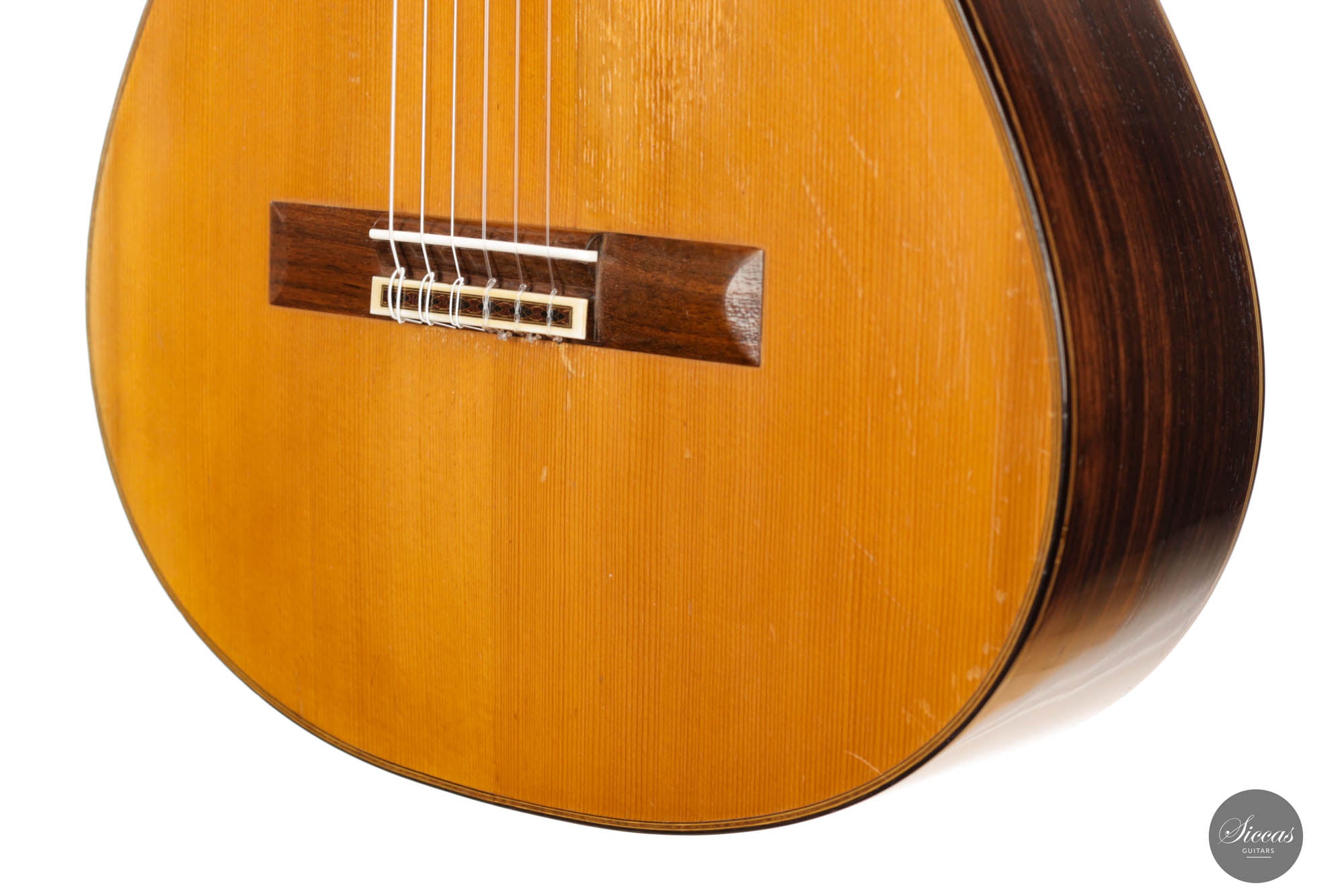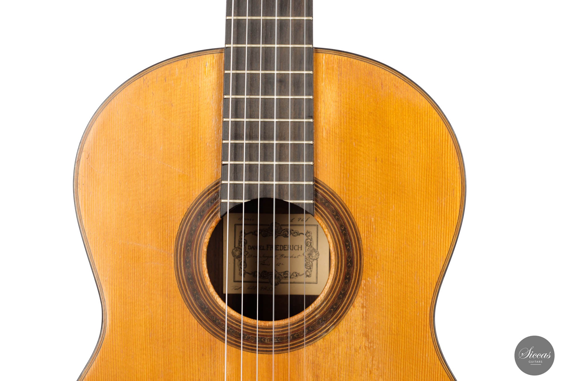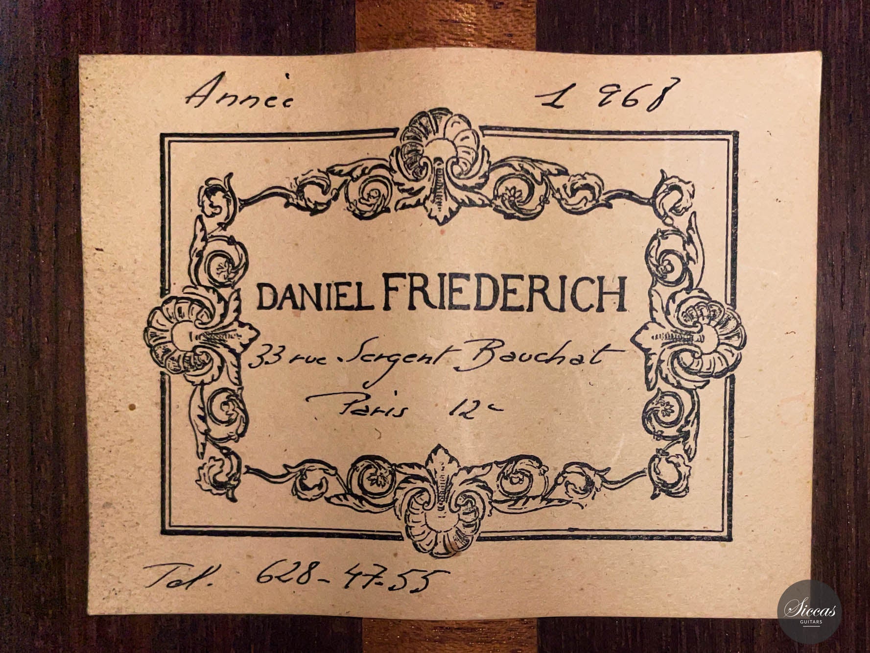Daniel Friederich wurde am 16. Januar 1932 geboren und ist im Jahr 2020 verstorben. Obwohl er den festen Wunsch hatte, Gitarre zu spielen, mangelte es ihm an Geld, um sich ein Instrument zu kaufen. Im Alter von 23 Jahren fand er jedoch eine Lösung, indem er seine erste Gitarre selbst baute, eine Kopie einer Simplicio-Gitarre. Hierbei war ihm sein Gitarrenlehrer und renommierter Gitarrenbauer, Christian Aubin, eine große Stütze. Nachdem Friederich selbst Werkzeuge hergestellt und Erfahrung im Gitarrenbau gesammelt hatte, zeigte er seine fünfzehnte Gitarre Robert Bouchet, der fortan seine Arbeit beeinflusste. Während seiner Karriere integrierte und modifizierte Friederich auch einige von Bouchets Ideen. Jahrzehntelang galt Daniel Friederich als einer der renommiertesten Gitarrenbauer weltweit. 2015 beendete er nach einer langen und erfolgreichen Laufbahn den Gitarrenbau und verkaufte all seine Werkzeuge. Das Récital-Modell von Daniel Friederich aus dem Jahr 1968 beeindruckt durch seine tiefen, samtigen Klänge und vermittelt eine Aura, die jeden Ton lebendig wirken lässt. Jede Note strahlt eine reiche Tiefe aus, die den Zuhörer emotional berührt. Im Gegensatz zu seinen schwereren Konzertmodellen hat dieses Instrument einen schlanken, abgerundeten Hals, der das Spielen erleichtert und der linken Hand besonderen Komfort bietet. Das Ergebnis ist eine intensiv vibrierende Gitarre, die dem Spieler eine grenzenlose musikalische Freiheit bietet. Obwohl diese Gitarre noch den Originallack und die originalen Mechaniken besitzt, gibt es auch Spuren der Zeit. Die Decke zeigt drei fachmännisch reparierte Risse: zwei auf der Decke – einer unterhalb des Stegs und einer neben dem Griffbrett – und einen kleinen Reparaturbereich am Unterklotz, wo der vorherige Besitzer ein Loch für einen Gurtpin gebohrt hatte. Für diese Risse wurden keine Unterfütterungen (Cleats) verwendet. Außerdem wurden leichte Markierungen unter den E-Saiten retuschiert. Trotz dieser Makel bleibt das Instrument ein beeindruckendes Zeugnis von Friederichs handwerklichem Können. Das Etikett in der Gitarre zeigt „Année 1968“ oben und „Paris“ unten, ergänzt durch Friederichs Unterschrift, die ihre Authentizität bestätigt. Die doppelseitigen Zargen, Zederndecke und raffinierte Verstrebungen sind typisch für Friederichs Handwerk in dieser Zeit. Die Récital-Modelle der späten 1960er Jahre sind jedoch weiterhin besonders geschätzt. Es ist eine Ehre, ein so exquisites Instrument anbieten zu können, das nicht nur ein Musikinstrument ist, sondern ein fesselndes Stück Geschichte, das die Kunstfertigkeit seines Schöpfers widerspiegelt.