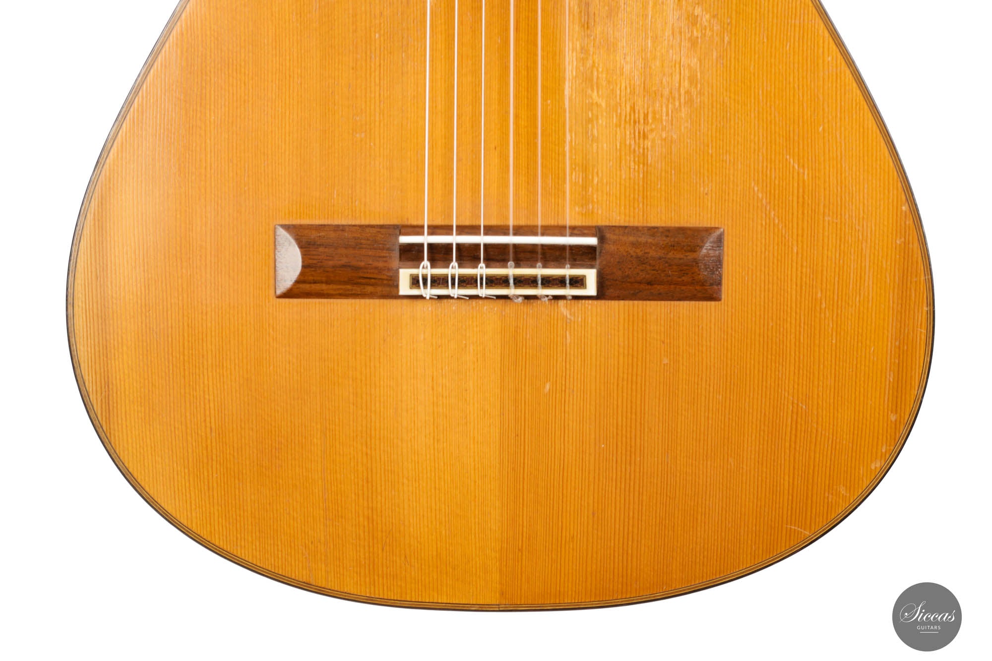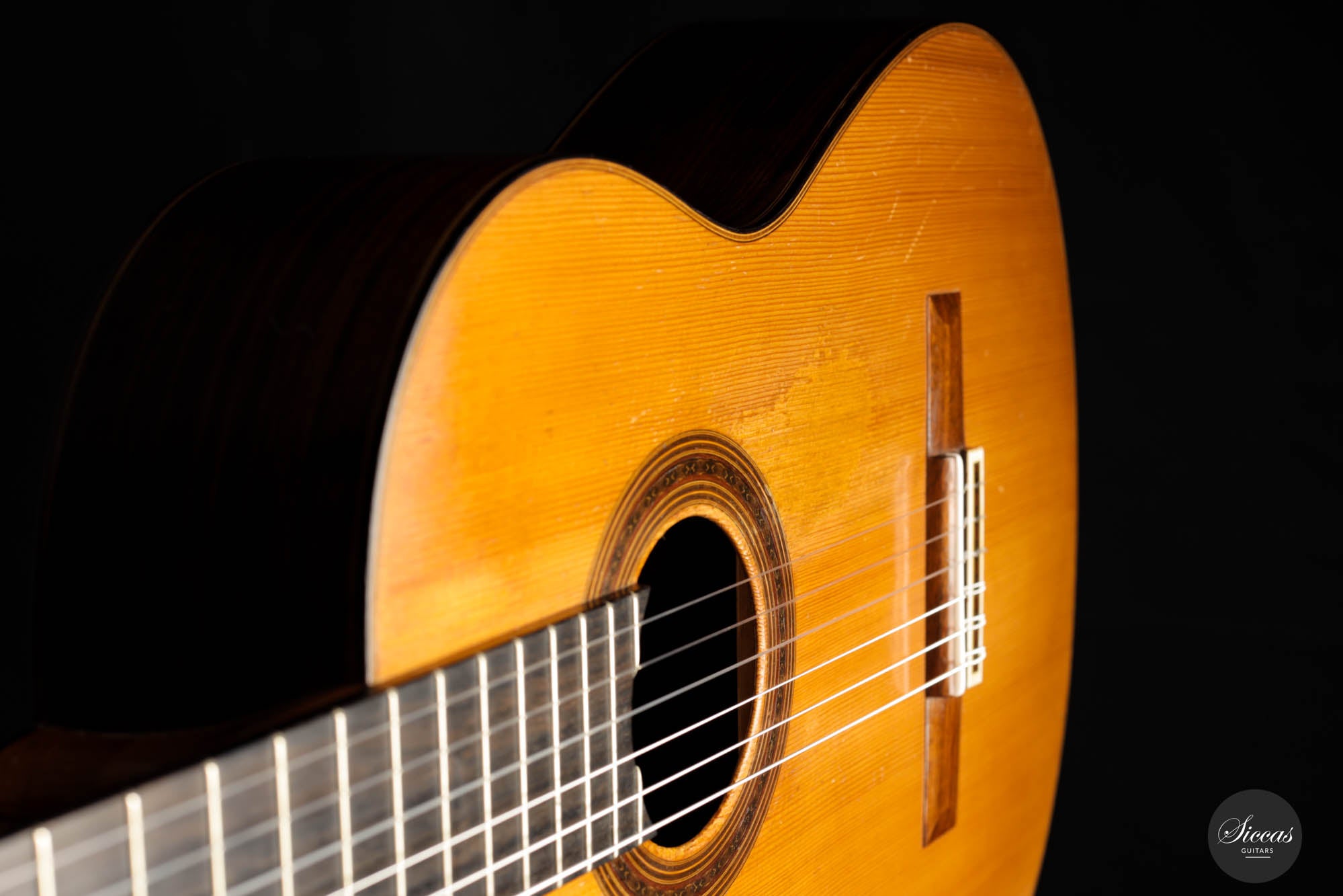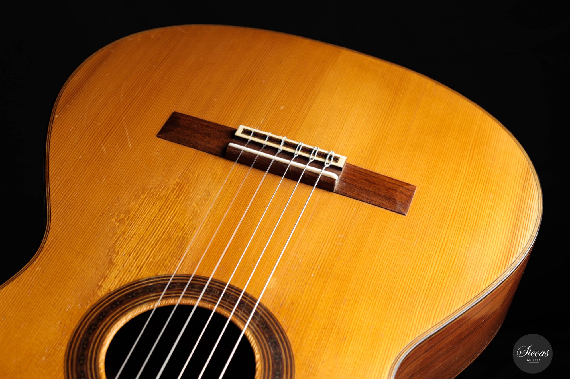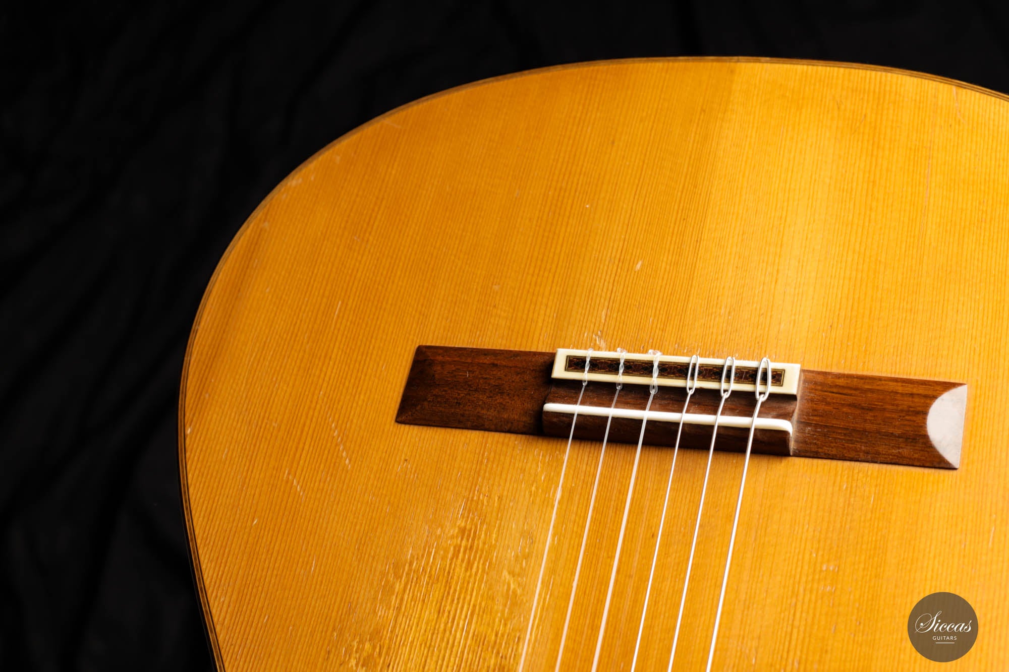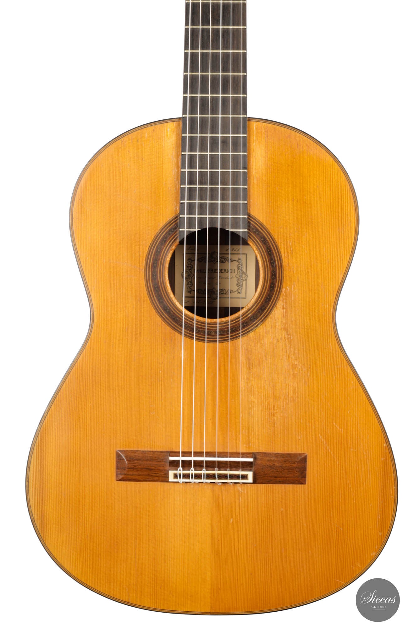 Daniel Friederich - 1968 - Récital Modell ist ein außergewöhnliches Instrument mit warmem, tiefem Klangcharakter und intensiver Schwingung. Die Zederndecke und doppelseitigen Zargen verleihen ihm eine reiche Klangfülle und ein lebendiges Timbre, während der schlanke, abgerundete Hals für hohen Spielkomfort sorgt. Trotz sorgfältig reparierter Altersmerkmale bleibt die Gitarre ein authentisches Zeugnis von Friederichs Meisterschaft. Mit originalem Lack und Etikett aus Paris ist sie nicht nur ein Konzertinstrument, sondern auch ein bedeutendes Sammlerstück aus der Hand eines der einflussreichsten Gitarrenbauer des 20. Jahrhunderts.