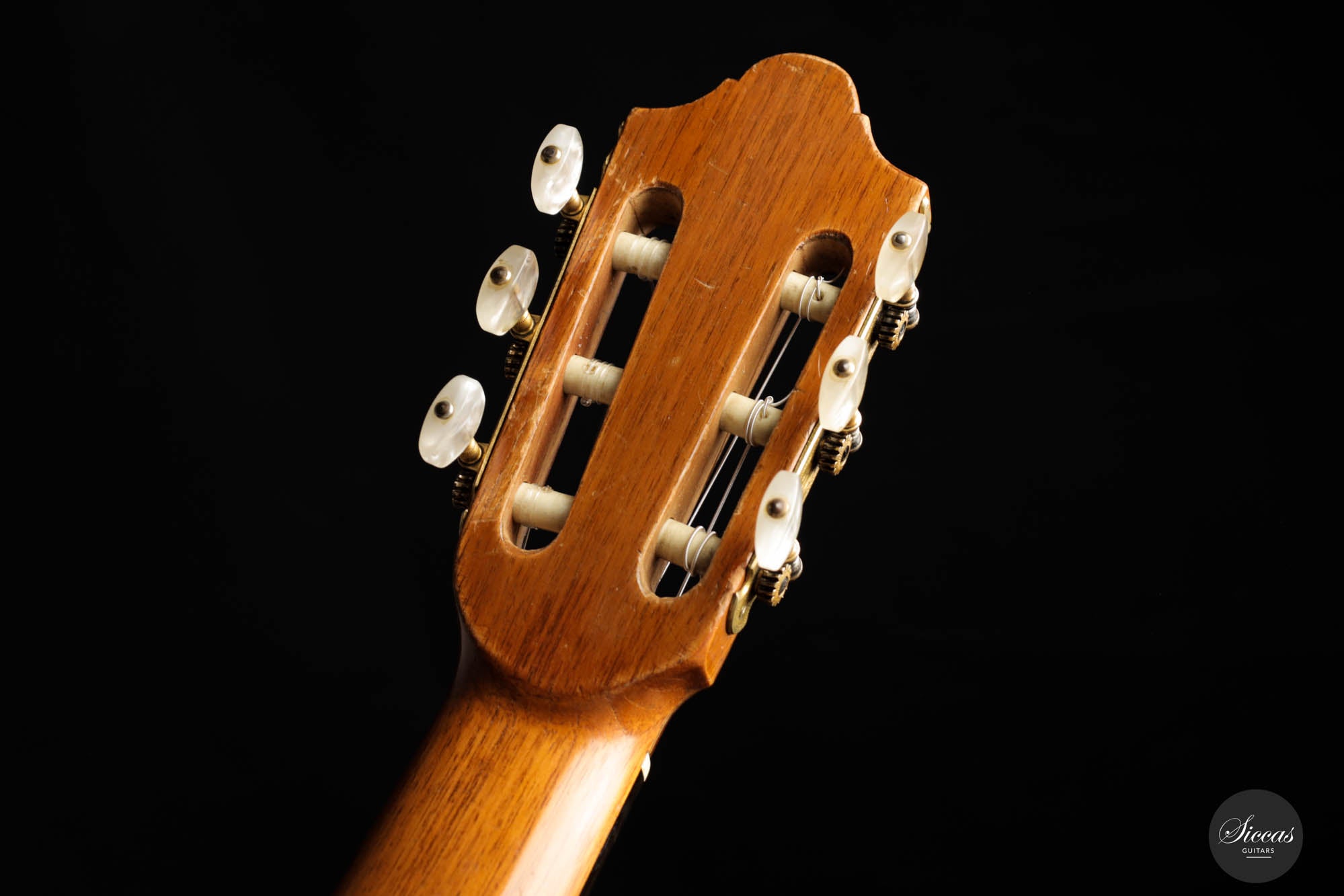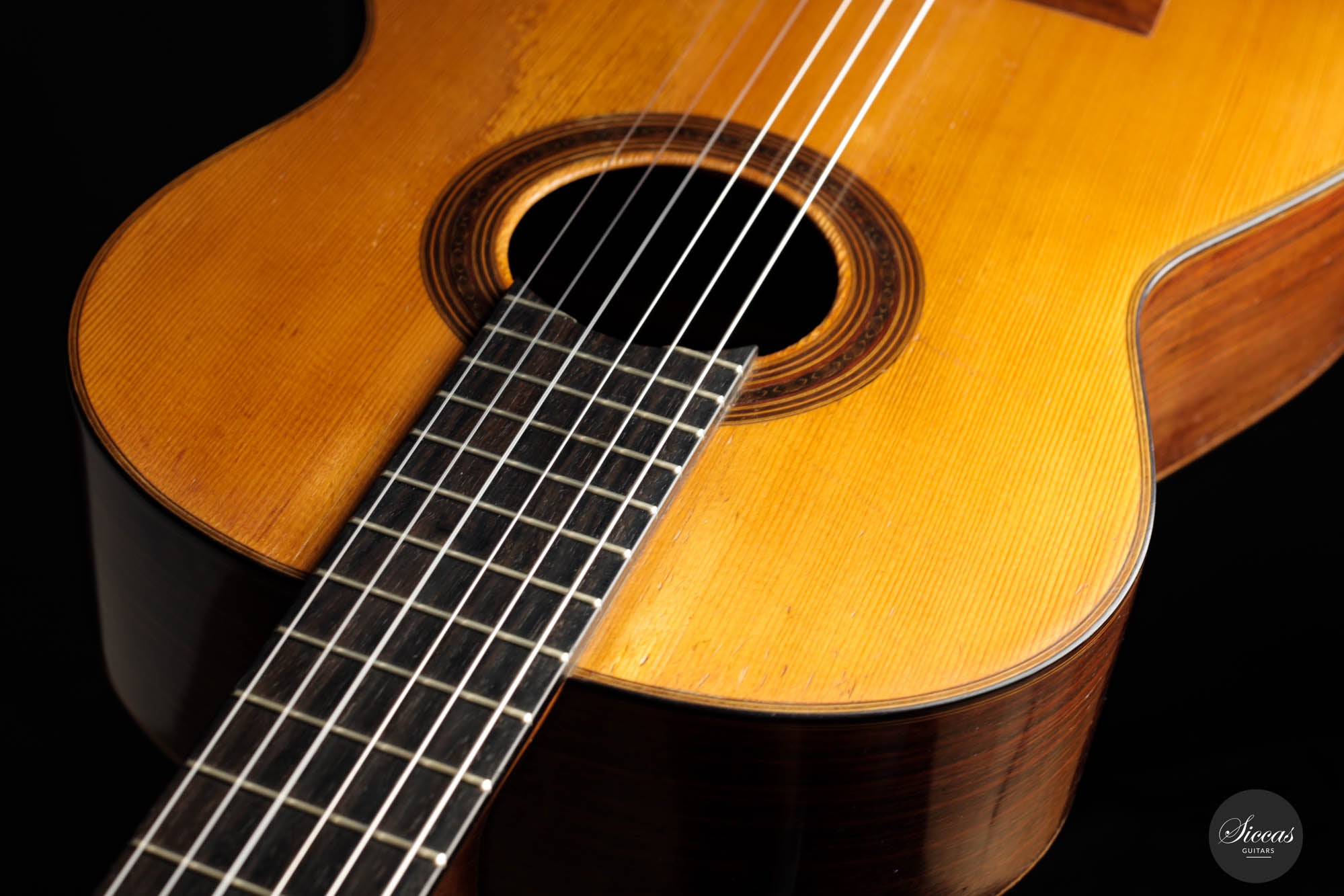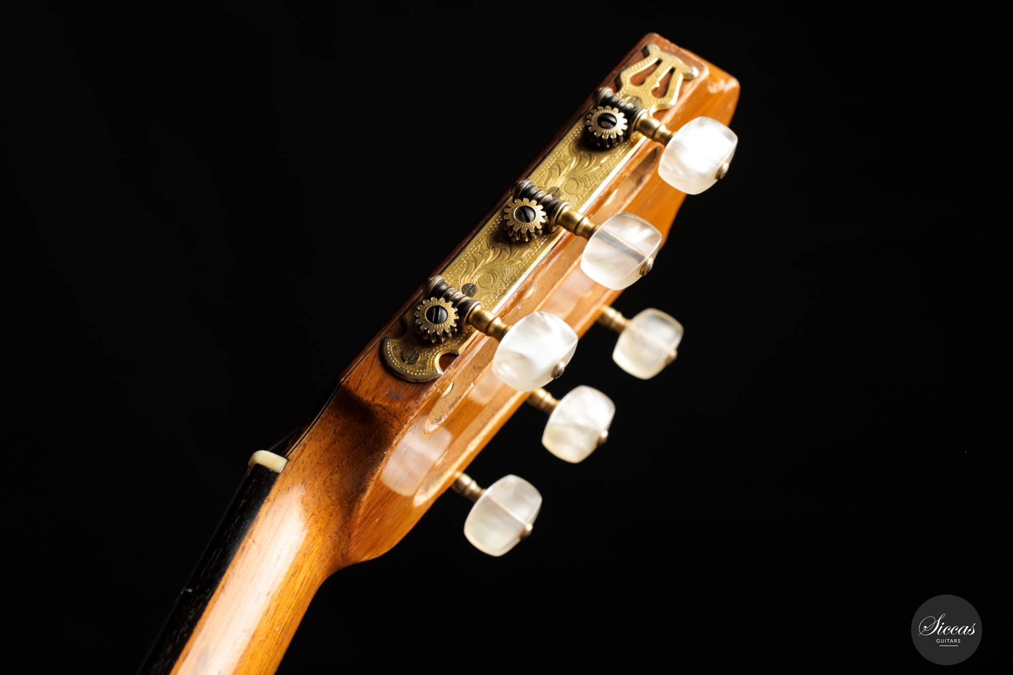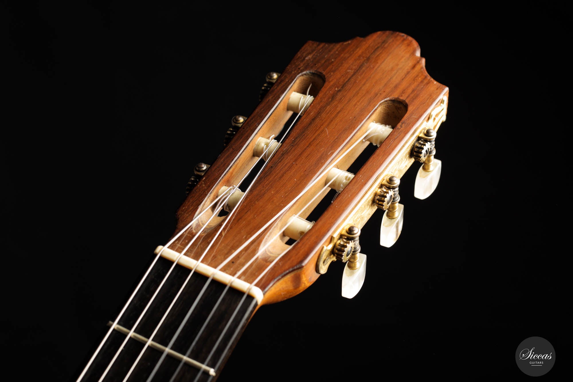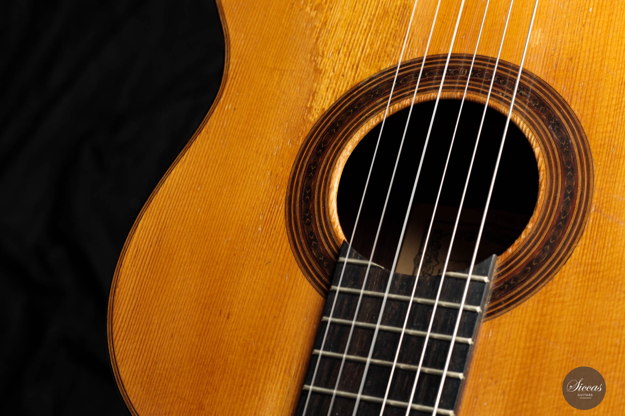 Daniel Friederich - 1968 - Récital Modell ist ein außergewöhnliches Instrument mit warmem, tiefem Klangcharakter und intensiver Schwingung. Die Zederndecke und doppelseitigen Zargen verleihen ihm eine reiche Klangfülle und ein lebendiges Timbre, während der schlanke, abgerundete Hals für hohen Spielkomfort sorgt. Trotz sorgfältig reparierter Altersmerkmale bleibt die Gitarre ein authentisches Zeugnis von Friederichs Meisterschaft. Mit originalem Lack und Etikett aus Paris ist sie nicht nur ein Konzertinstrument, sondern auch ein bedeutendes Sammlerstück aus der Hand eines der einflussreichsten Gitarrenbauer des 20. Jahrhunderts.