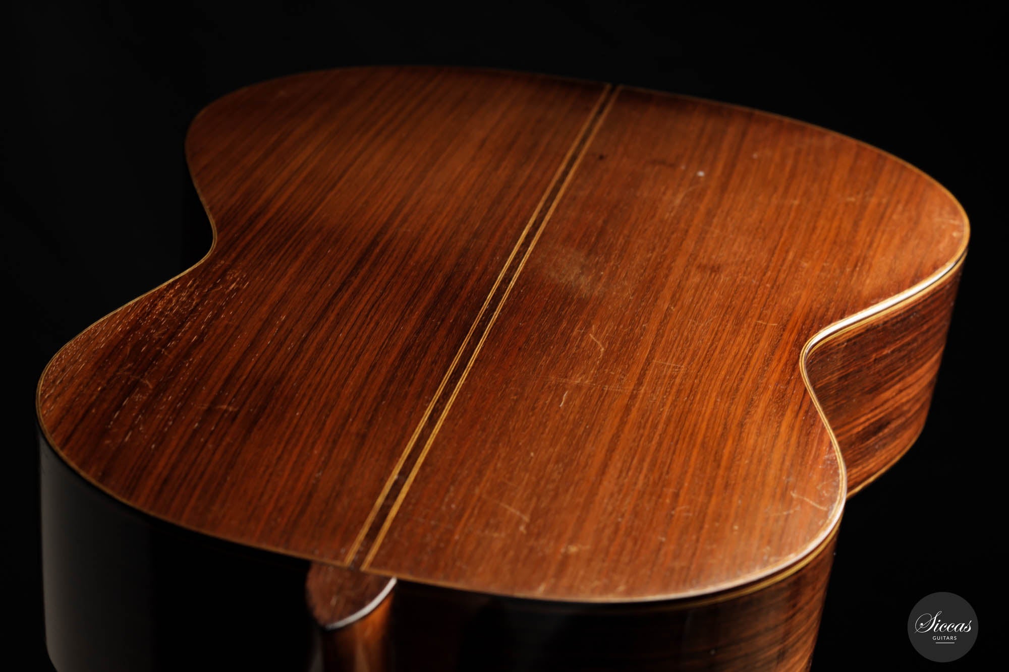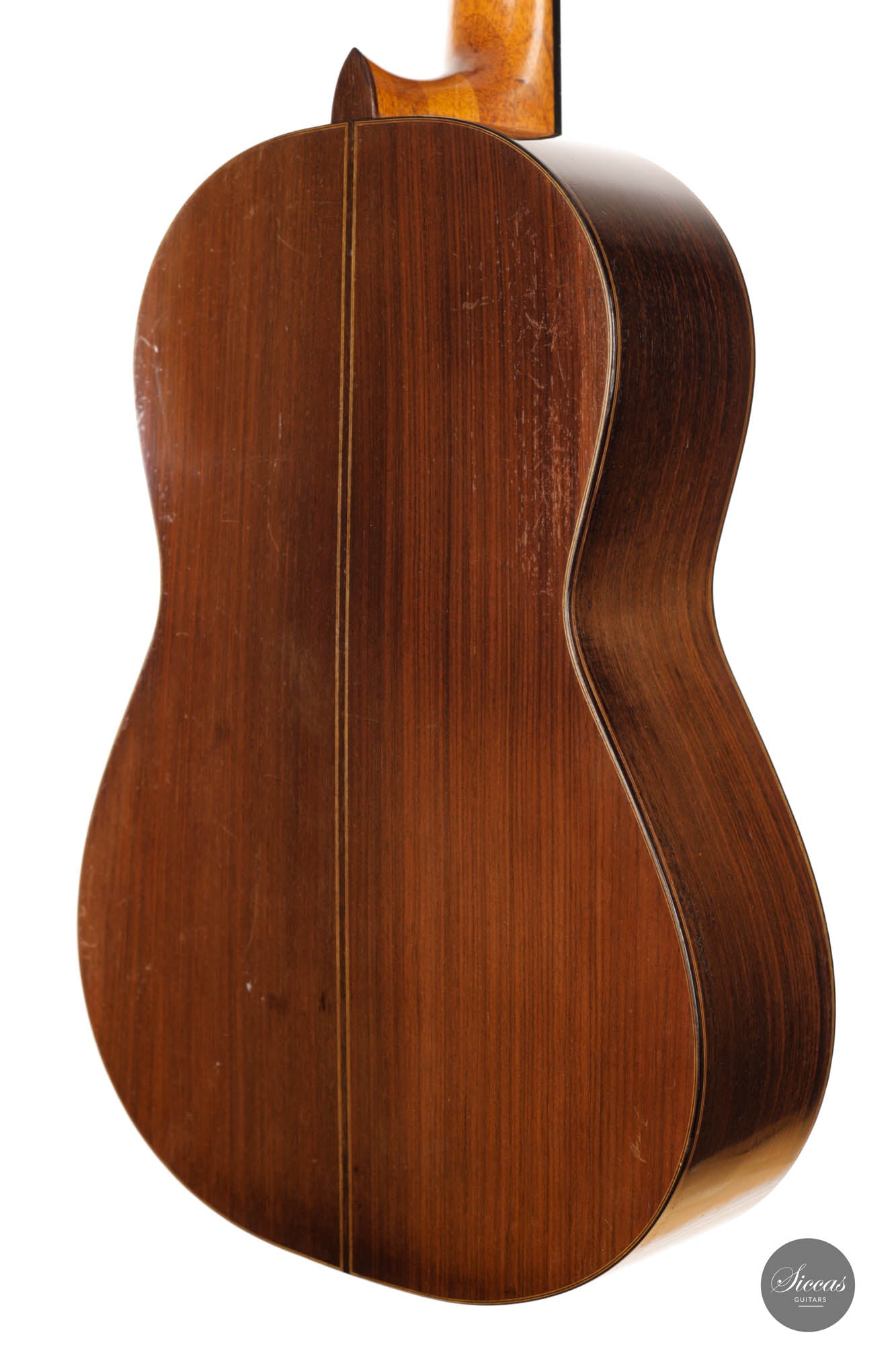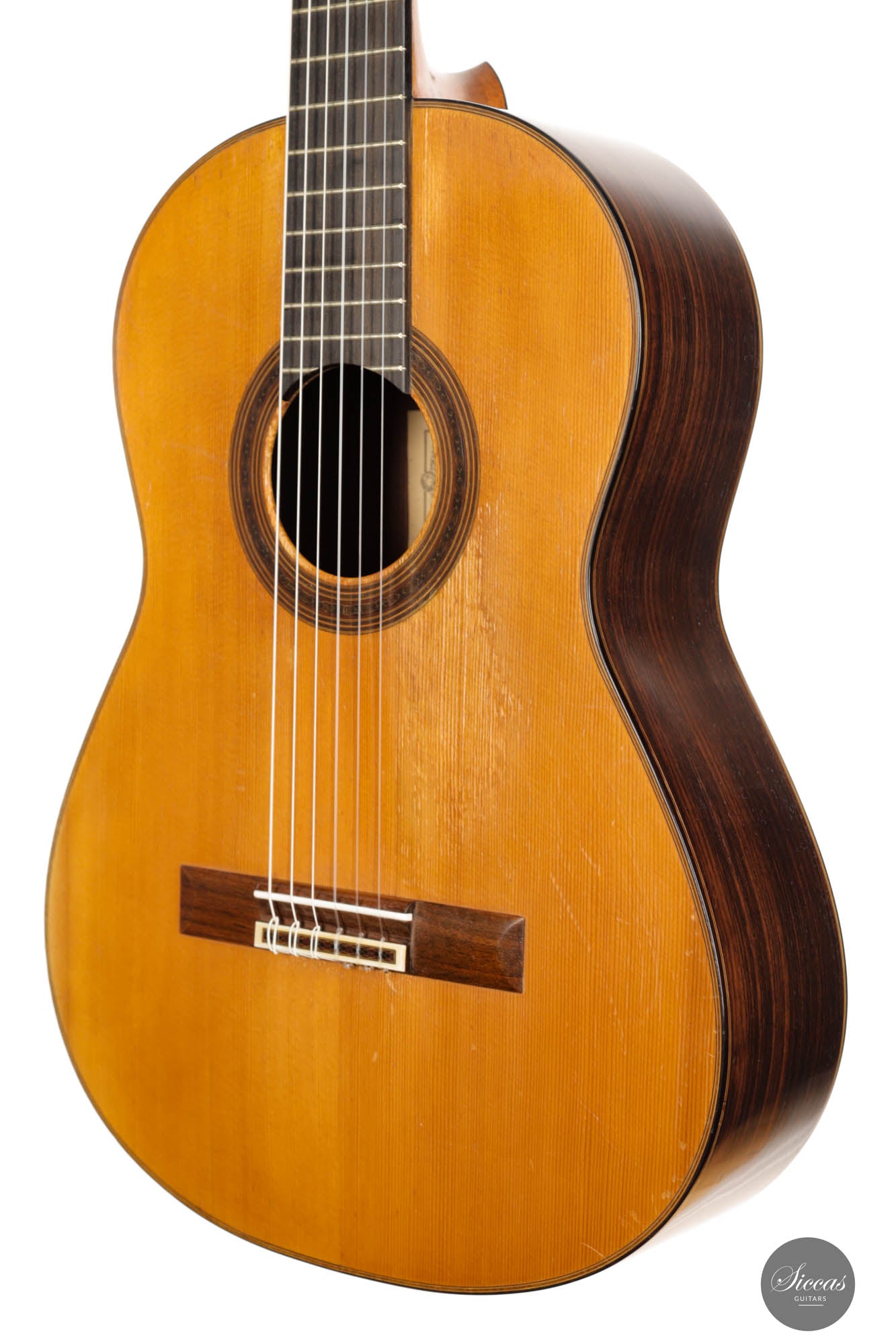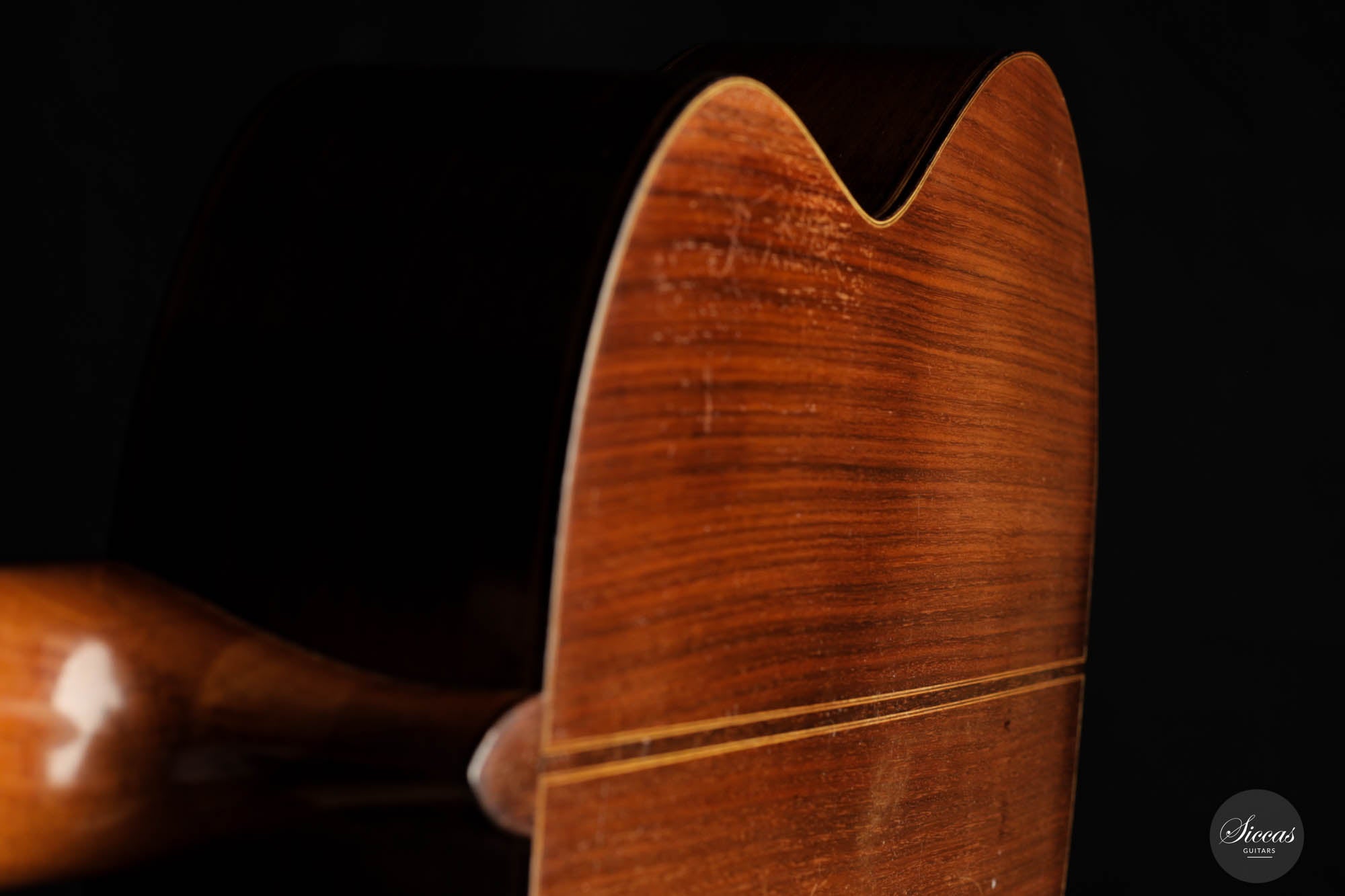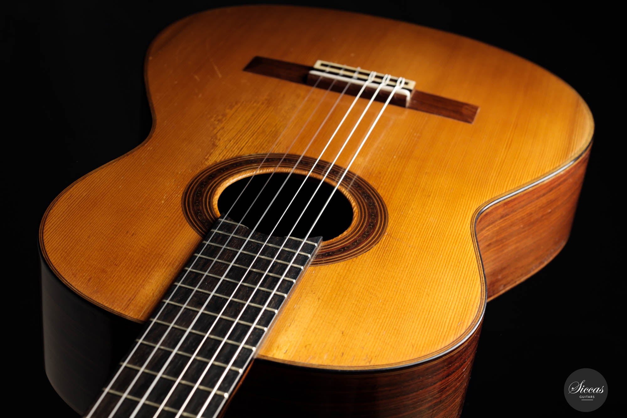 Daniel Friederich - 1968 - Récital Modell ist ein außergewöhnliches Instrument mit warmem, tiefem Klangcharakter und intensiver Schwingung. Die Zederndecke und doppelseitigen Zargen verleihen ihm eine reiche Klangfülle und ein lebendiges Timbre, während der schlanke, abgerundete Hals für hohen Spielkomfort sorgt. Trotz sorgfältig reparierter Altersmerkmale bleibt die Gitarre ein authentisches Zeugnis von Friederichs Meisterschaft. Mit originalem Lack und Etikett aus Paris ist sie nicht nur ein Konzertinstrument, sondern auch ein bedeutendes Sammlerstück aus der Hand eines der einflussreichsten Gitarrenbauer des 20. Jahrhunderts.