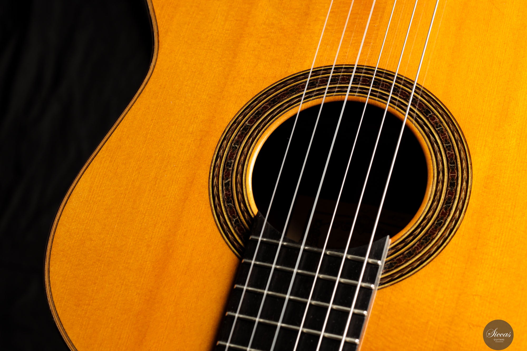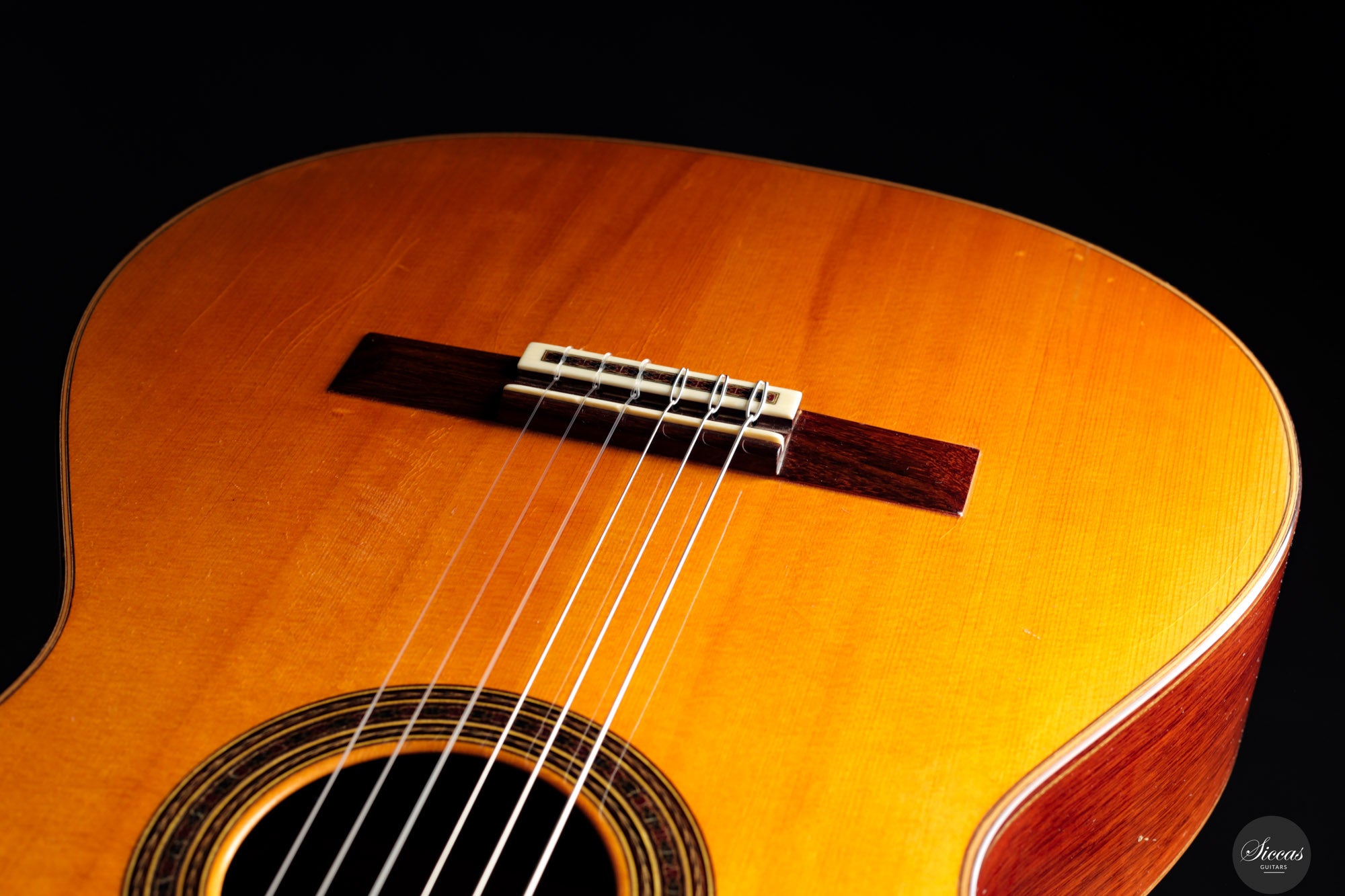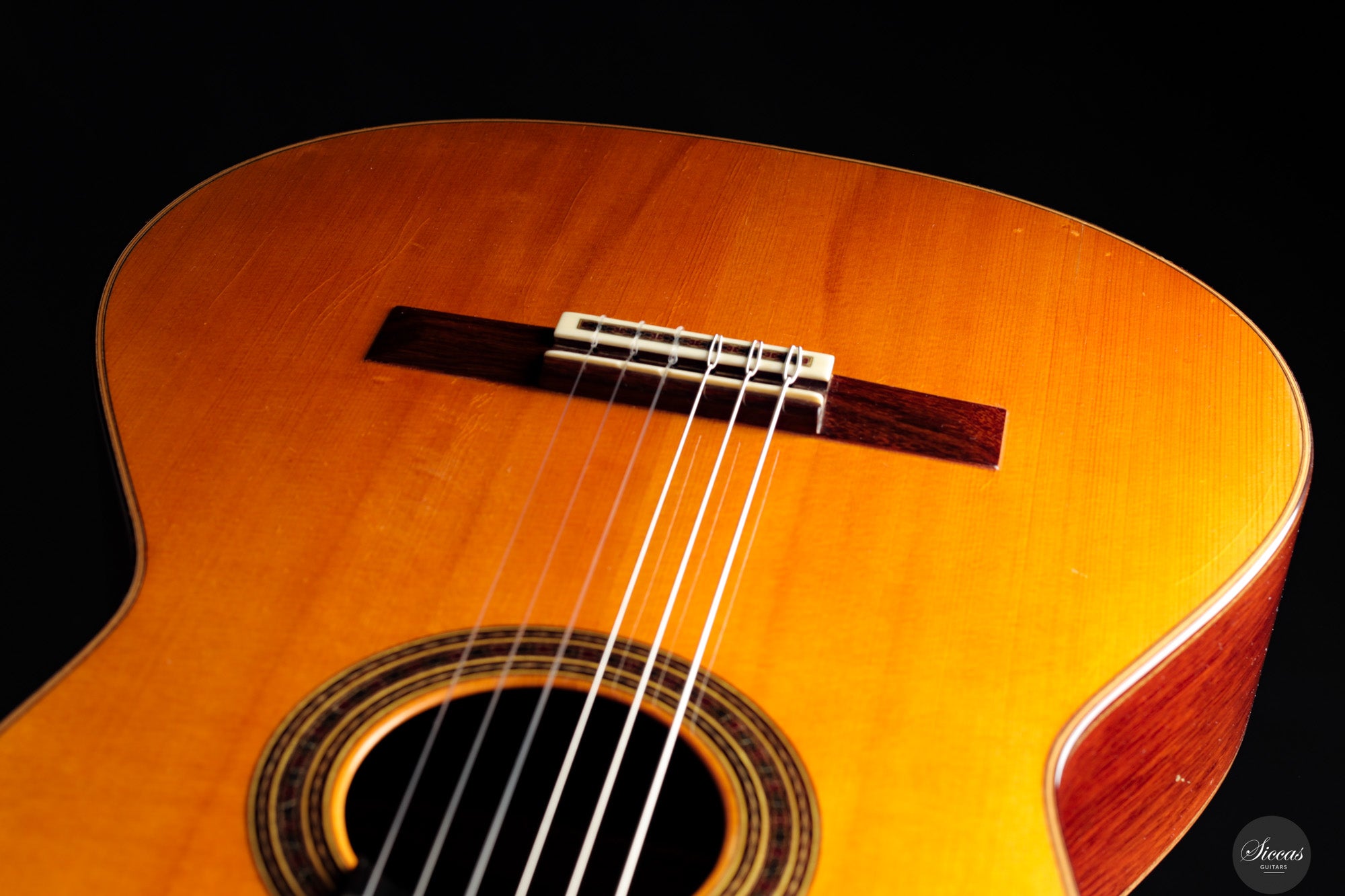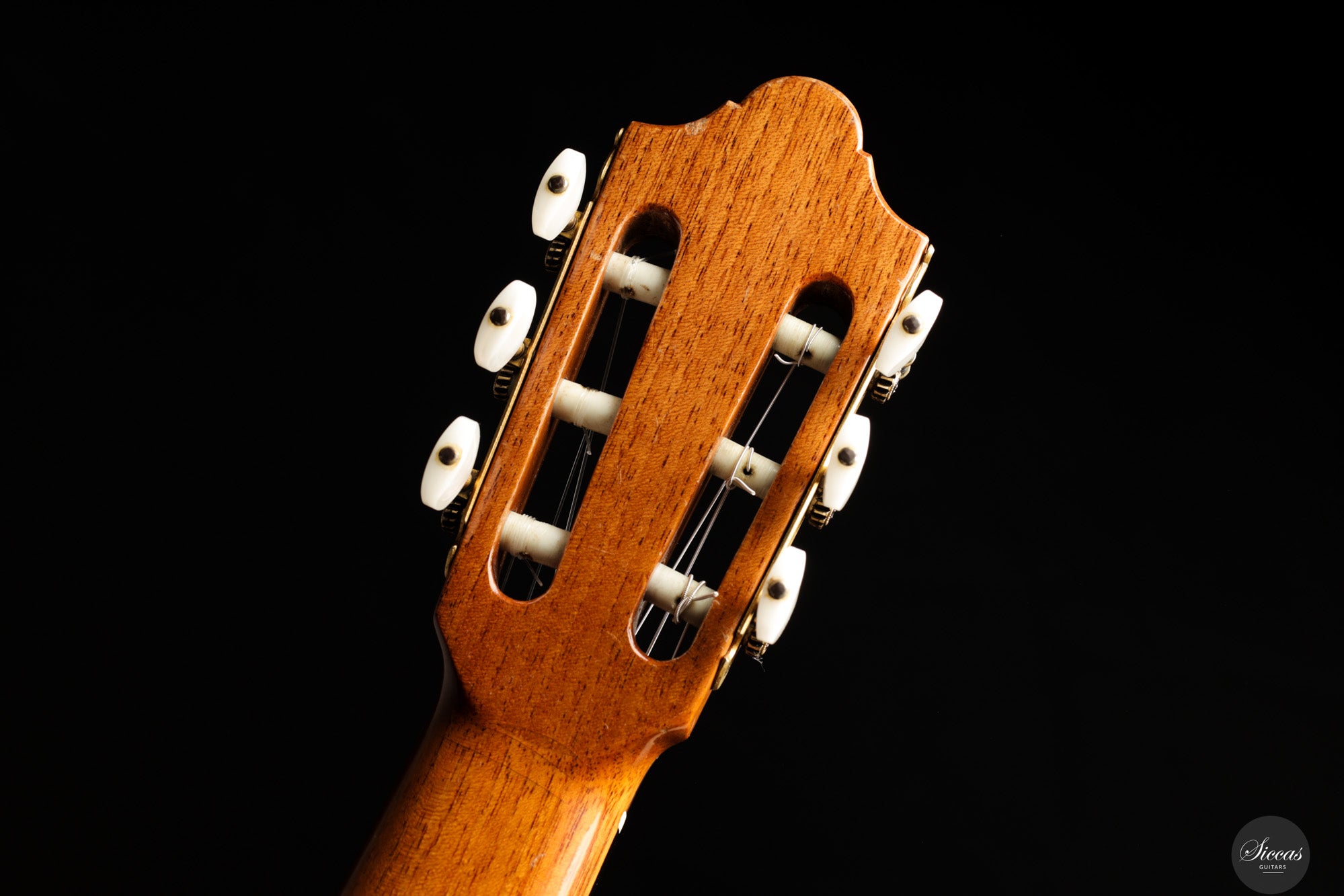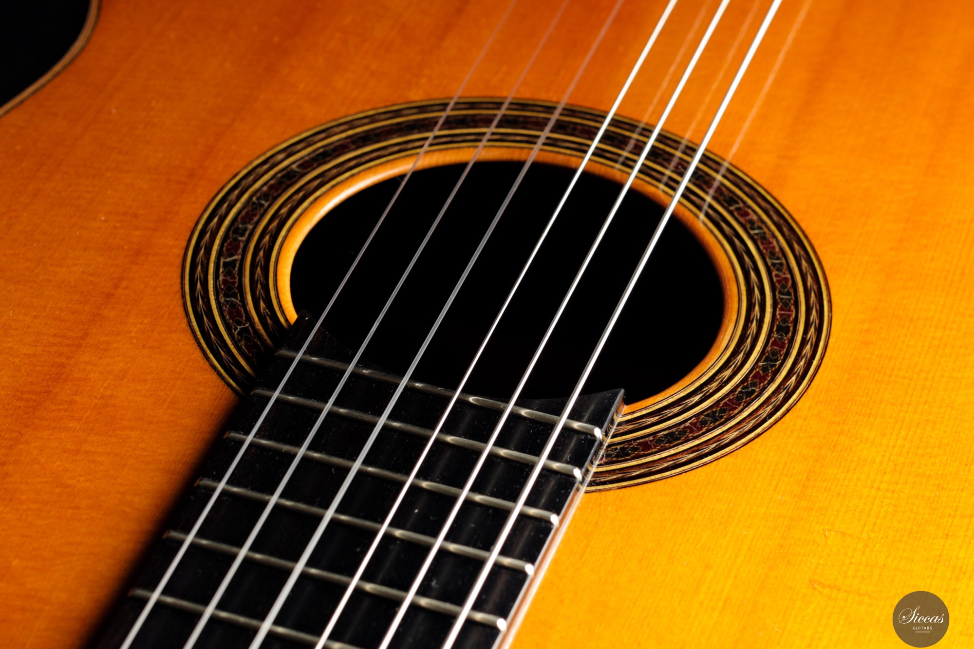 Dieses Konzertmodell aus dem Jahr 1972 stammt aus einer der angesehensten Schaffensphasen von Daniel Friederich. Die Gitarre ist traditionell gebaut mit einer Fichtendecke sowie Boden und Zargen aus indischem Palisander und vollständig mit Nitrozelluloselack versehen. Das vergleichsweise höhere Gewicht ist auf die doppelte Zargenkonstruktion zurückzuführen, die zu Volumen und Projektion beiträgt.. Die handwerkliche Ausführung ist bewusst zurückhaltend und ganz auf Funktion und klangliche Integrität ausgerichtet. Fustero Mechaniken sorgen für zuverlässige und elegante Stimmung.