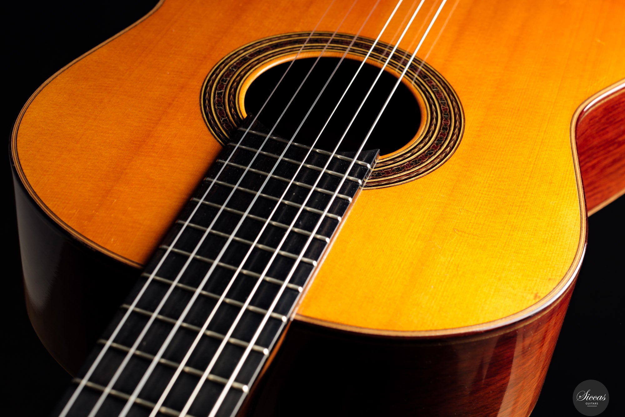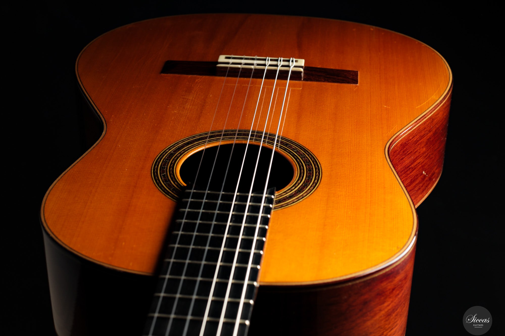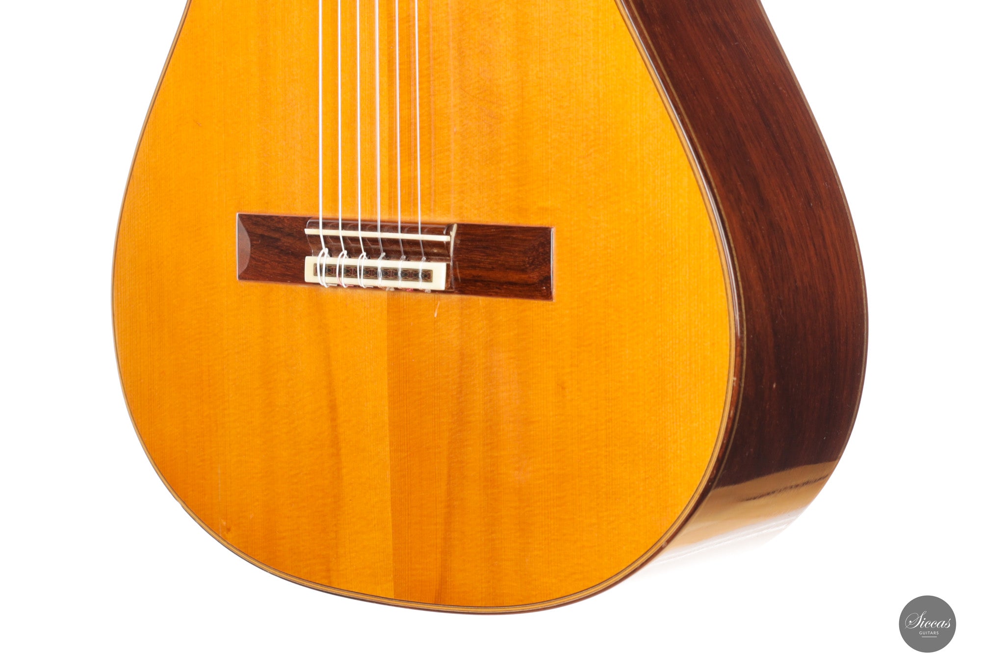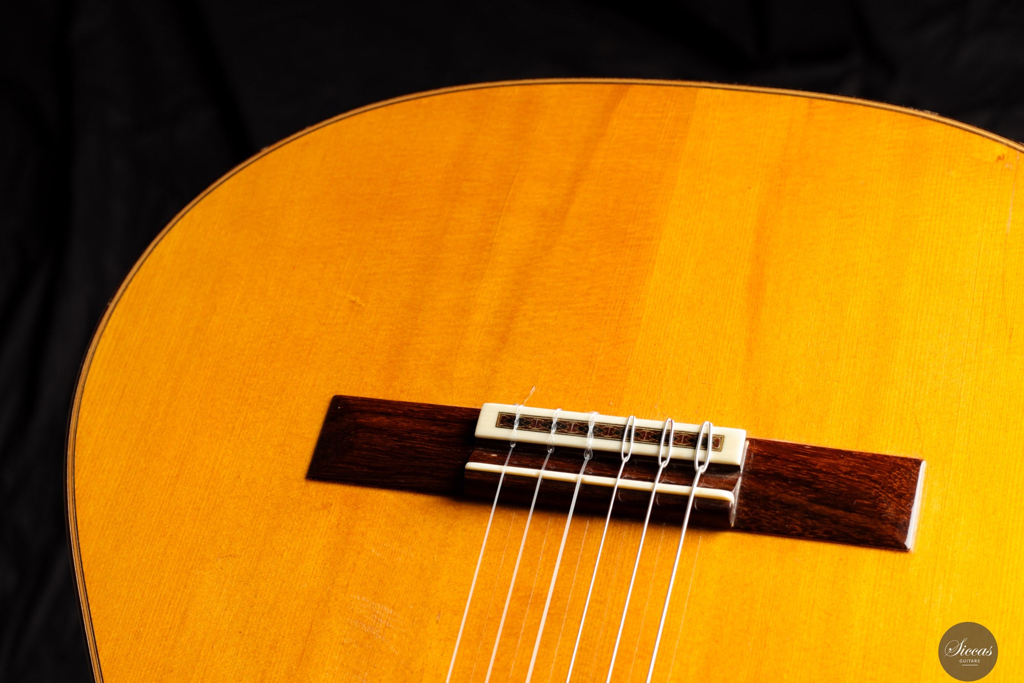Dieses Konzertmodell aus dem Jahr 1972 stammt aus einer der angesehensten Schaffensphasen von Daniel Friederich. Die Gitarre ist traditionell gebaut mit einer Fichtendecke sowie Boden und Zargen aus indischem Palisander und vollständig mit Nitrozelluloselack versehen. Das vergleichsweise höhere Gewicht ist auf die doppelte Zargenkonstruktion zurückzuführen, die zu Volumen und Projektion beiträgt.. Die handwerkliche Ausführung ist bewusst zurückhaltend und ganz auf Funktion und klangliche Integrität ausgerichtet. Fustero Mechaniken sorgen für zuverlässige und elegante Stimmung.