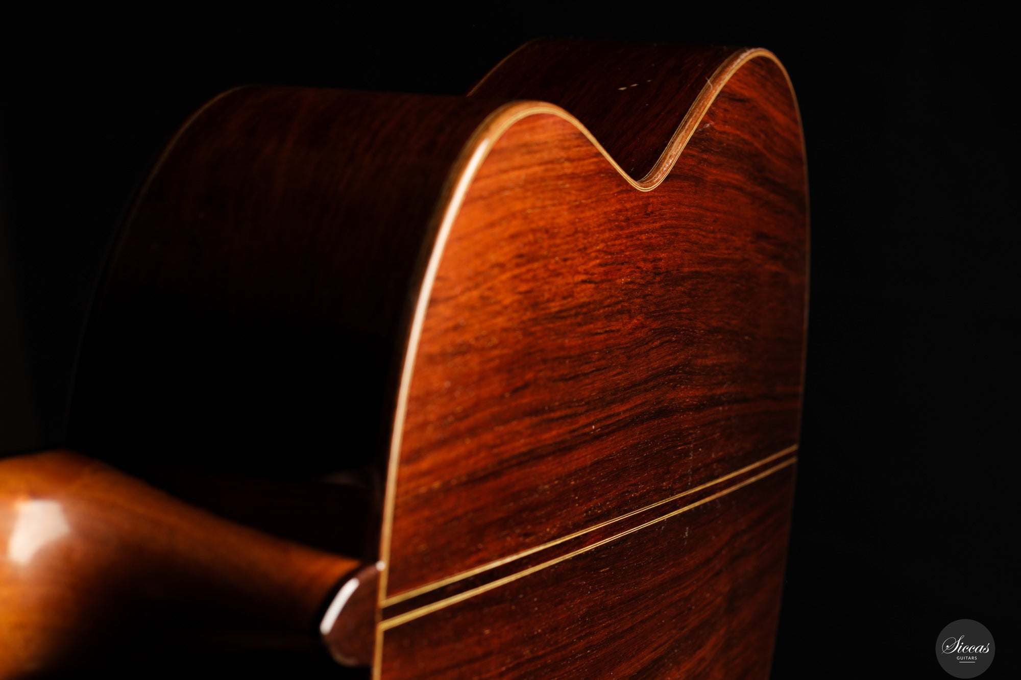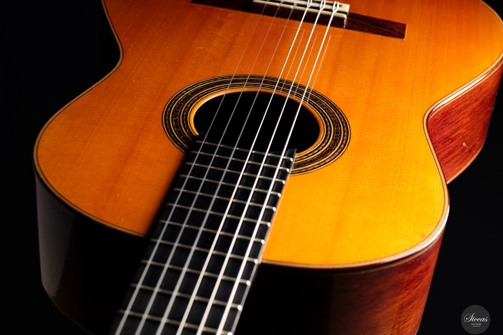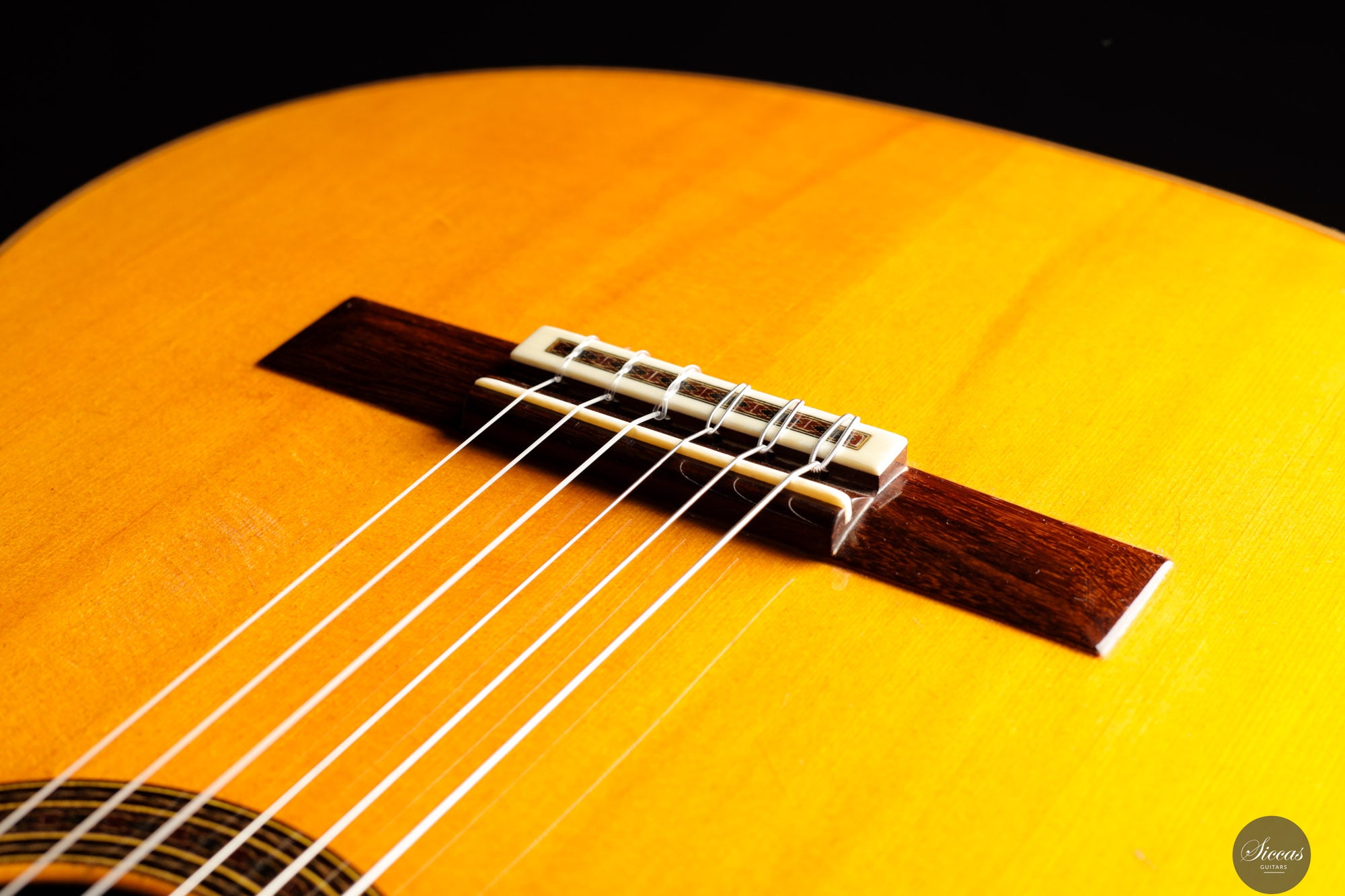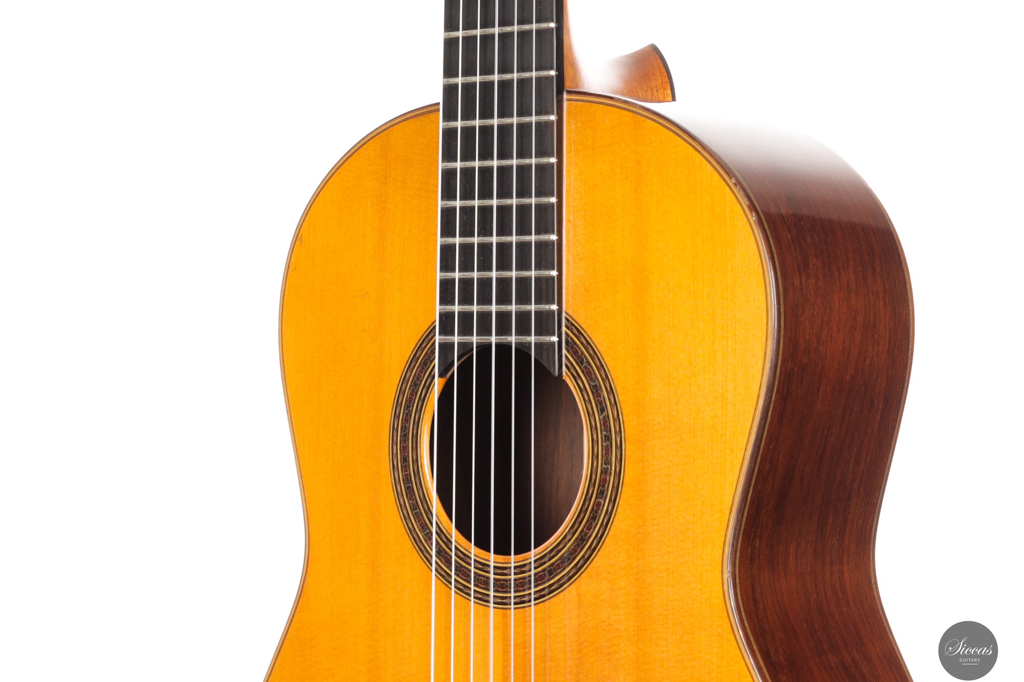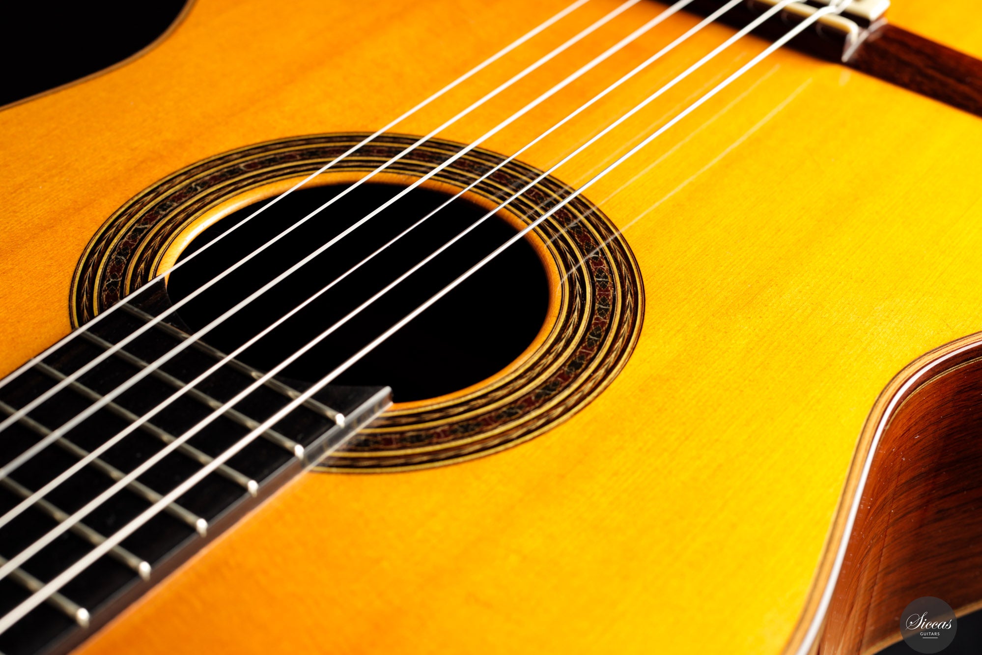 Dieses Konzertmodell aus dem Jahr 1972 stammt aus einer der angesehensten Schaffensphasen von Daniel Friederich. Die Gitarre ist traditionell gebaut mit einer Fichtendecke sowie Boden und Zargen aus indischem Palisander und vollständig mit Nitrozelluloselack versehen. Das vergleichsweise höhere Gewicht ist auf die doppelte Zargenkonstruktion zurückzuführen, die zu Volumen und Projektion beiträgt.. Die handwerkliche Ausführung ist bewusst zurückhaltend und ganz auf Funktion und klangliche Integrität ausgerichtet. Fustero Mechaniken sorgen für zuverlässige und elegante Stimmung.