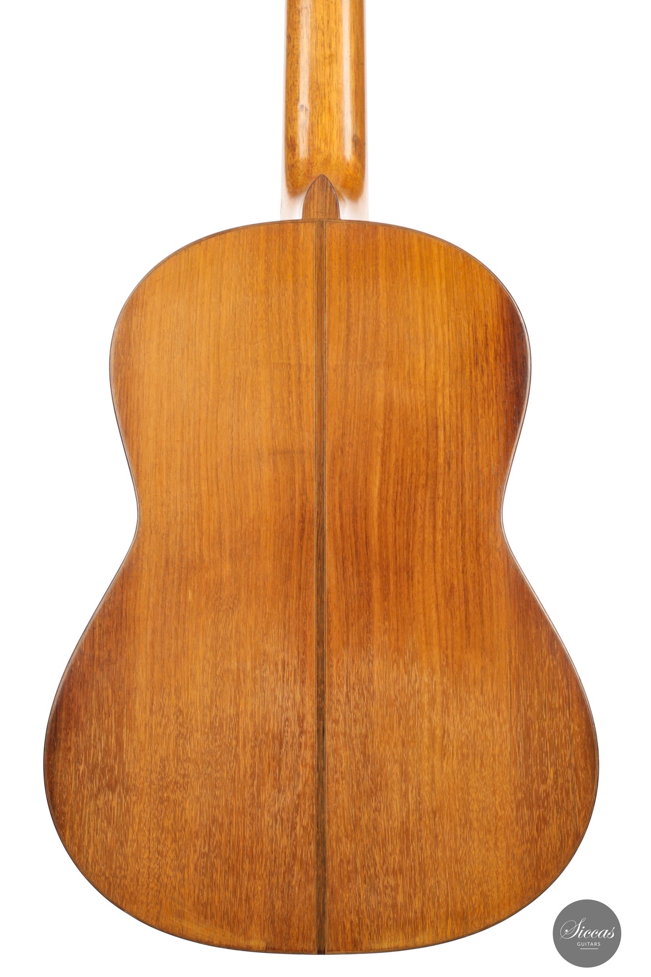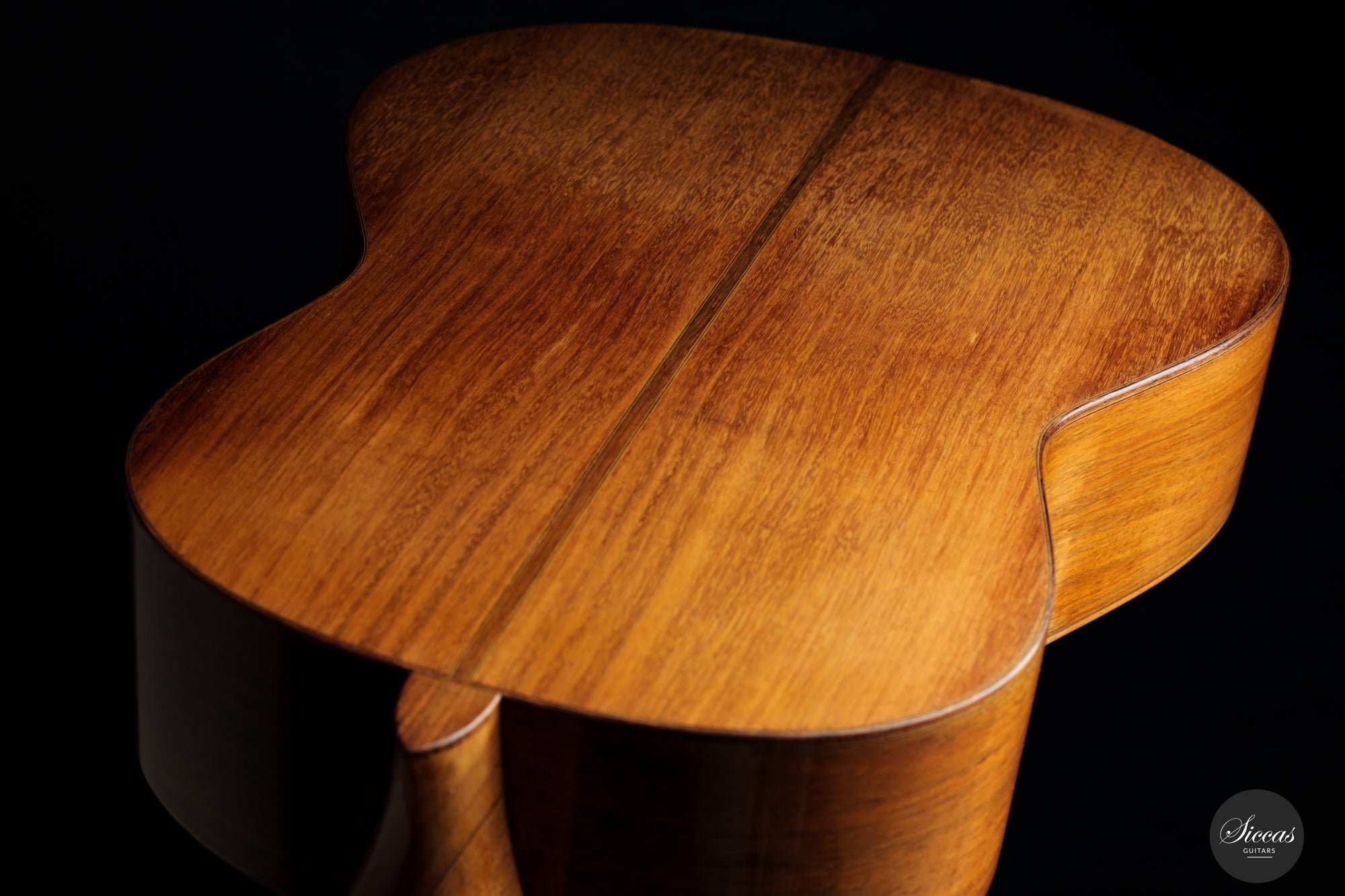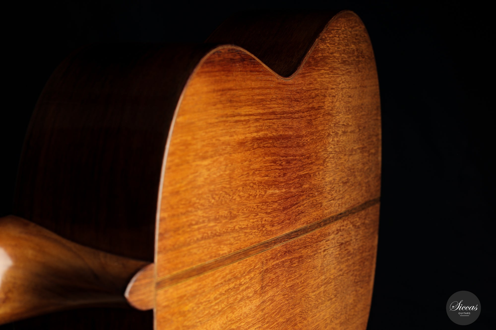 Während sein Klang ätherisch ist, spricht sein Bau von irdischer Handwerkskunst. Er bezeugt die Prüfungen der Zeit mit einem fachmännisch reparierten Riss in seiner Decke. Die Rückseite, geschnitzt aus dem renommierten CITES-zertifizierten brasilianischen Rosenholz, zeigt einen oberflächlich ausgebesserten Riss. Dennoch schmälern diese Narben in keiner Weise seine Integrität oder klangliche Kraft. Ein bemerkenswertes Konstruktionsmerkmal ist Friederichs geniales Doppelseitendesign, das die Innenseiten mit einer zusätzlichen Schicht Rosenholz auslegt, was seine Haltbarkeit und akustische Resonanz erhöht.