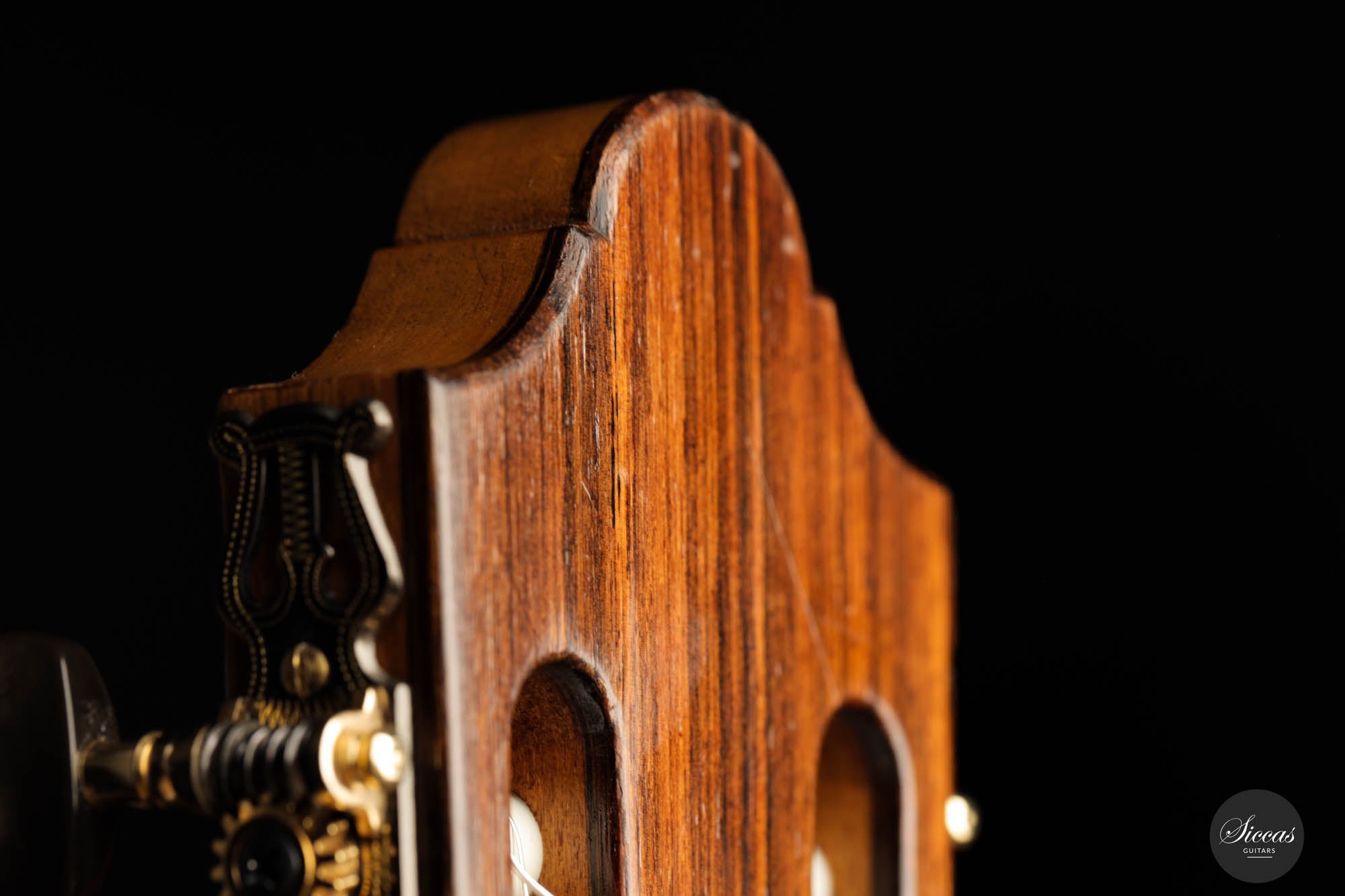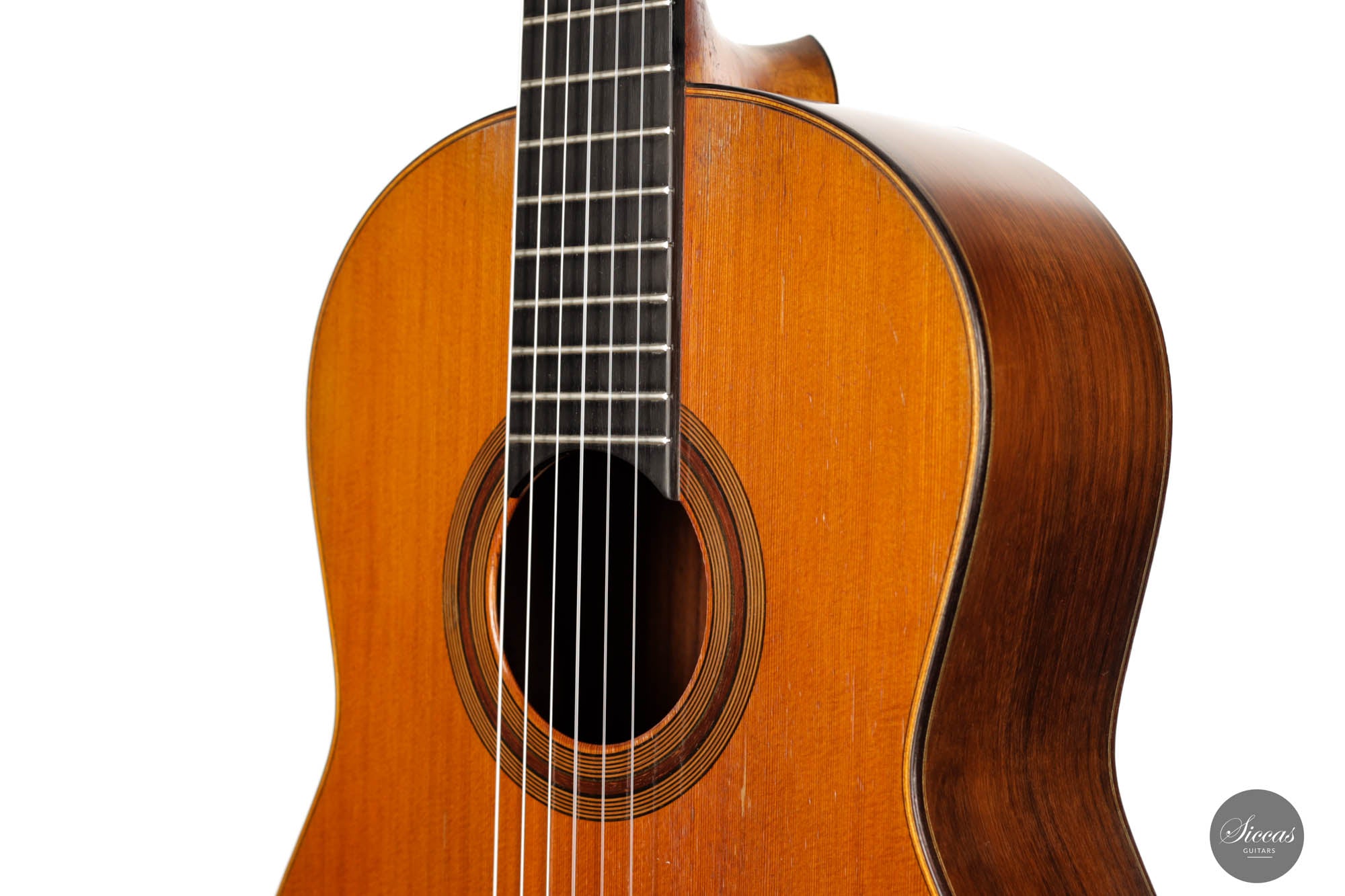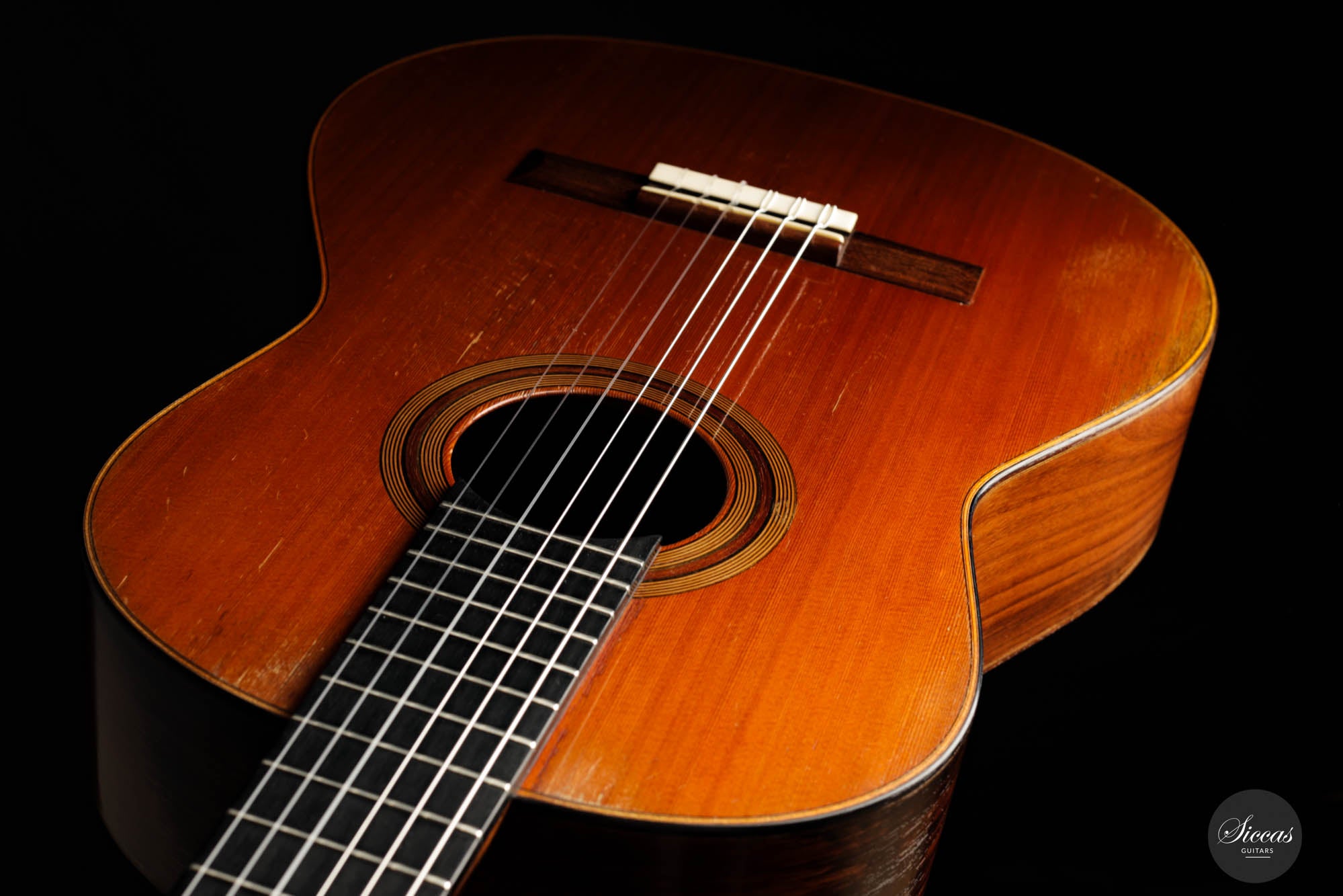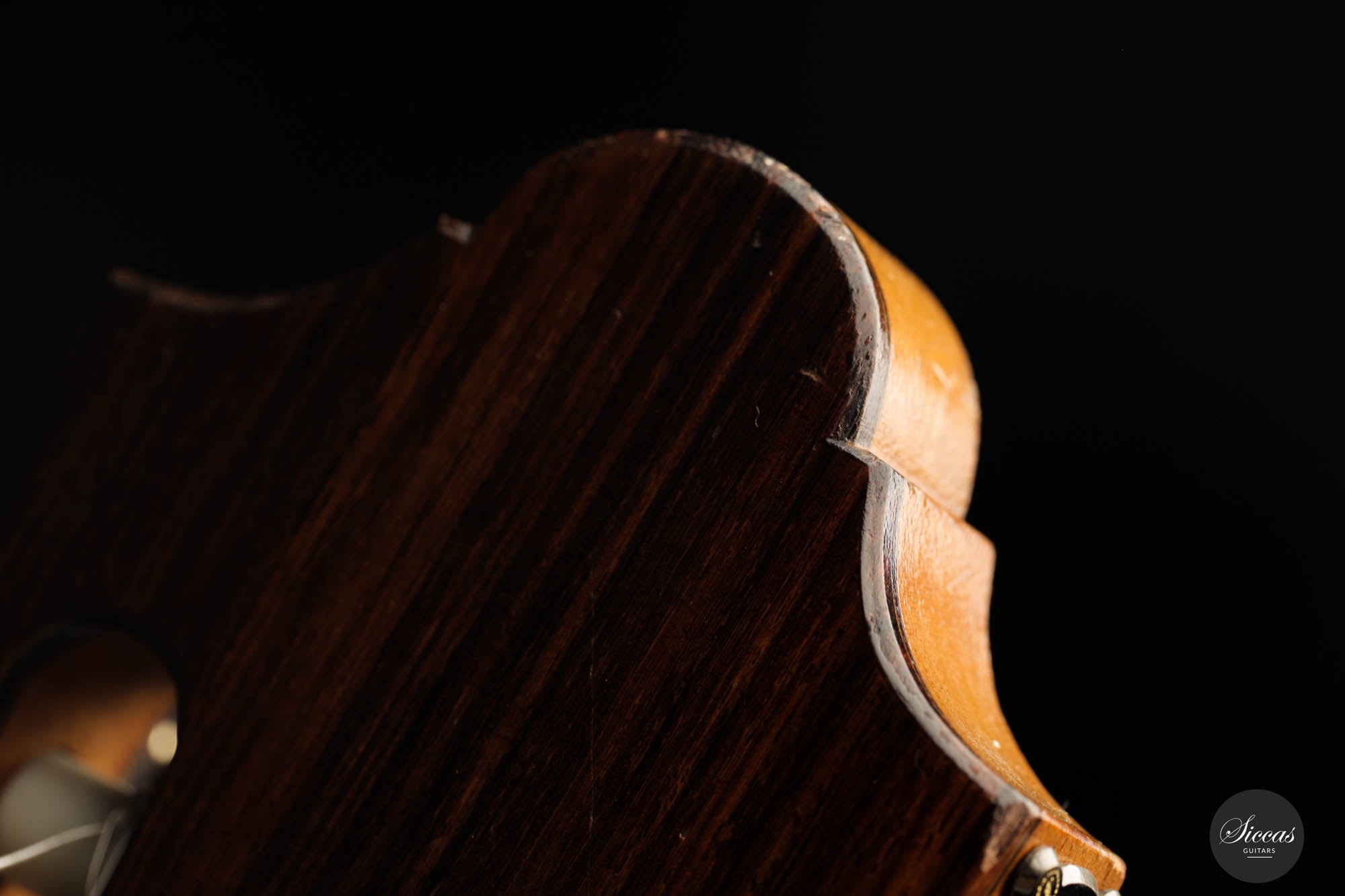 Die Gitarre bietet einige besondere Merkmale. Der ungeschnitzte Kopf, die schlichten Knochendekorationen auf dem Steg und eine mehrfarbige hölzerne Rosette, die die Schallloch umgibt, verleihen ihr einen einzigartigen Charme. Zur Verstärkung der Decke dienen sieben Fächerstreben und eine zierliche diagonale Strebe auf der Bassseite des unteren Korpus.