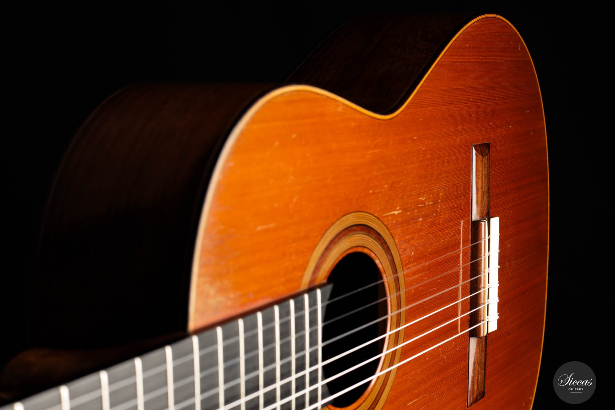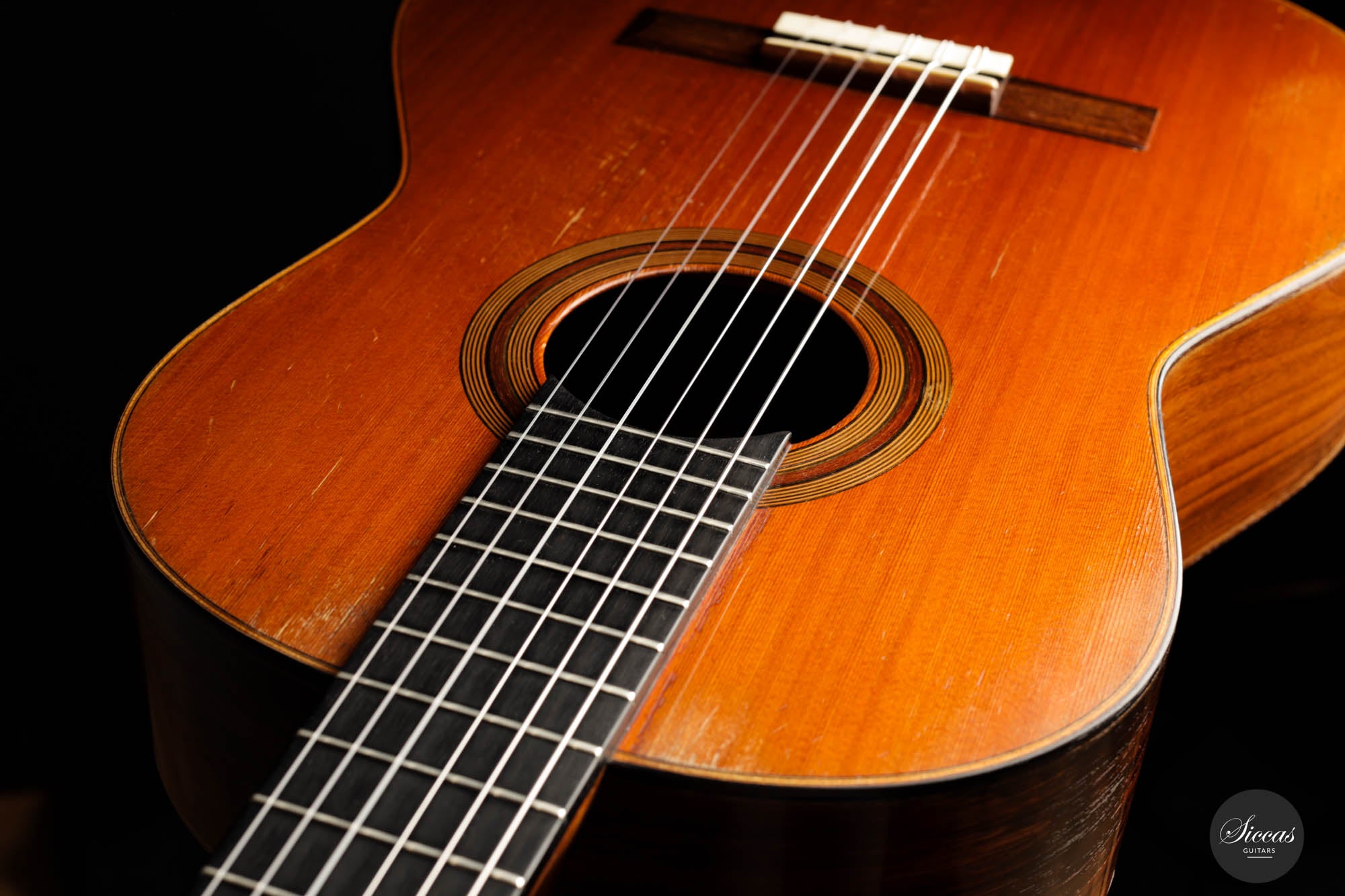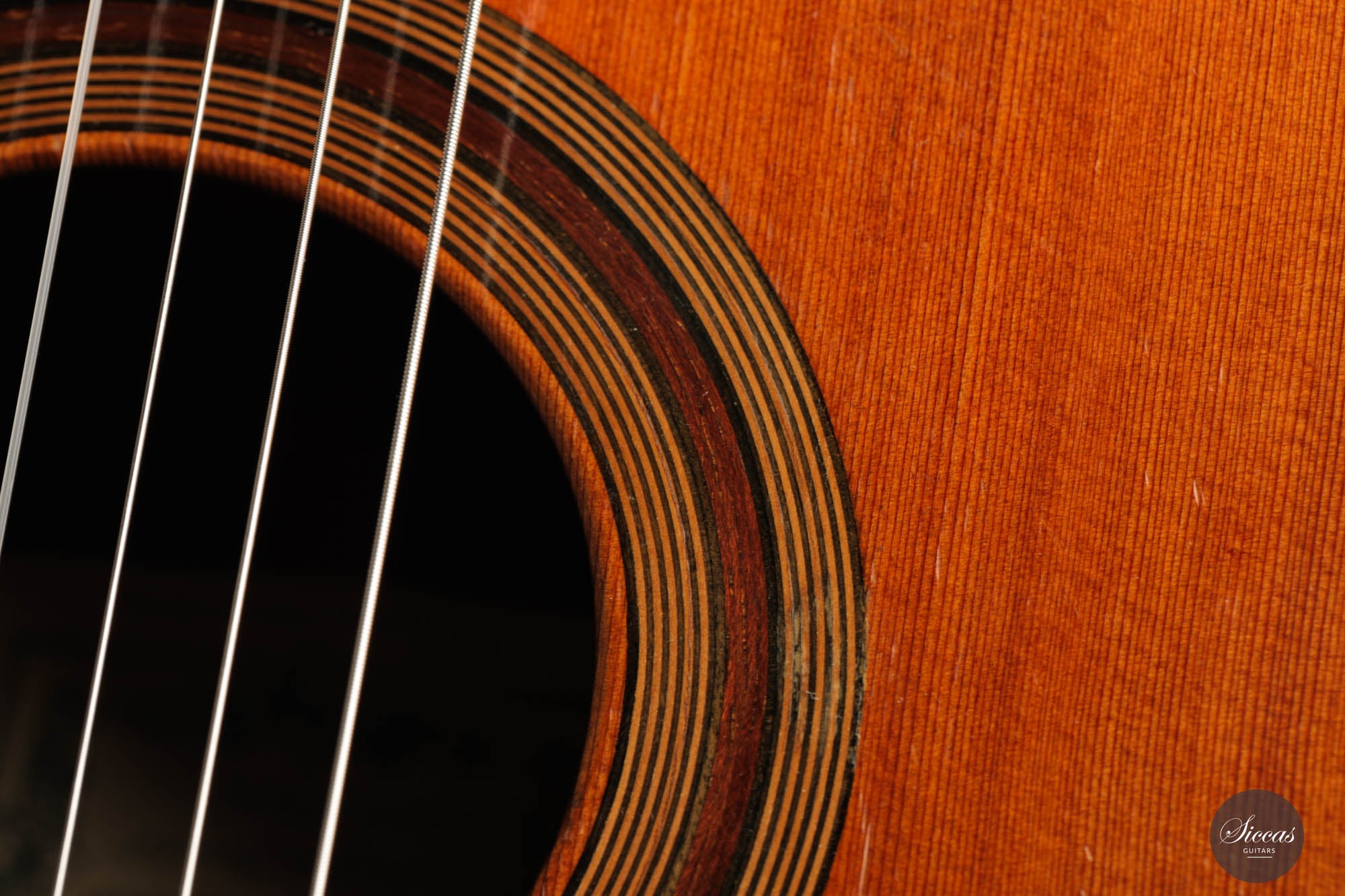 Die Gitarre bietet einige besondere Merkmale. Der ungeschnitzte Kopf, die schlichten Knochendekorationen auf dem Steg und eine mehrfarbige hölzerne Rosette, die die Schallloch umgibt, verleihen ihr einen einzigartigen Charme. Zur Verstärkung der Decke dienen sieben Fächerstreben und eine zierliche diagonale Strebe auf der Bassseite des unteren Korpus.