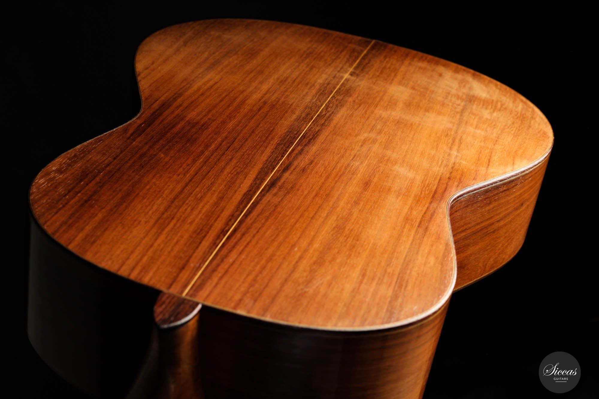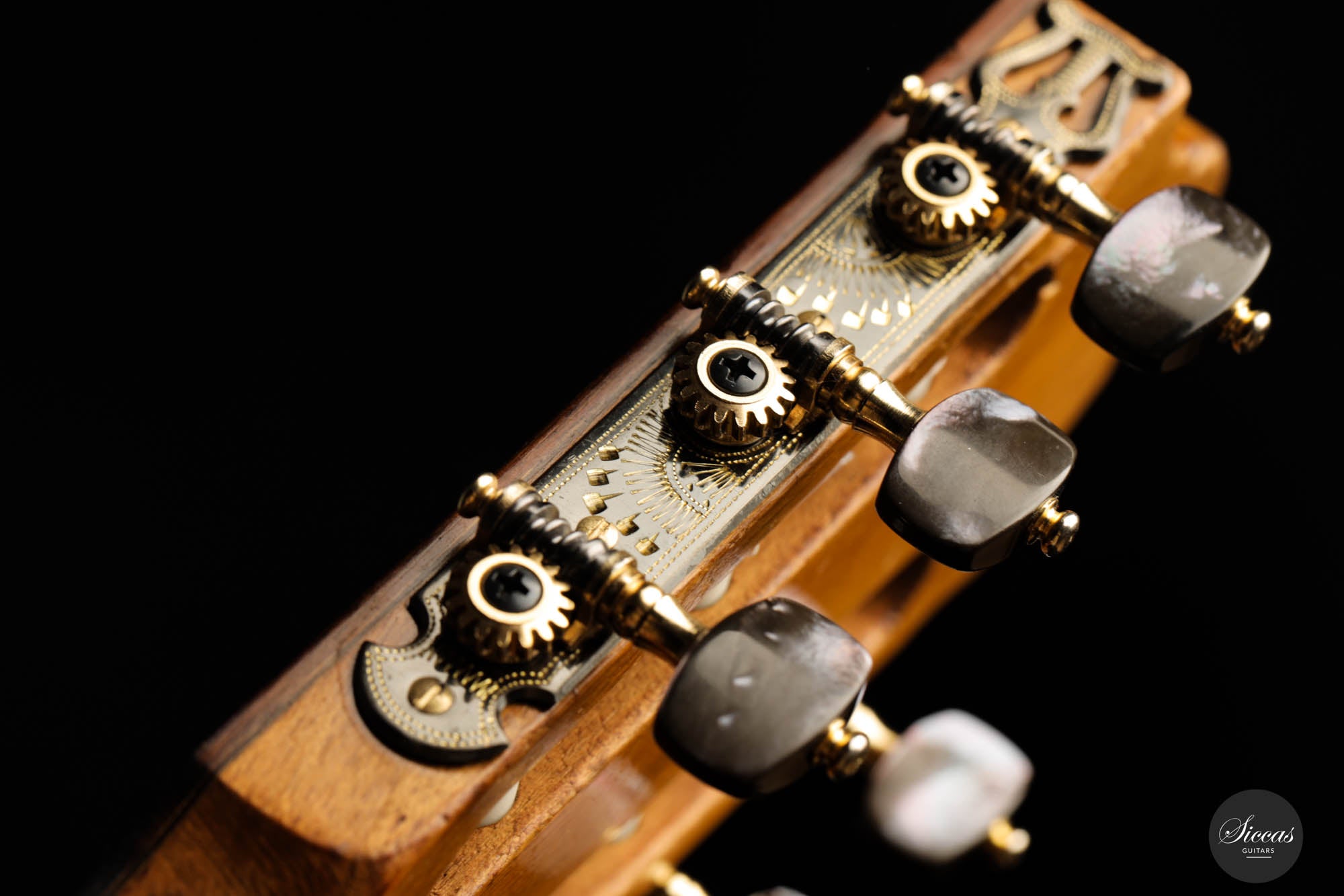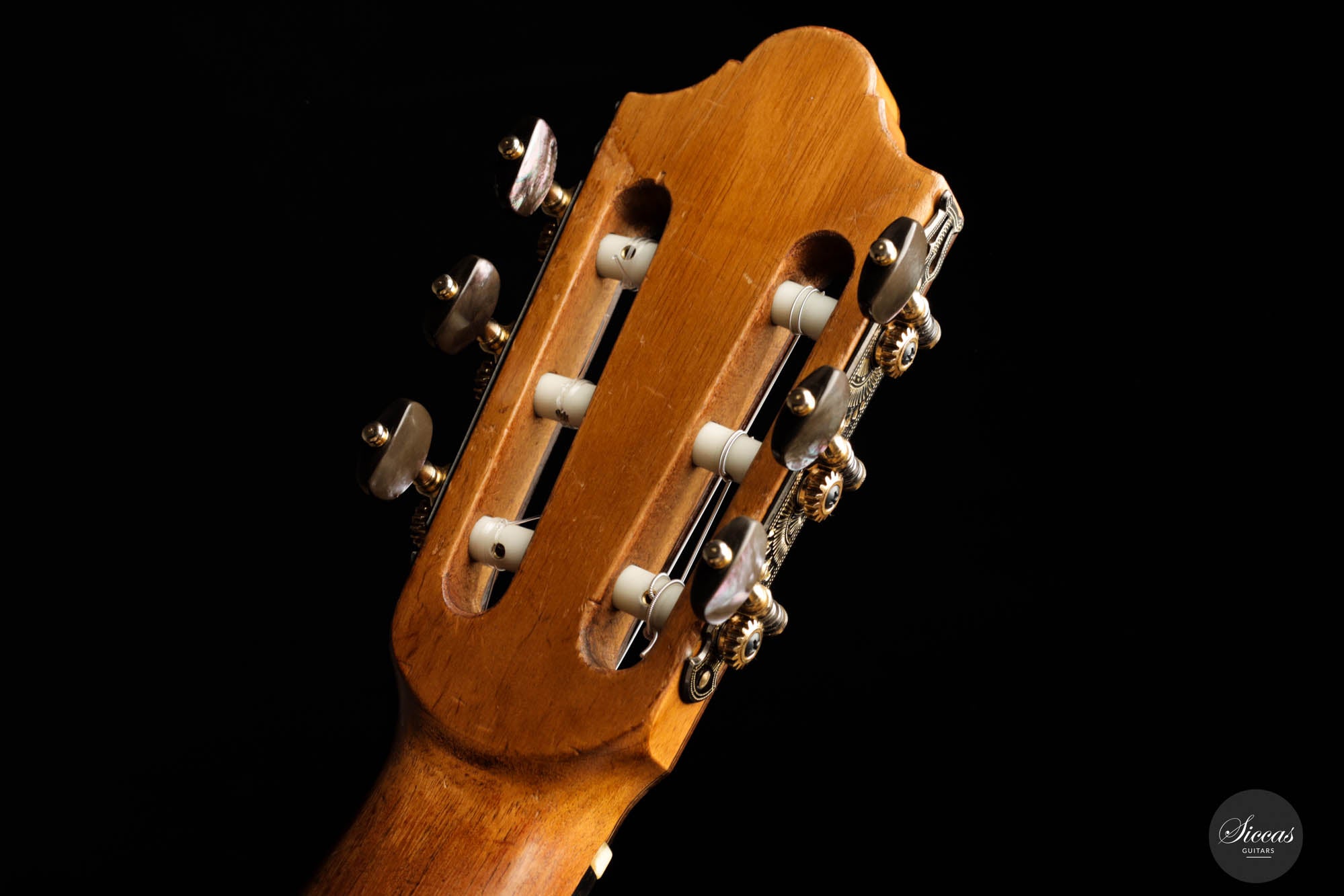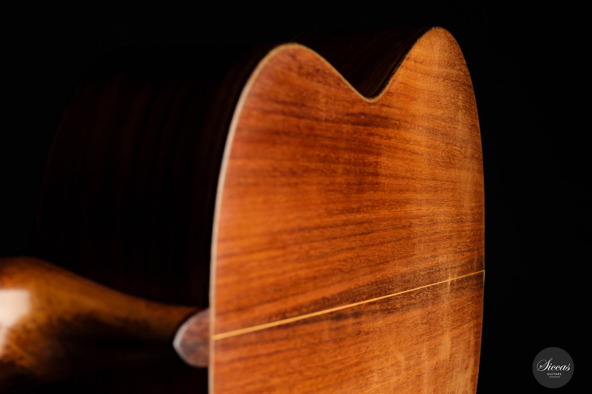 Die Gitarre bietet einige besondere Merkmale. Der ungeschnitzte Kopf, die schlichten Knochendekorationen auf dem Steg und eine mehrfarbige hölzerne Rosette, die die Schallloch umgibt, verleihen ihr einen einzigartigen Charme. Zur Verstärkung der Decke dienen sieben Fächerstreben und eine zierliche diagonale Strebe auf der Bassseite des unteren Korpus.