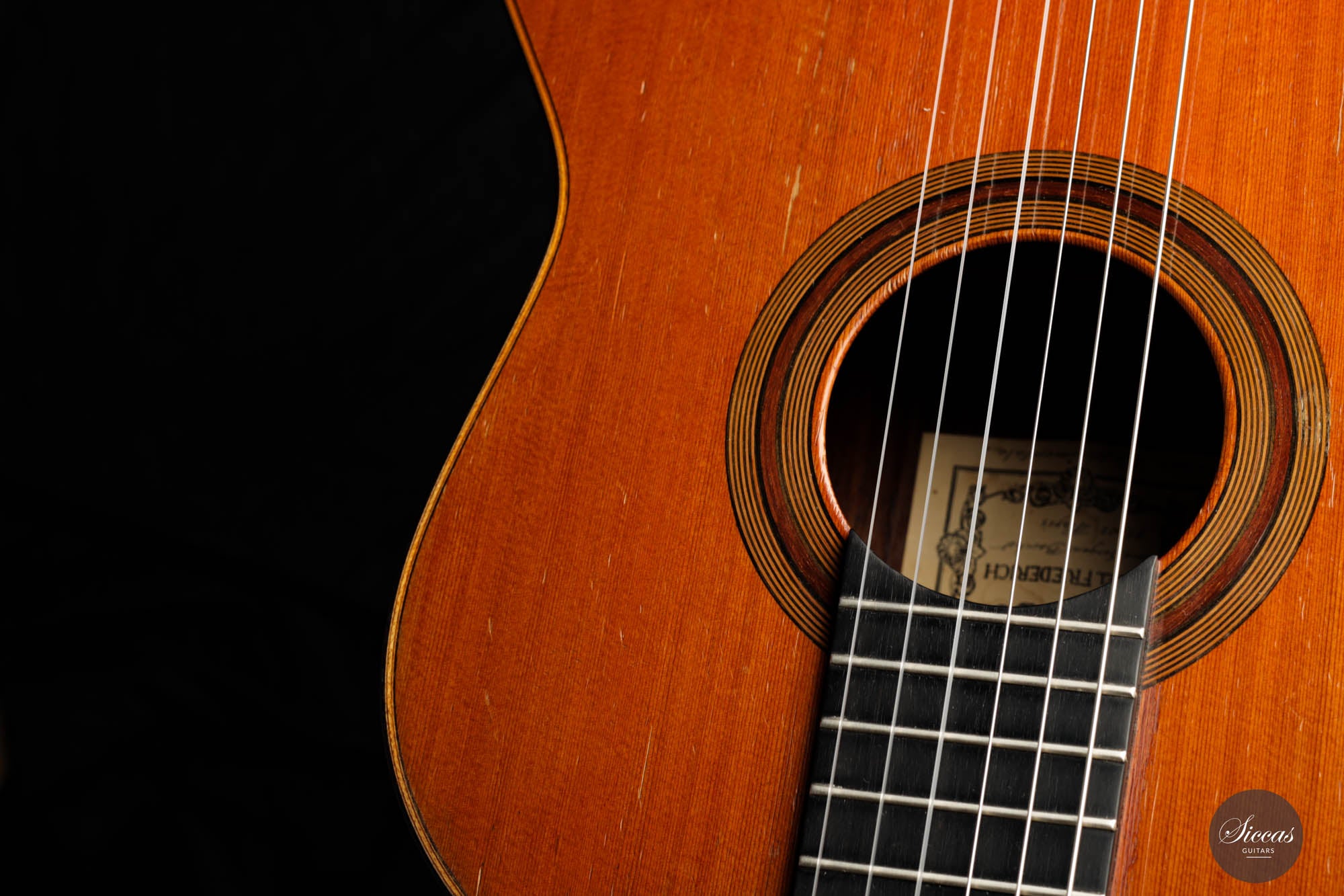 Daniel Friederich wurde am 16. Januar 1932 geboren und ist im Jahr 2020 verstorben. Obwohl er den festen Wunsch hatte Gitarre zu spielen, mangelte es ihm an Geld um sich ein Instrument zu kaufen. Doch im Alter von 23 Jahren löste Friederich dieses Dilemma, indem er seine erste Gitarre selbst baute: Eine Kopie einer Simplicio-Gitarre. Daniel Friederichs Gitarrenlehrer und hervorragender Gitarrenbauer, Christian Aubin, war ihm dabei eine große Hilfe. Nachdem er Werkzeuge selbst gebaut und einige Erfahrungen im Gitarrenbau gesammelt hatte, zeigte Daniel Friederich seine fünfzehnte Gitarre Robert Bouchet. Seitdem hat Robert Bouchet seine Arbeit inspiriert, und Daniel Friederich hat einige Ideen von R. Bouchet während seiner Karriere persönlich weiterentwickelt.