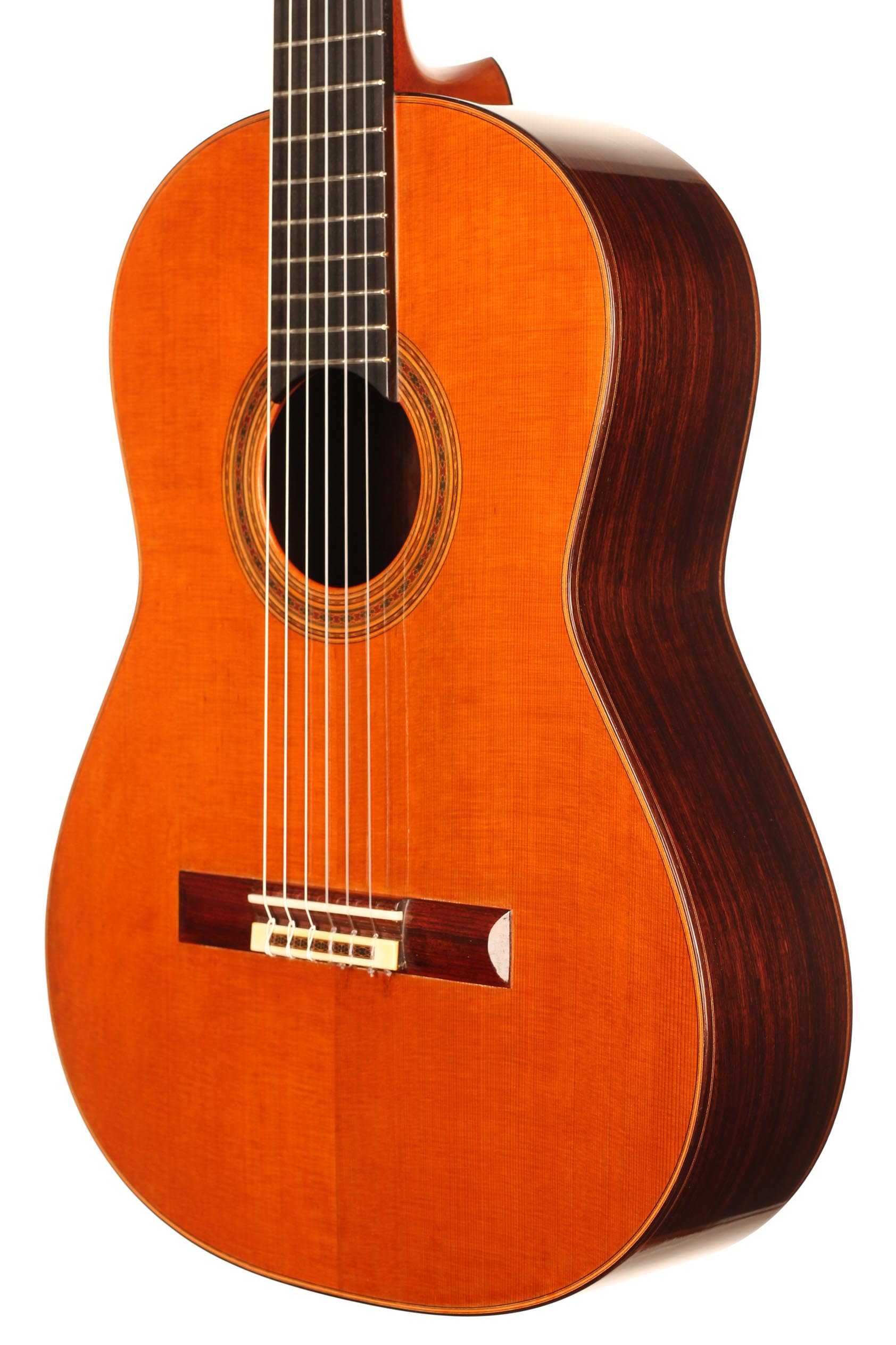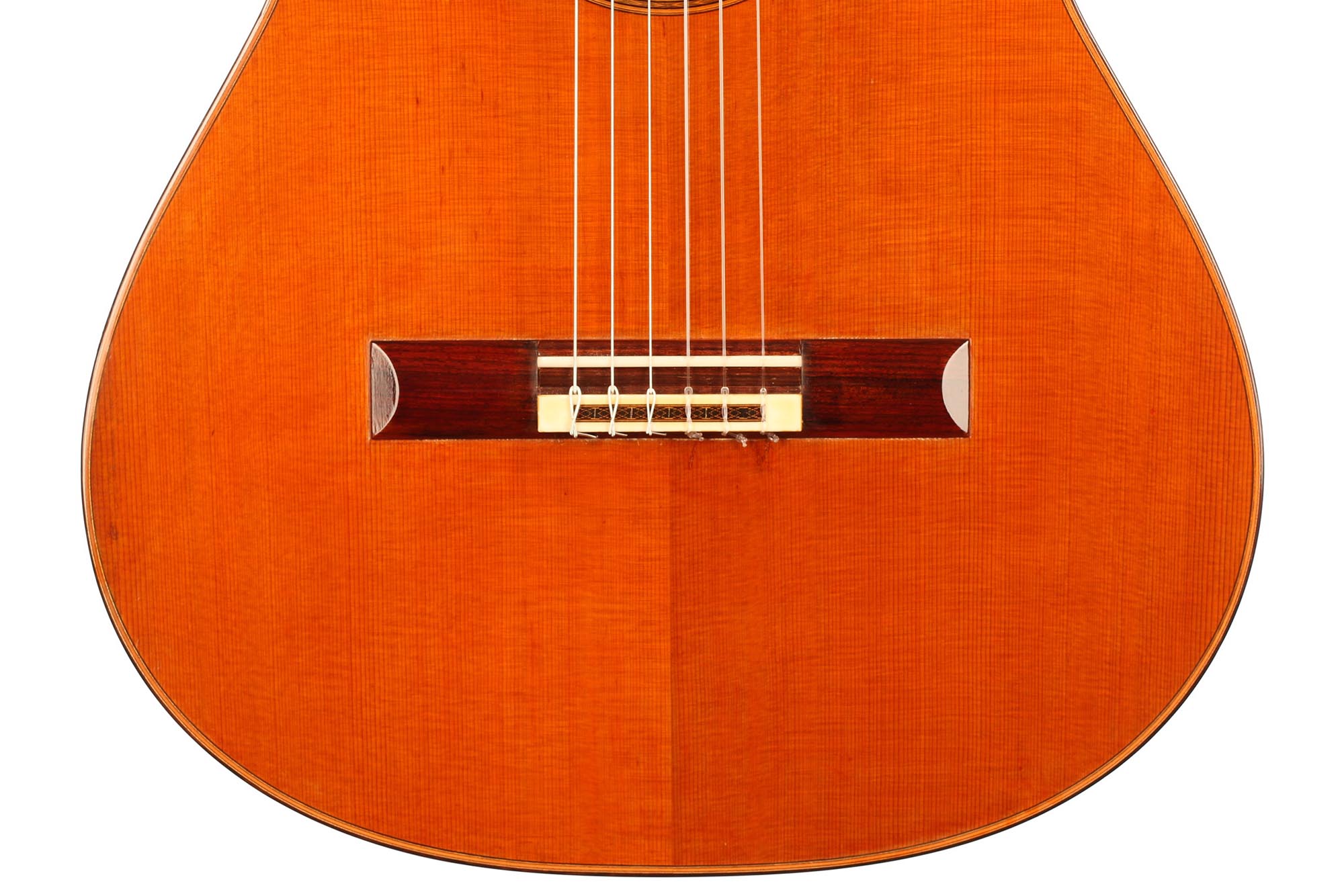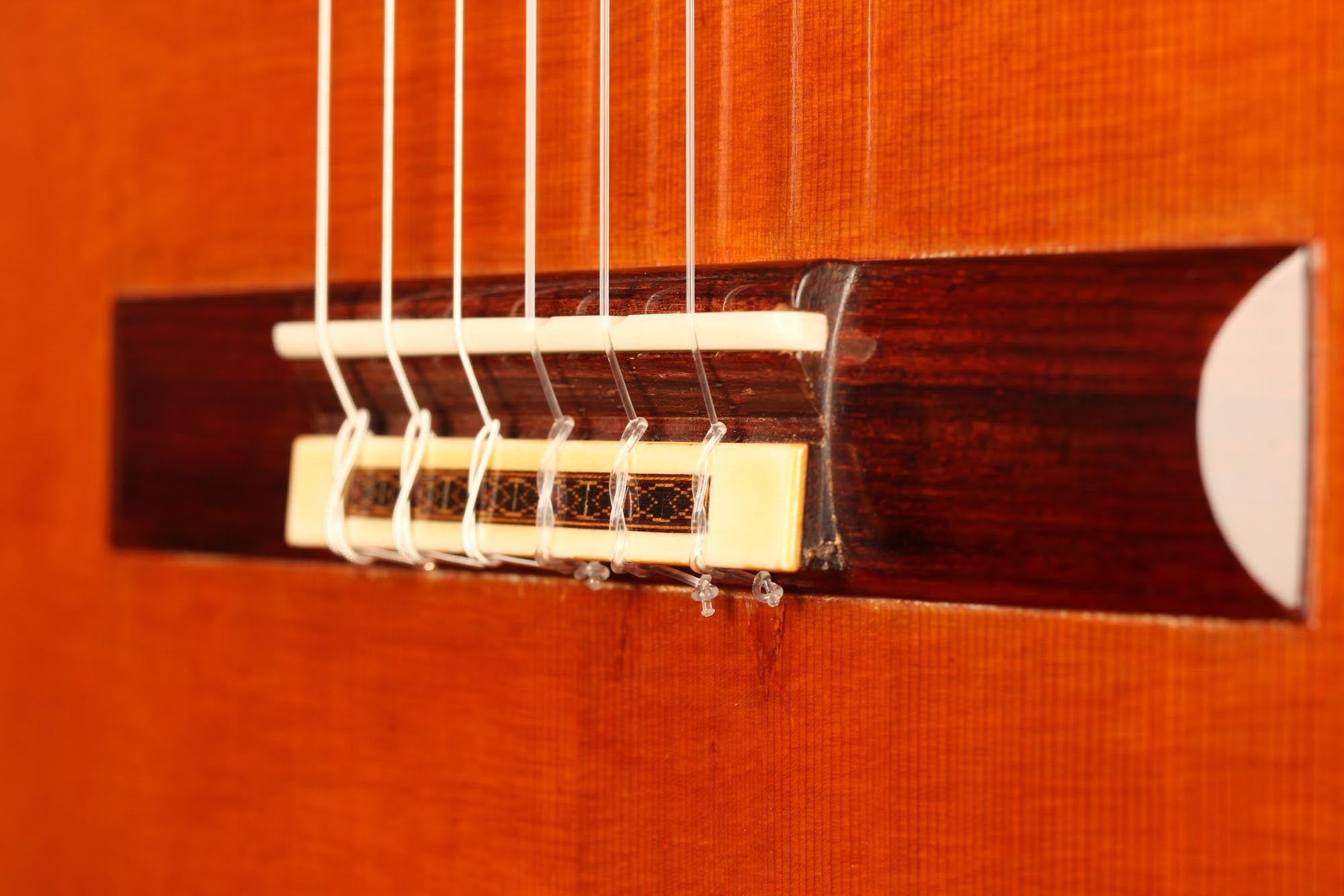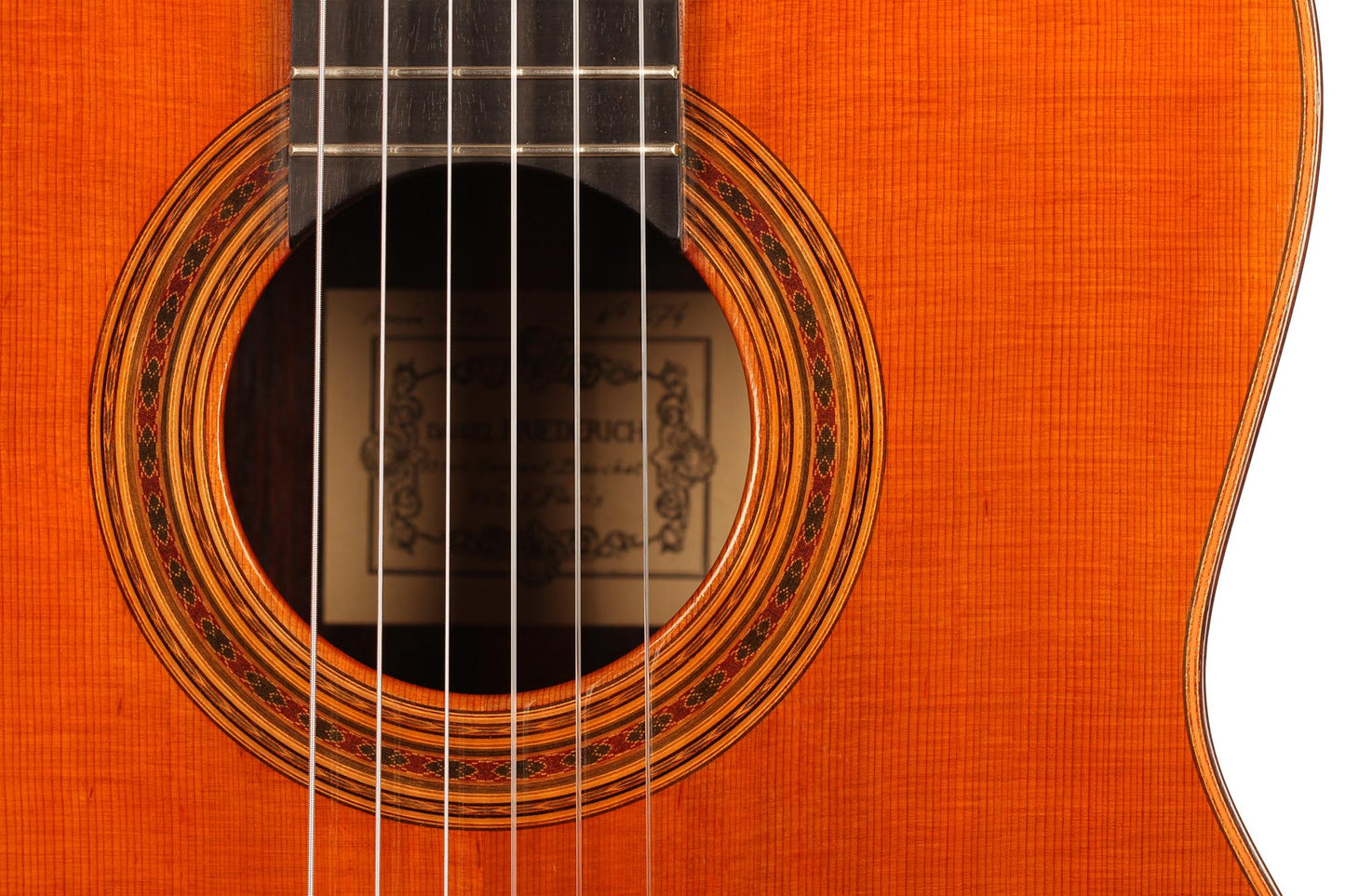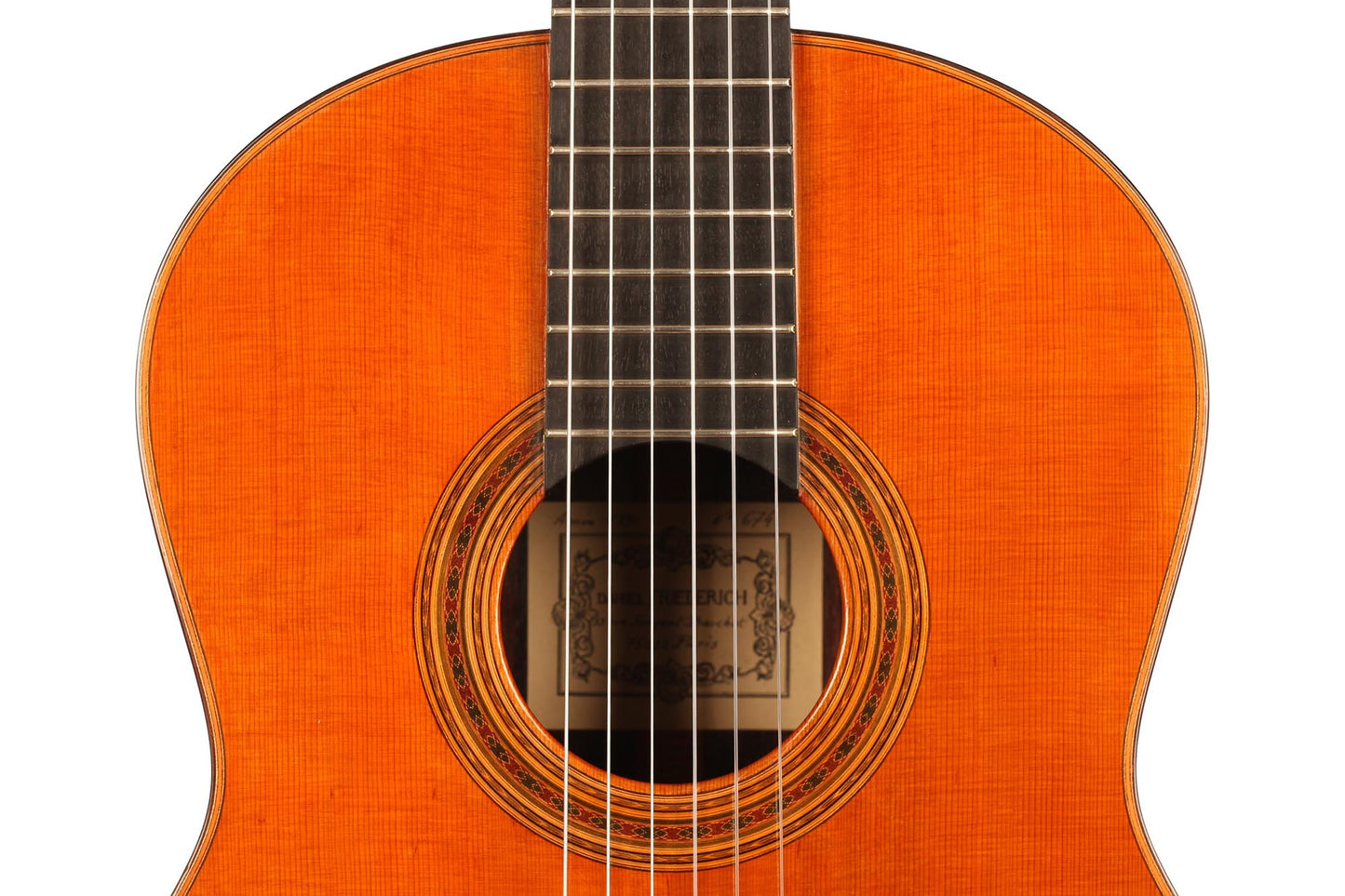 Diese Gitarre stammt aus der populärsten Schaffenszeit Friederichs. Außerdem ist dieses Instrument völlig frei von Rissen. Vor allem aber ist es ein absolut fantastisches Konzertinstrument. Daniel Friederich hatte in dieser späten Phase seiner Karriere ein sehr hohes Maß an Eleganz und Raffinesse in der Klangfarbe, den Farben, der Ausgewogenheit erreicht. Das Spielerlebnis ist absolut fesselnd. Gesamtvolumen und Projektion dieser Gitarre sind immens und die satten, strukturierten Bässe verbinden sich perfekt mit den graziösen, facettenreichen Höhen. Das Sustain ist bis zum neunzehnten Bund hervorragend und die Obertöne vervollständigen das große Klangspektrum.