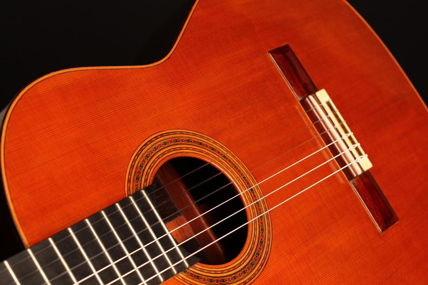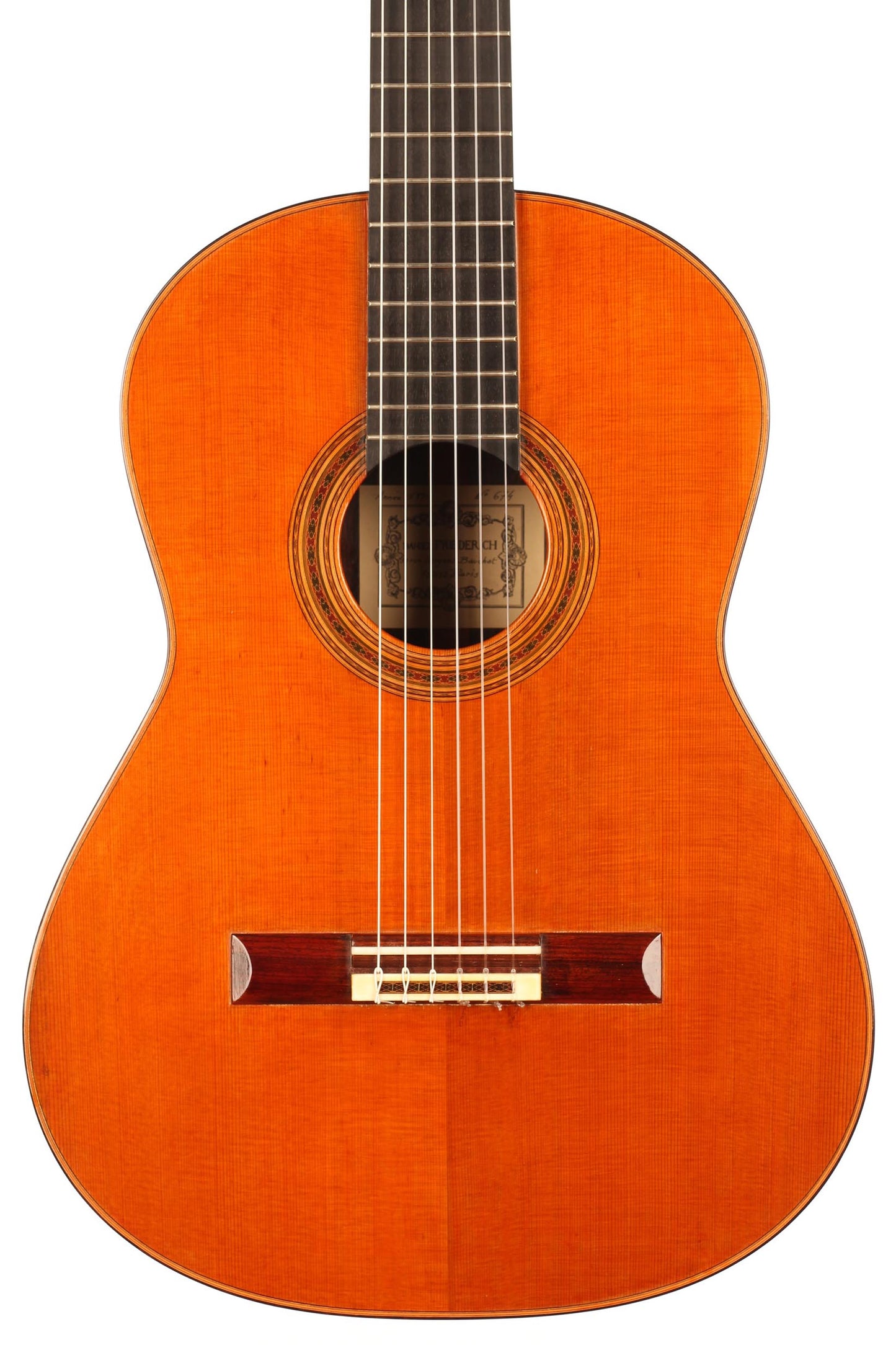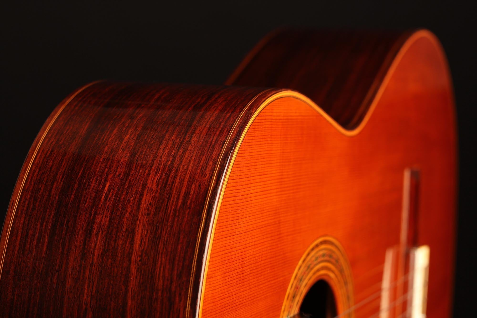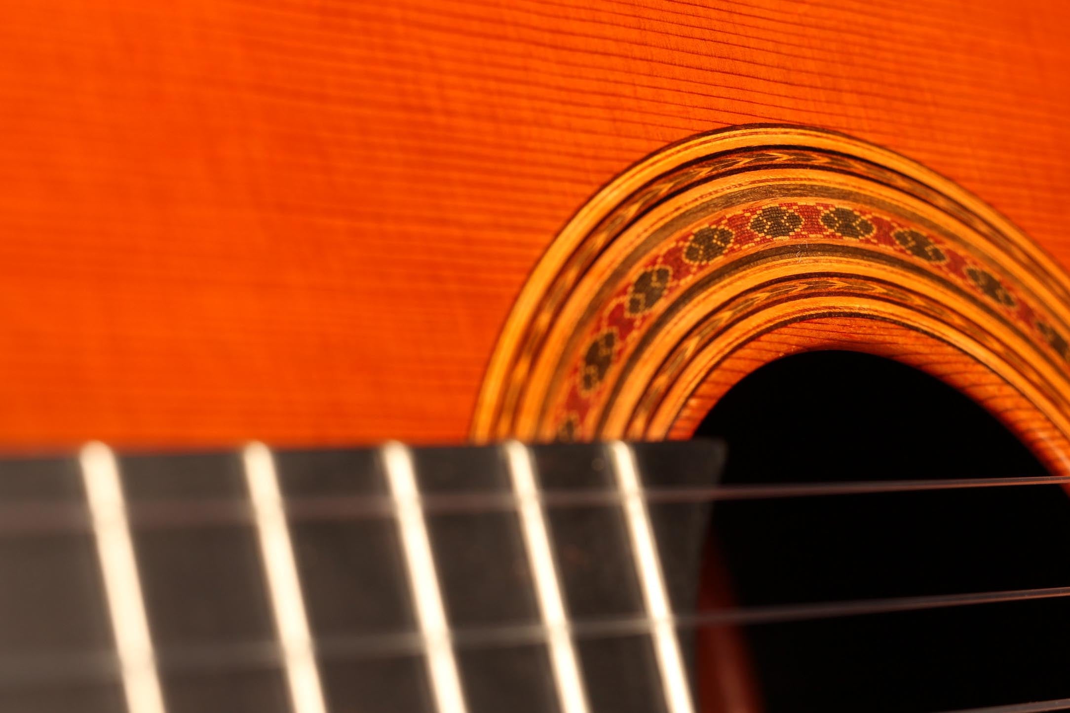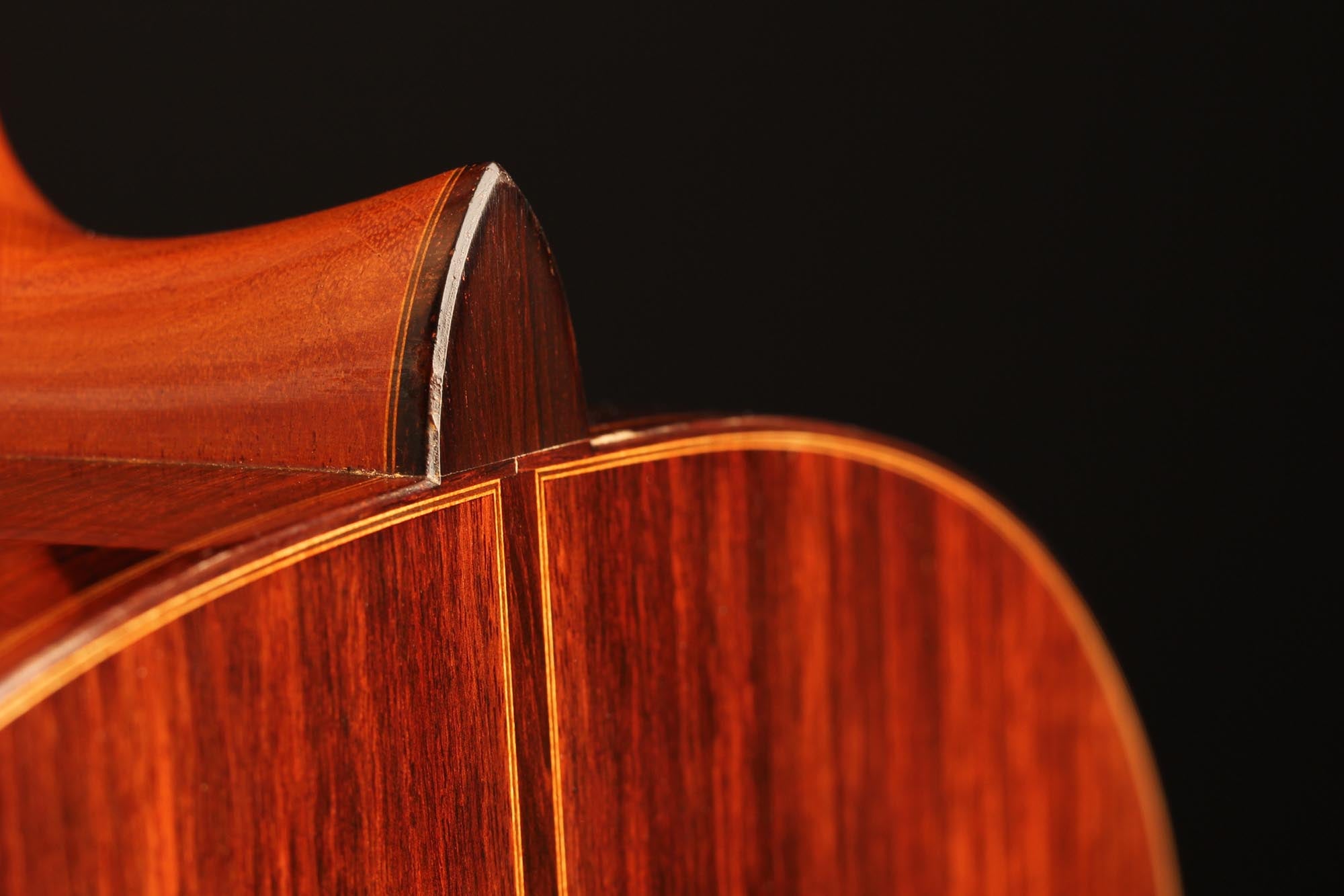 Diese Gitarre stammt aus der populärsten Schaffenszeit Friederichs. Außerdem ist dieses Instrument völlig frei von Rissen. Vor allem aber ist es ein absolut fantastisches Konzertinstrument. Daniel Friederich hatte in dieser späten Phase seiner Karriere ein sehr hohes Maß an Eleganz und Raffinesse in der Klangfarbe, den Farben, der Ausgewogenheit erreicht. Das Spielerlebnis ist absolut fesselnd. Gesamtvolumen und Projektion dieser Gitarre sind immens und die satten, strukturierten Bässe verbinden sich perfekt mit den graziösen, facettenreichen Höhen. Das Sustain ist bis zum neunzehnten Bund hervorragend und die Obertöne vervollständigen das große Klangspektrum.