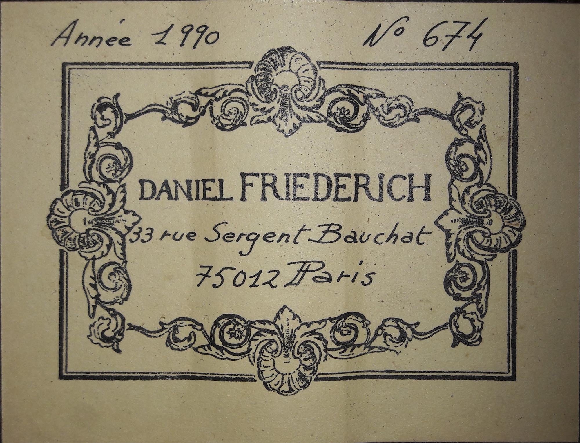 Daniel Friederich wurde am 16. Januar 1932 geboren. Obwohl er den starken Wunsch hatte, Gitarre zu spielen, hatte er mit einem Mangel an Geld zu kämpfen. Im Alter von 23 Jahren löste Friederich dieses Dilemma, indem er seine erste Gitarre selbst baute: eine Kopie einer Simplicio-Gitarre. Daniel Friederich wurde um 1955 von seinem Gitarrenlehrer Christian Aubin unterstützt. Nachdem er Werkzeuge gebaut und Erfahrungen im Gitarrenbau gesammelt hatte, zeigte Daniel Friederich Robert Bouchet seine fünfzehnte Gitarre. Seitdem hat R. Bouchet seine Arbeit inspiriert. Im Laufe seiner Karriere entwickelte er persönlich einige Ideen von R. Bouchet. Daniel Friederich ist seit Jahrzehnten einer der wichtigsten aktiven Gitarrenbauer der Welt. Im Jahr 2015 stellte er den Gitarrenbau ein und verkaufte alle seine Werkzeuge. Er ist heute definitiv einer der angesehensten und bewunderten Gitarrenbauer der Gitarrengeschichte.