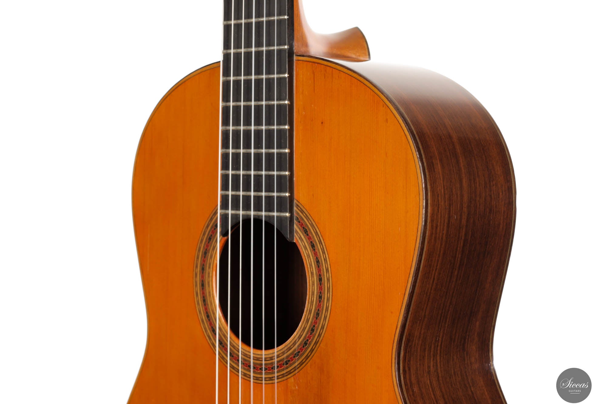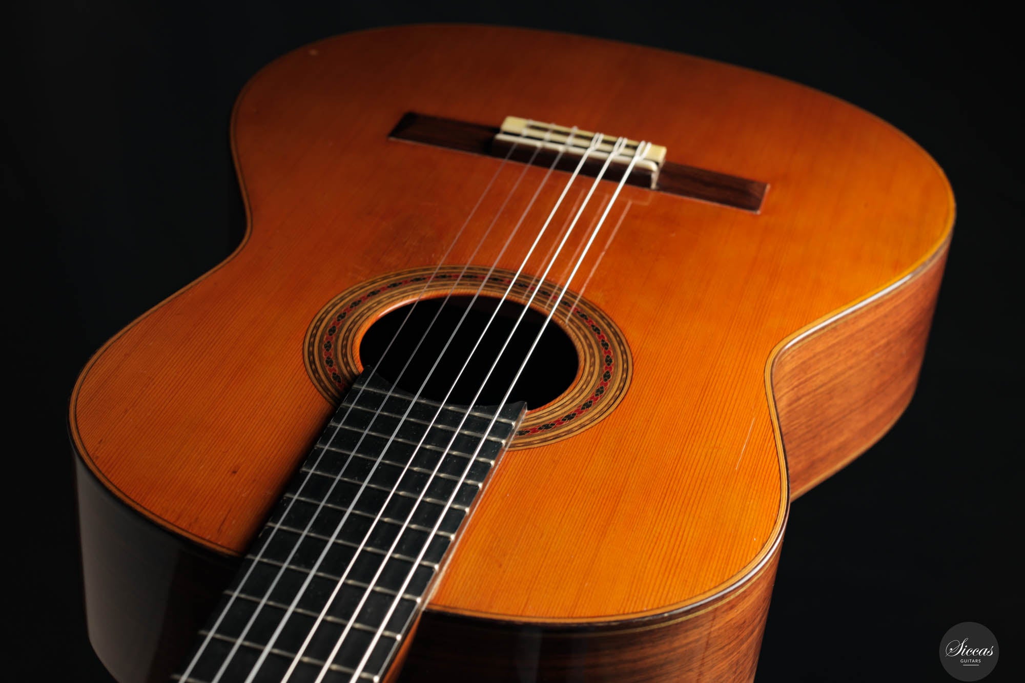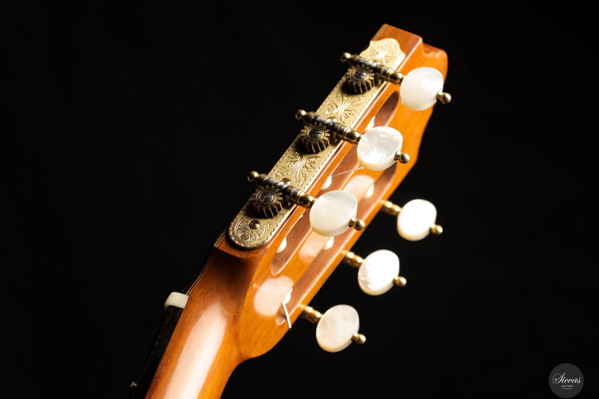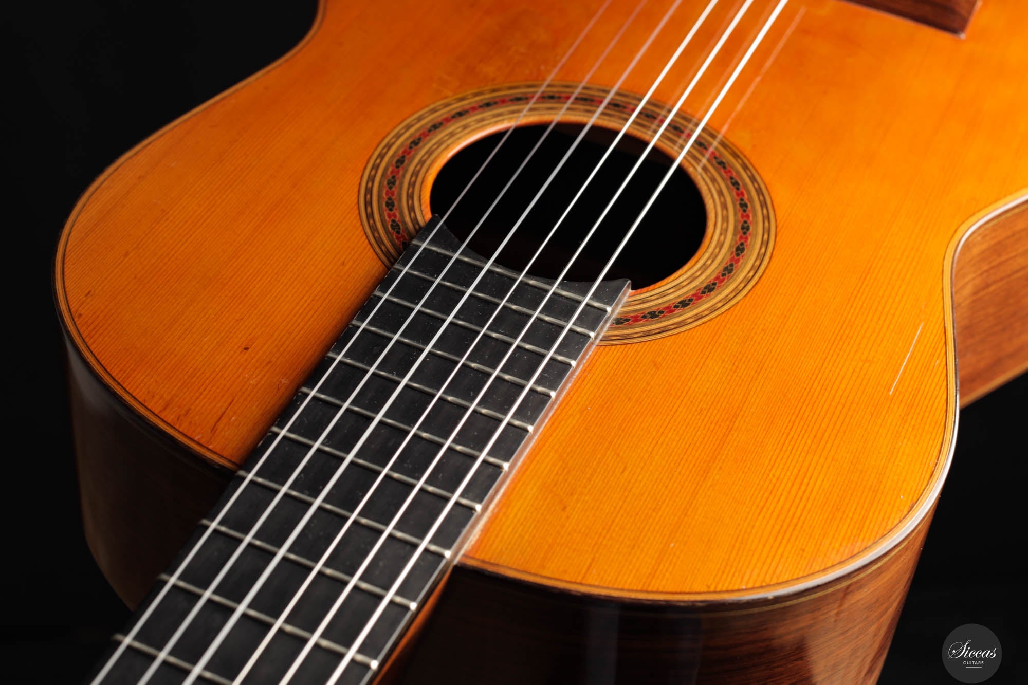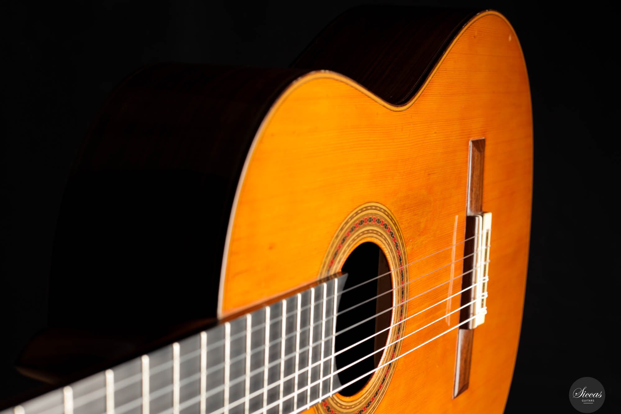 Die ästhetische und akustische Schönheit dieser Gitarre wird durch den indischen Palisander ihres Rückens weiter erhöht, ein Material, das für seine visuelle und klangliche Reichhaltigkeit bekannt ist. Die Seiten, verdoppelt mit Mahagoni, verbessern die Klangprojektion und Resonanz der Gitarre und tragen zu ihrem vollmundigen Charakter bei. Der Zustand dieser Gitarre ist vorbildlich, ihre ursprüngliche Integrität ist bewahrt, abgesehen von einigen Oberflächen-Nachbesserungen. Sie ist frei von Rissen oder Reparaturen. Das Besitzen des 1994er Daniel Friederich "Konzertmodells" Nr. 725 bedeutet nicht nur, eine hochwertige Gitarre zu besitzen; es bedeutet, ein Stück Geschichte von einem der am meisten verehrten Gitarrenbauer unserer Zeit zu umarmen. Dieses Instrument ist nicht nur ein Objekt der Schönheit und des Klangs; es ist ein Erbe, ein Schatz für jeden Musiker oder Sammler, der die Kunstfertigkeit und Geschichte schätzt, die in der Welt der klassischen Gitarren verwurzelt sind.