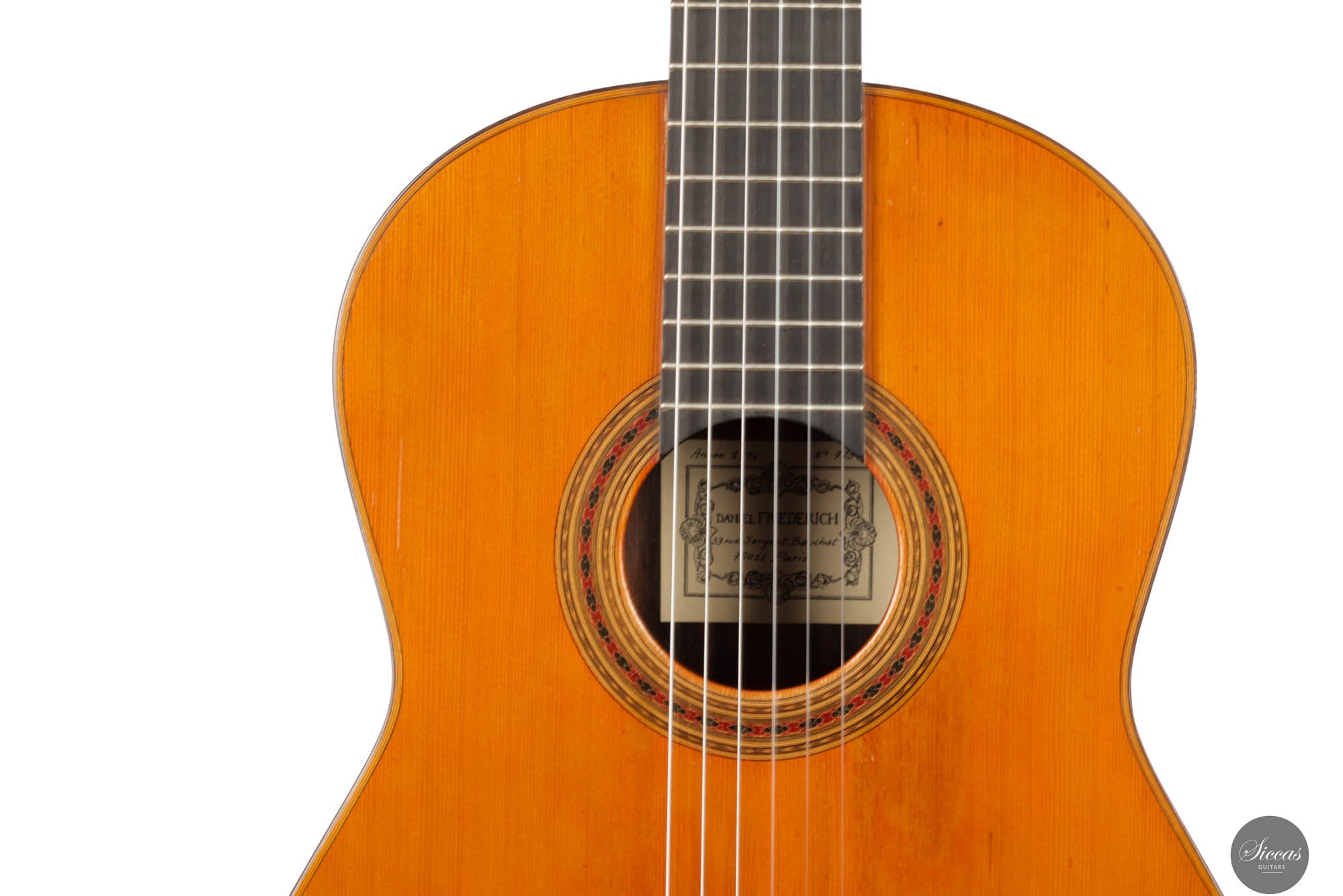 Daniel Friederich wurde am 16. Januar 1932 geboren und ist im Jahr 2020 verstorben. Obwohl er den festen Wunsch hatte Gitarre zu spielen, mangelte es ihm an Geld um sich ein Instrument zu kaufen. Doch im Alter von 23 Jahren löste Friederich dieses Dilemma, indem er seine erste Gitarre selbst baute: Eine Kopie einer Simplicio-Gitarre. Daniel Friederichs Gitarrenlehrer und hervorragender Gitarrenbauer, Christian Aubin, war ihm dabei eine große Hilfe. Nachdem er Werkzeuge selbst gebaut und einige Erfahrungen im Gitarrenbau gesammelt hatte, zeigte Daniel Friederich seine fünfzehnte Gitarre Robert Bouchet. Seitdem hat Robert Bouchet seine Arbeit inspiriert, und Daniel Friederich hat einige Ideen von R. Bouchet während seiner Karriere persönlich weiterentwickelt.