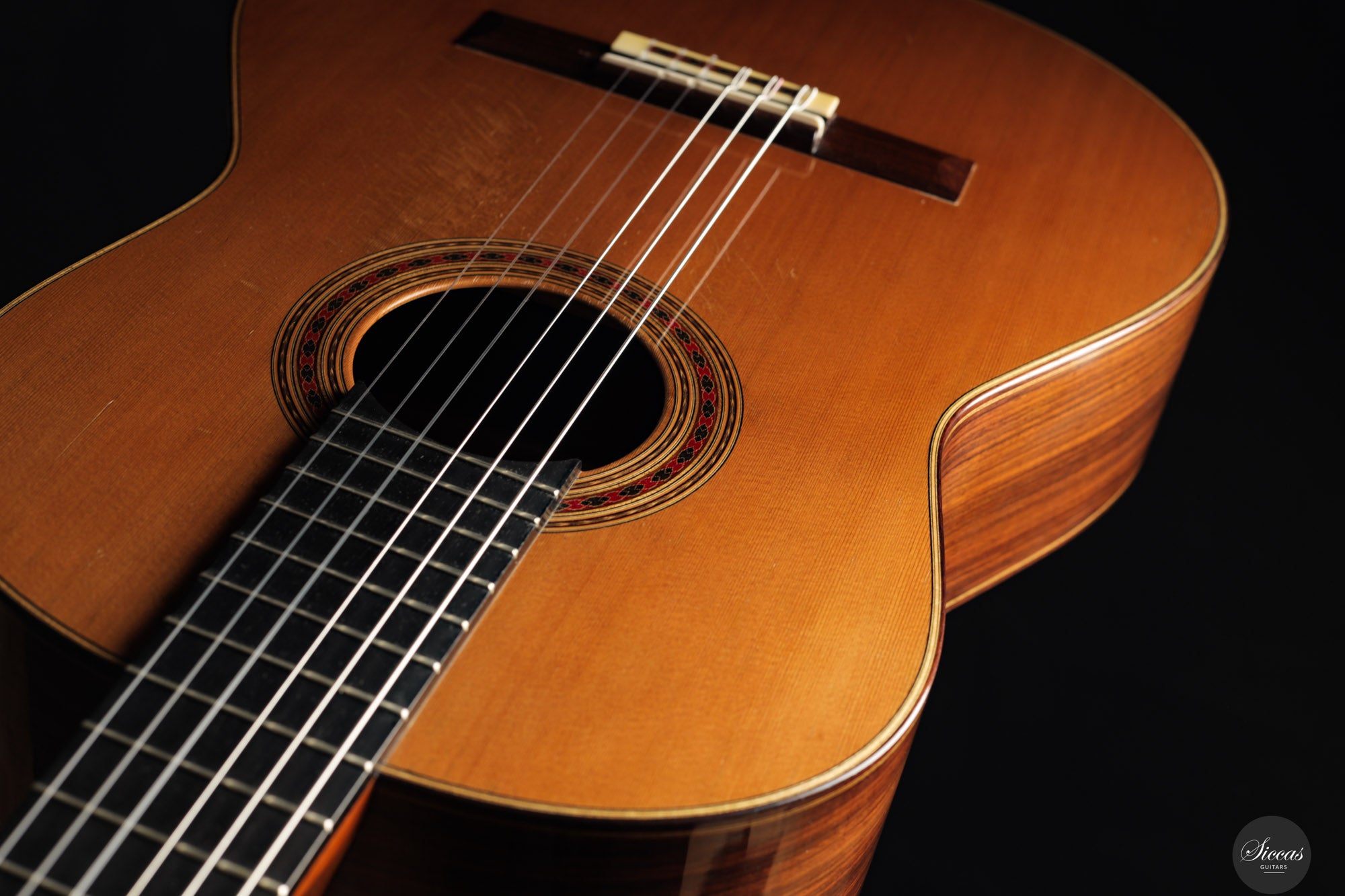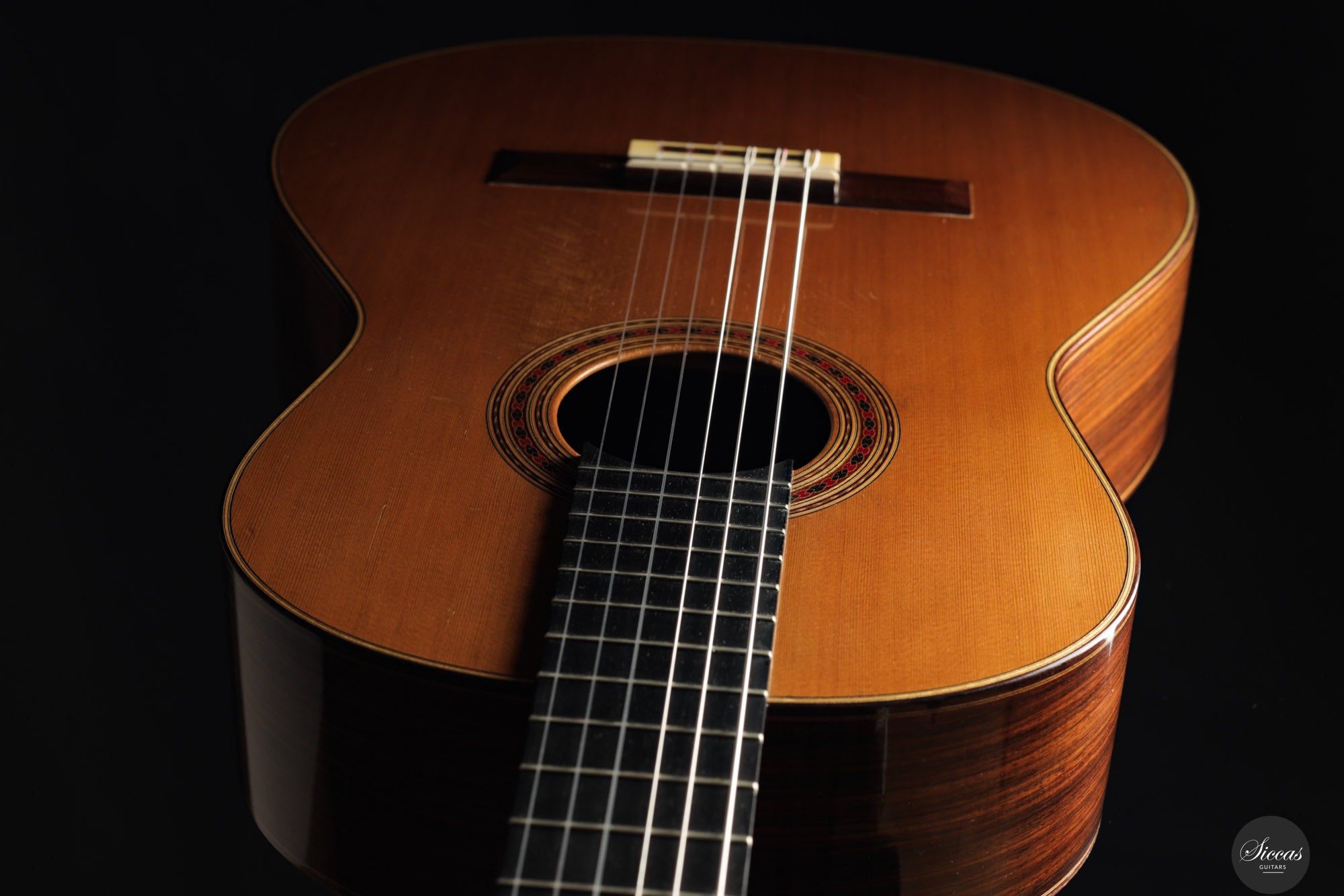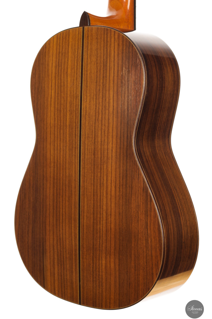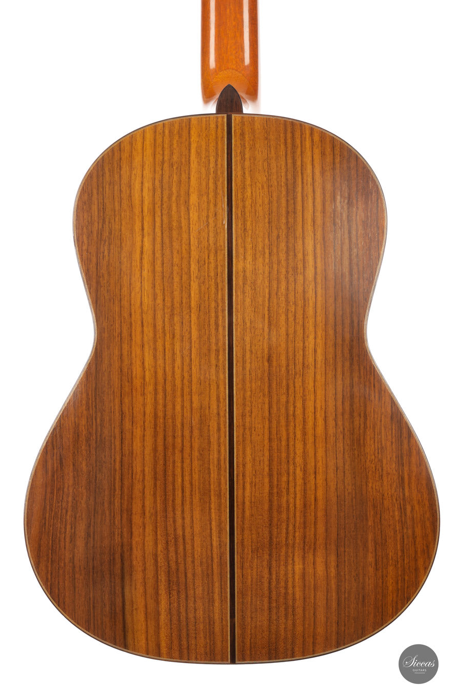 Diese außergewöhnliche Gitarre, Daniel Friederich Nr. 776 aus dem Jahr 2001, ist ein herausragendes Beispiel für das berühmte Konzertmodell des Pariser Meisters. Sie wurde speziell für die renommierte französische Gitarristin Gaëlle Solal gebaut und befand sich seither ausschließlich in ihrem Besitz. Die Decke besteht aus Zeder, Boden und Zargen aus ostindischem Palisander, das Finish ist eine Schellackpolitur, und als Mechaniken wurden hochwertige Rodgers-Tuner verwendet. Der Klang vereint die charakteristischen Merkmale eines Friederich-Instruments: ein runder, warmer Ton mit außergewöhnlichem Sustain, reiche Obertöne und perfekte Ausgewogenheit über alle Register hinweg. All dies wird ergänzt durch eine bemerkenswerte Projektion und einen großen Dynamikumfang – eine Seltenheit bei traditionell gebauten Instrumenten. Die Ansprache ist äußerst direkt und gleichmäßig, wodurch der Spieler zu einer nuancenreichen Ausdrucksweise eingeladen wird. Diese Gitarre unterstützt den Musiker in jeder Hinsicht und überzeugt mit Klarheit, Wärme und Präsenz. Auch handwerklich ist sie bis ins kleinste Detail ausgeführt und entspricht dem hohen Niveau, das man von Friederichs gefragtesten Instrumenten erwartet.Zustand