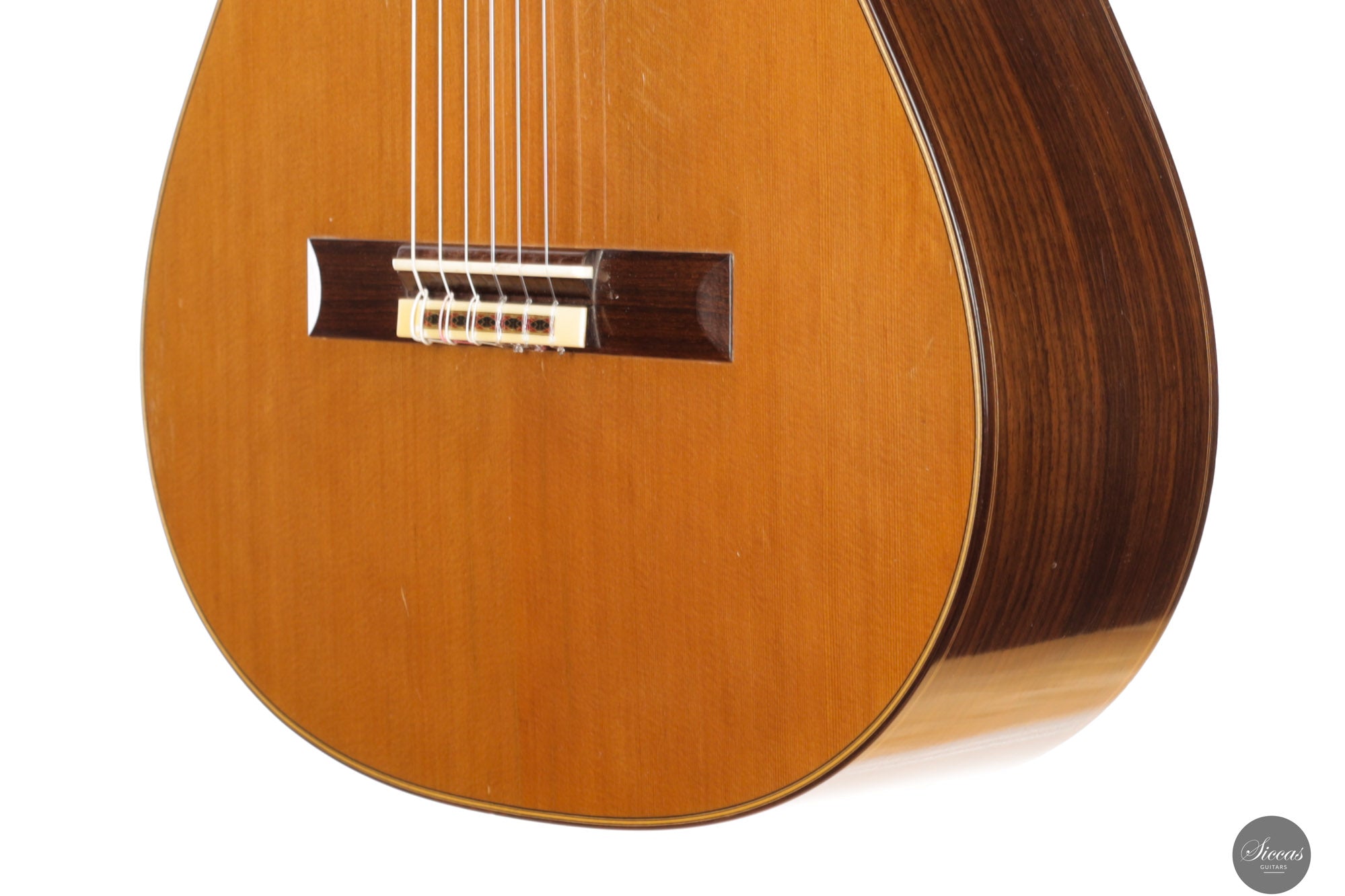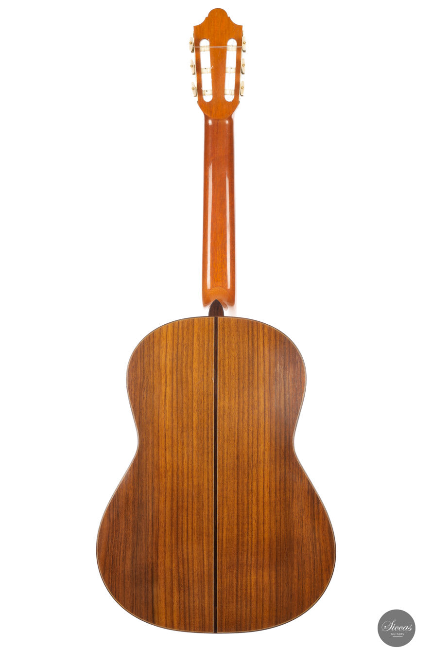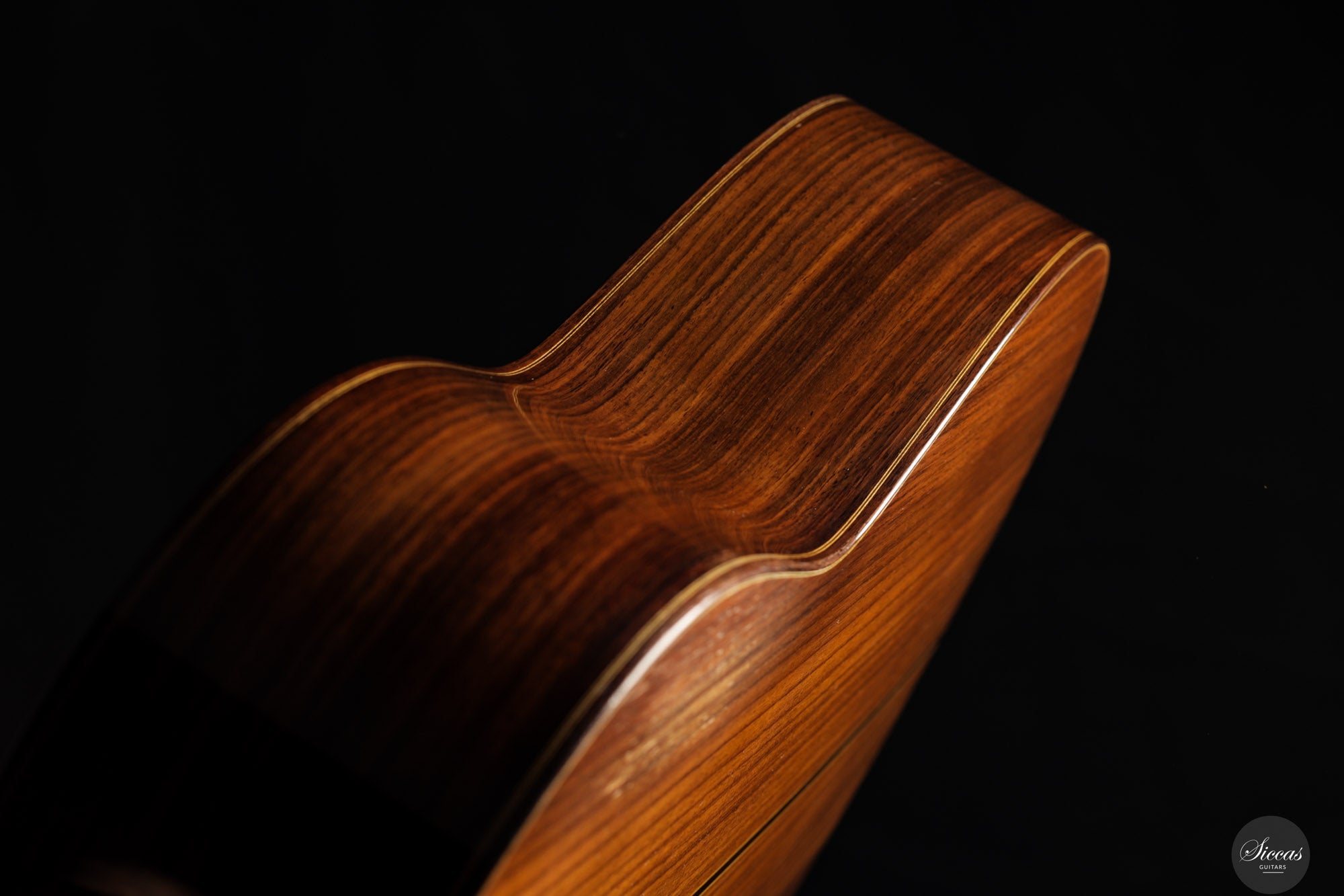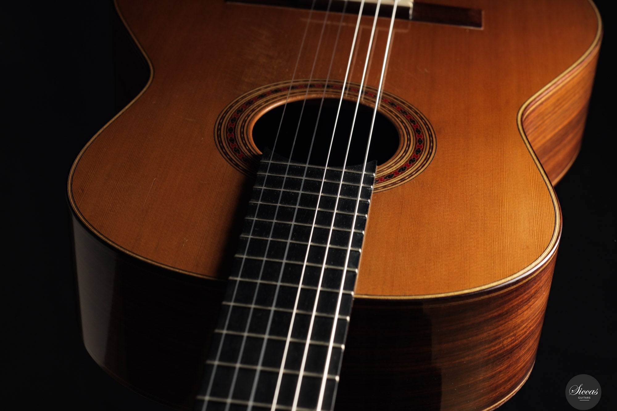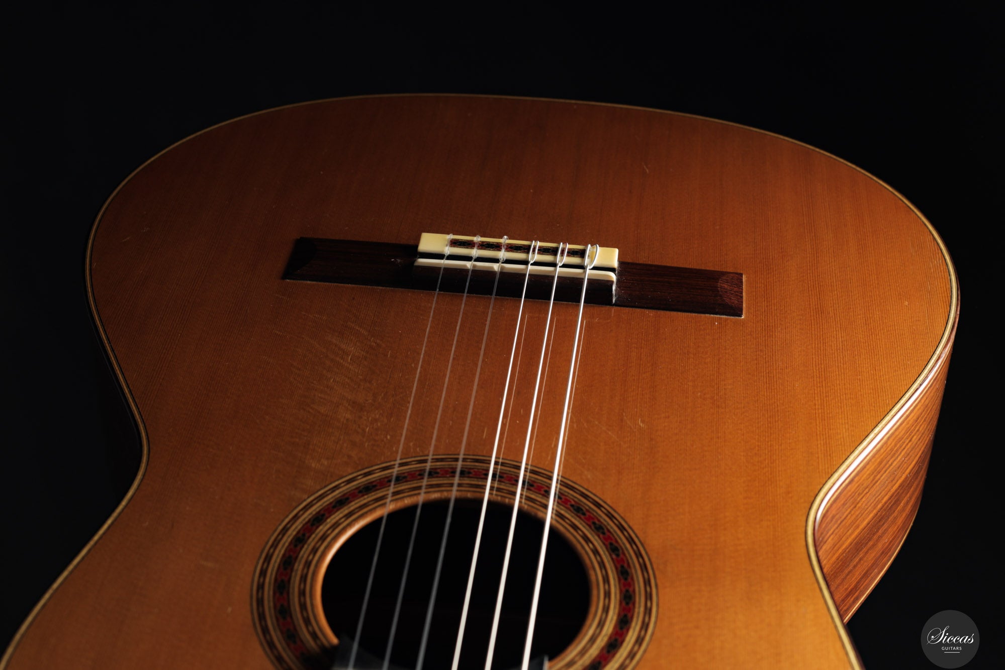 Diese außergewöhnliche Gitarre, Daniel Friederich Nr. 776 aus dem Jahr 2001, ist ein herausragendes Beispiel für das berühmte Konzertmodell des Pariser Meisters. Sie wurde speziell für die renommierte französische Gitarristin Gaëlle Solal gebaut und befand sich seither ausschließlich in ihrem Besitz. Die Decke besteht aus Zeder, Boden und Zargen aus ostindischem Palisander, das Finish ist eine Schellackpolitur, und als Mechaniken wurden hochwertige Rodgers-Tuner verwendet. Der Klang vereint die charakteristischen Merkmale eines Friederich-Instruments: ein runder, warmer Ton mit außergewöhnlichem Sustain, reiche Obertöne und perfekte Ausgewogenheit über alle Register hinweg. All dies wird ergänzt durch eine bemerkenswerte Projektion und einen großen Dynamikumfang – eine Seltenheit bei traditionell gebauten Instrumenten. Die Ansprache ist äußerst direkt und gleichmäßig, wodurch der Spieler zu einer nuancenreichen Ausdrucksweise eingeladen wird. Diese Gitarre unterstützt den Musiker in jeder Hinsicht und überzeugt mit Klarheit, Wärme und Präsenz. Auch handwerklich ist sie bis ins kleinste Detail ausgeführt und entspricht dem hohen Niveau, das man von Friederichs gefragtesten Instrumenten erwartet.Zustand