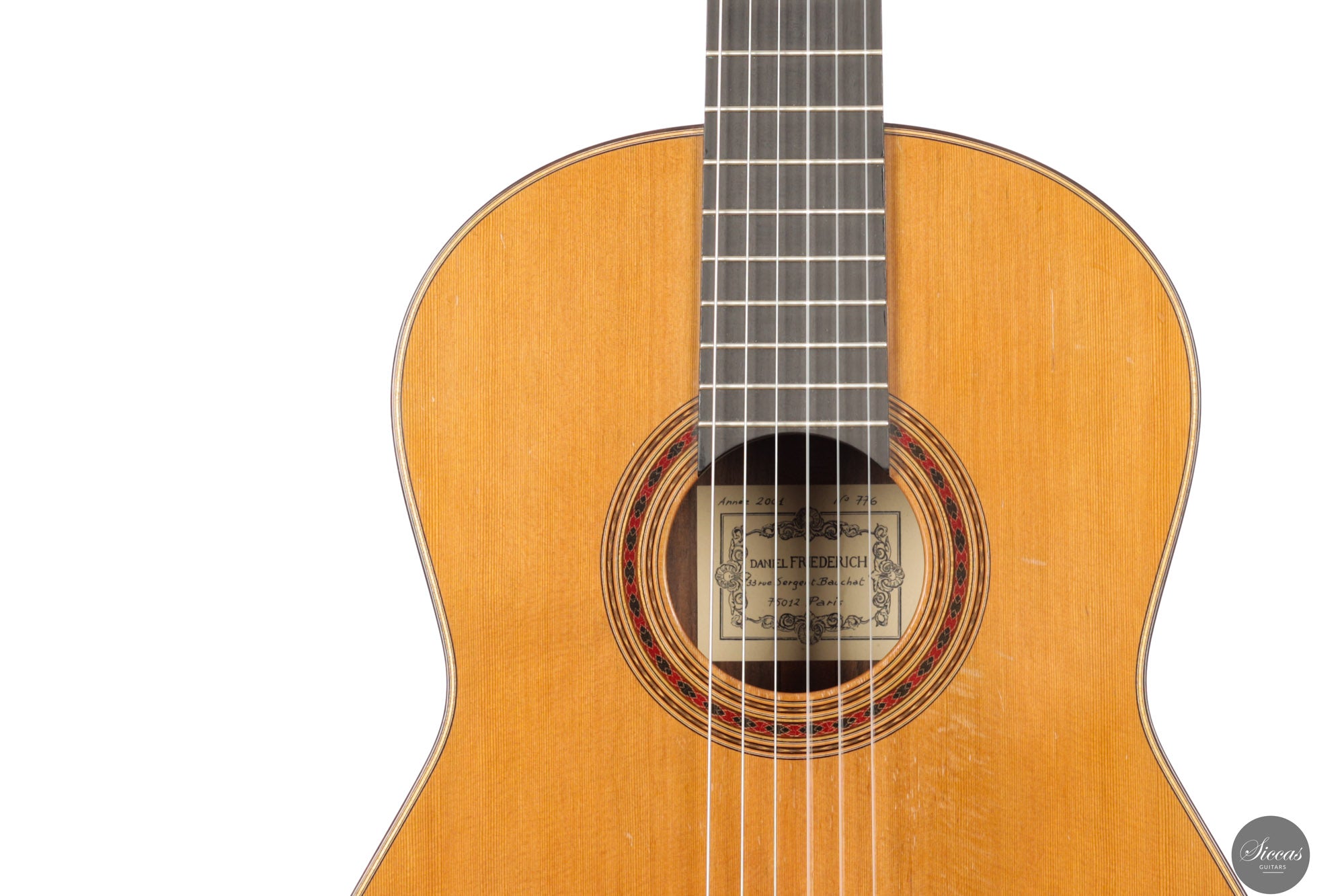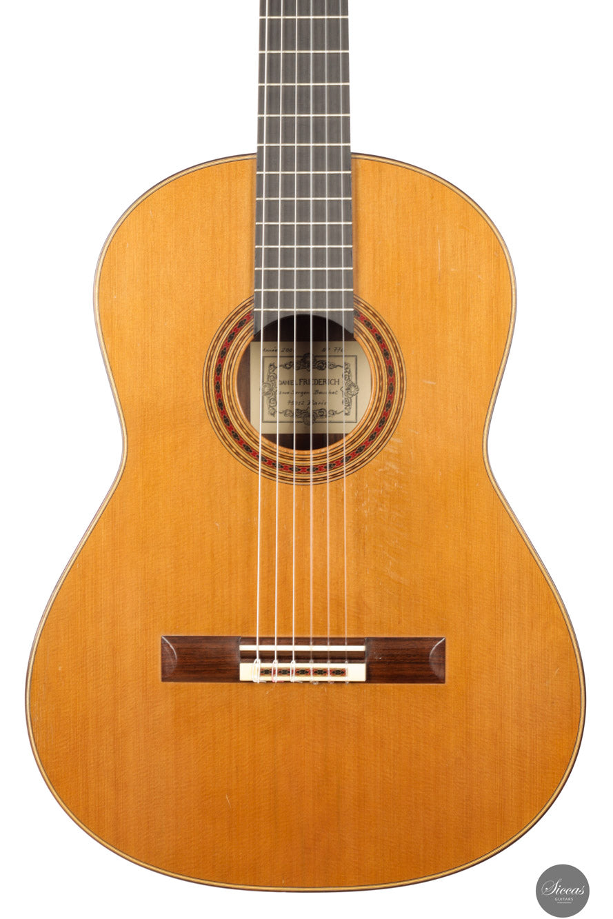Daniel Friederich wurde am 16. Januar 1932 in Paris geboren und verstarb im Jahr 2020. Aufgewachsen in einer Familie von Möbelschreinern im Pariser Faubourg Saint-Antoine, konnte er sich zunächst keine eigene Gitarre leisten. Mit 23 Jahren baute er daher seine erste Gitarre, eine Kopie einer Simplicio, mit Unterstützung seines Lehrers Christian Aubin. Einer seiner frühen Instrumente zeigte er Robert Bouchet, dessen Arbeit ihn nachhaltig prägte. Ab etwa 1960 widmete sich Friederich vollständig dem Gitarrenbau und verfeinerte seine Techniken durch empirische Studien und akustische Messungen. Über die Jahrzehnte hinweg wurde er zu einem der weltweit angesehensten Gitarrenbauer, bekannt für seine klanglich ausgewogenen, klaren und projizierenden Konzertgitarren.Über die Gitarre