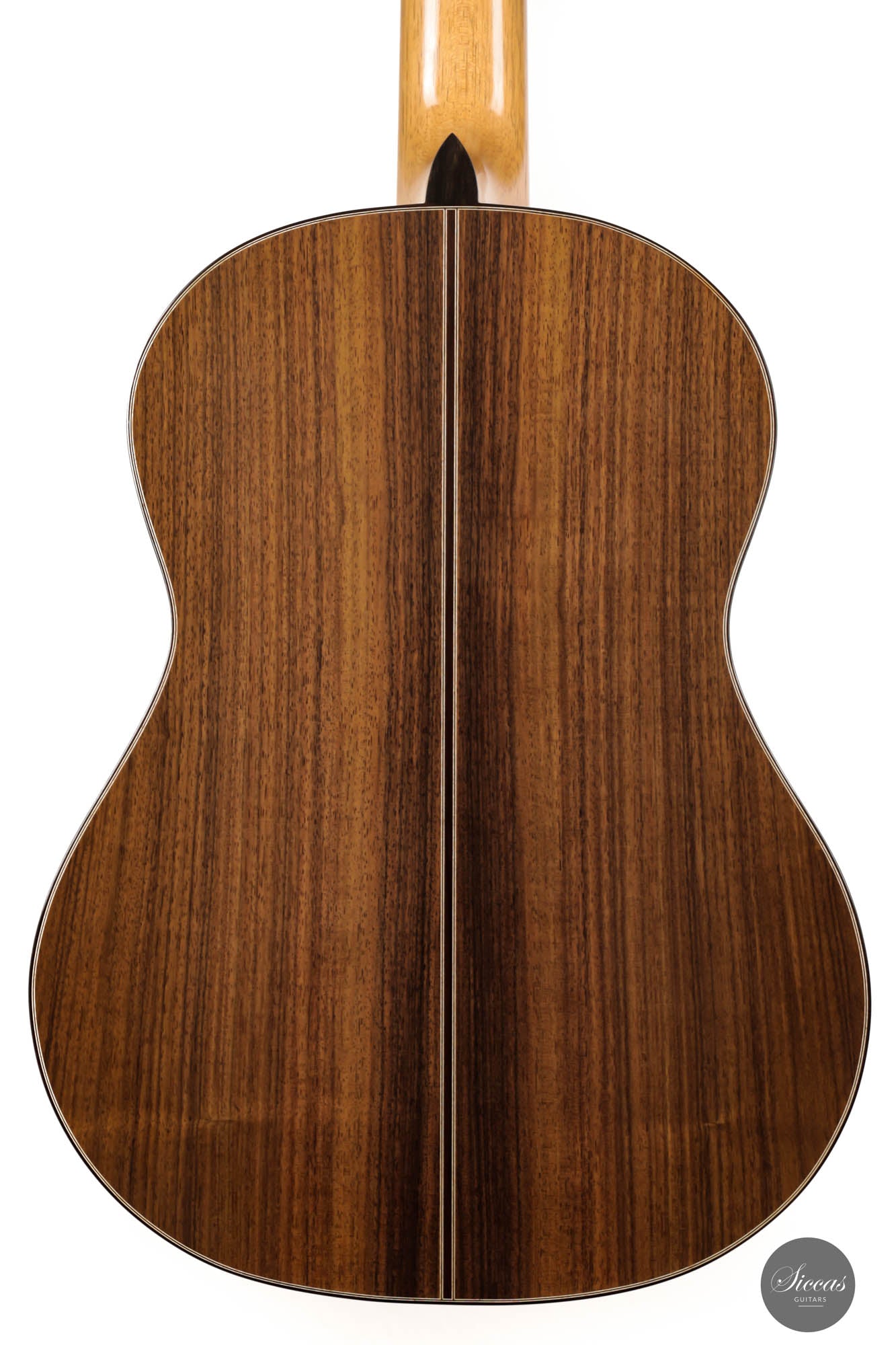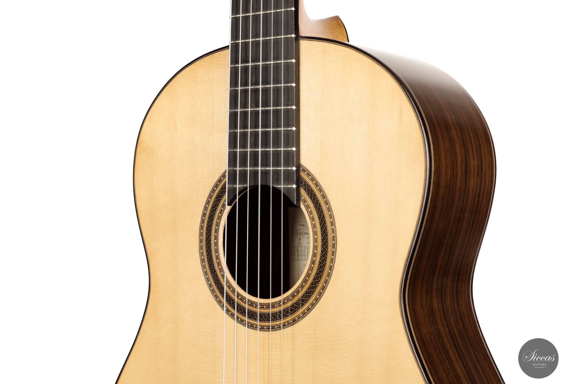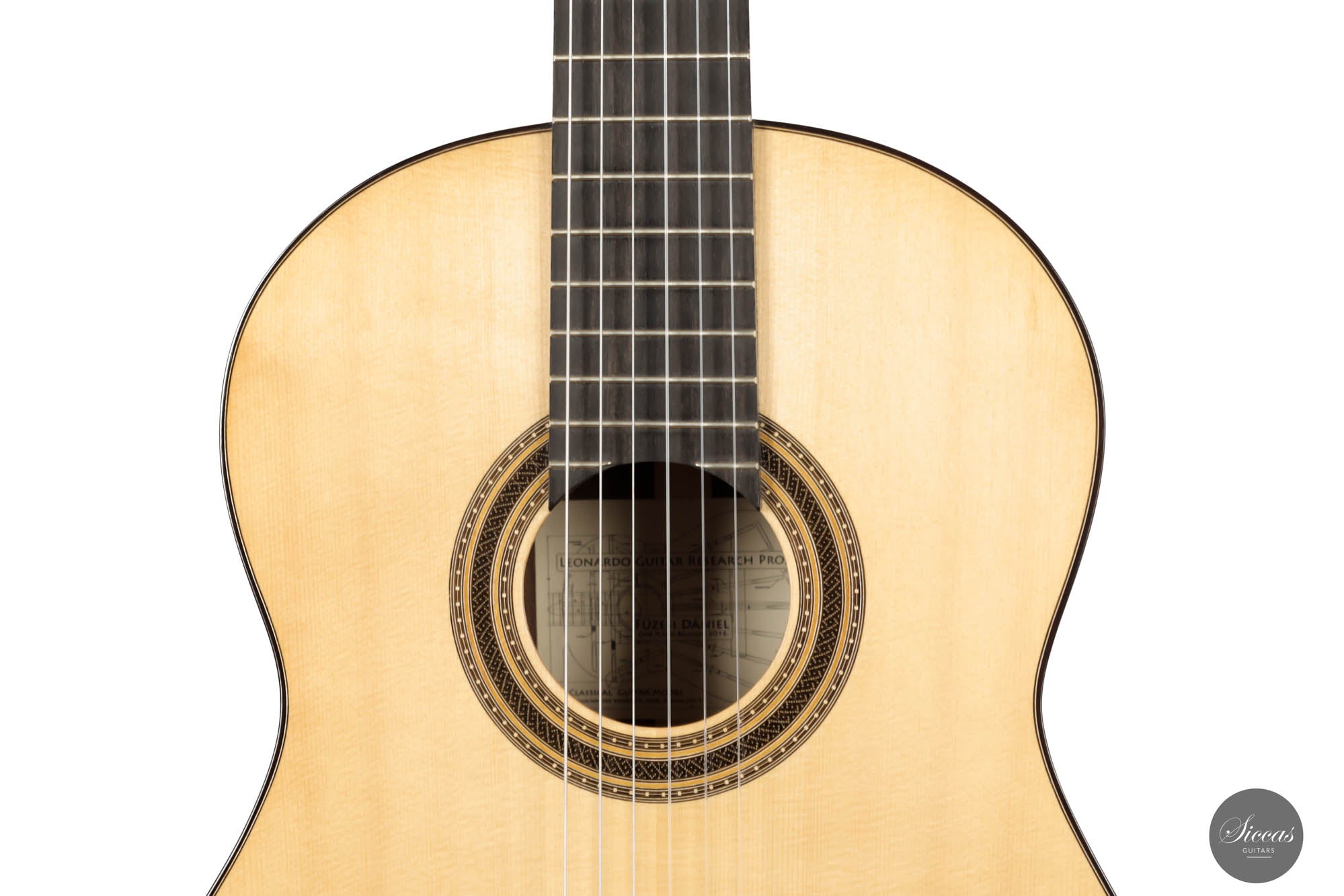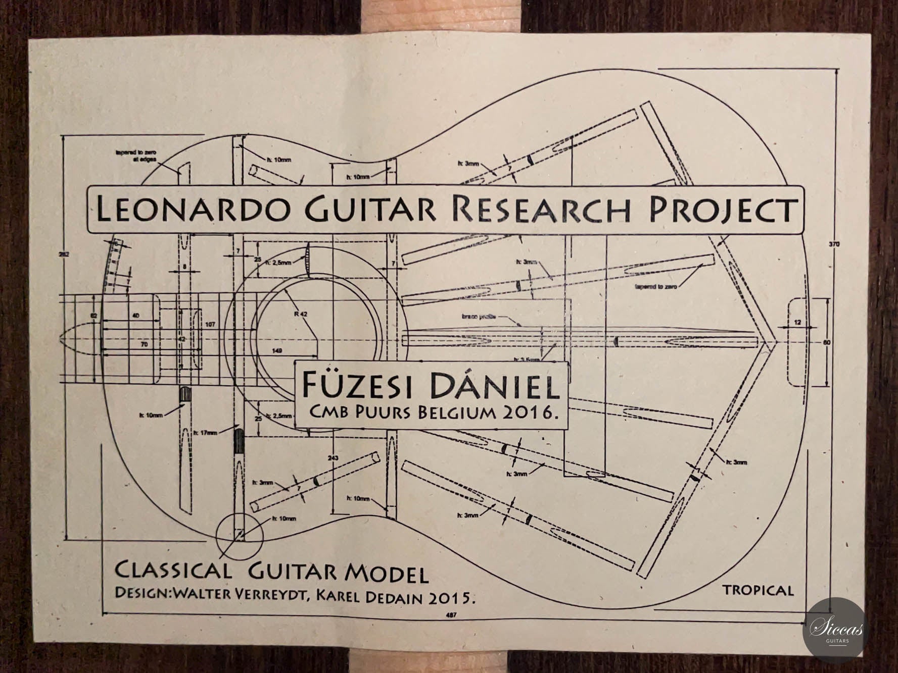 Dieses Instrument ist eine Gitarre, die 2016 von Daniel Füzesi im Rahmen des Leonardo-Projekts gebaut wurde. Sie hat eine Fichtendecke und Boden und Zargen aus indischem Palisander. Alle Verzierungen und Dekorationen dieses Instruments wurden in Perfektion ausgeführt. Es zeigt Daniels außergewöhnliche Handwerkskunst als Gitarrenbauer. Diese Gitarre zeichnet sich durch ihre Offenheit und Ausgewogenheit aus. Der Diskant klingt präzise und leicht variabel in Bezug auf Klangfarbe und Dynamik. Die Gesamtbalance der Gitarre ist äußerst angenehm, und die Klangqualität dieses Instruments gehört zweifelsohne zu den Gitarren der Spitzenklasse. Obwohl im Jahr 2016 gebaut, ist dieses schöne Instrument in brandneuem Zustand.