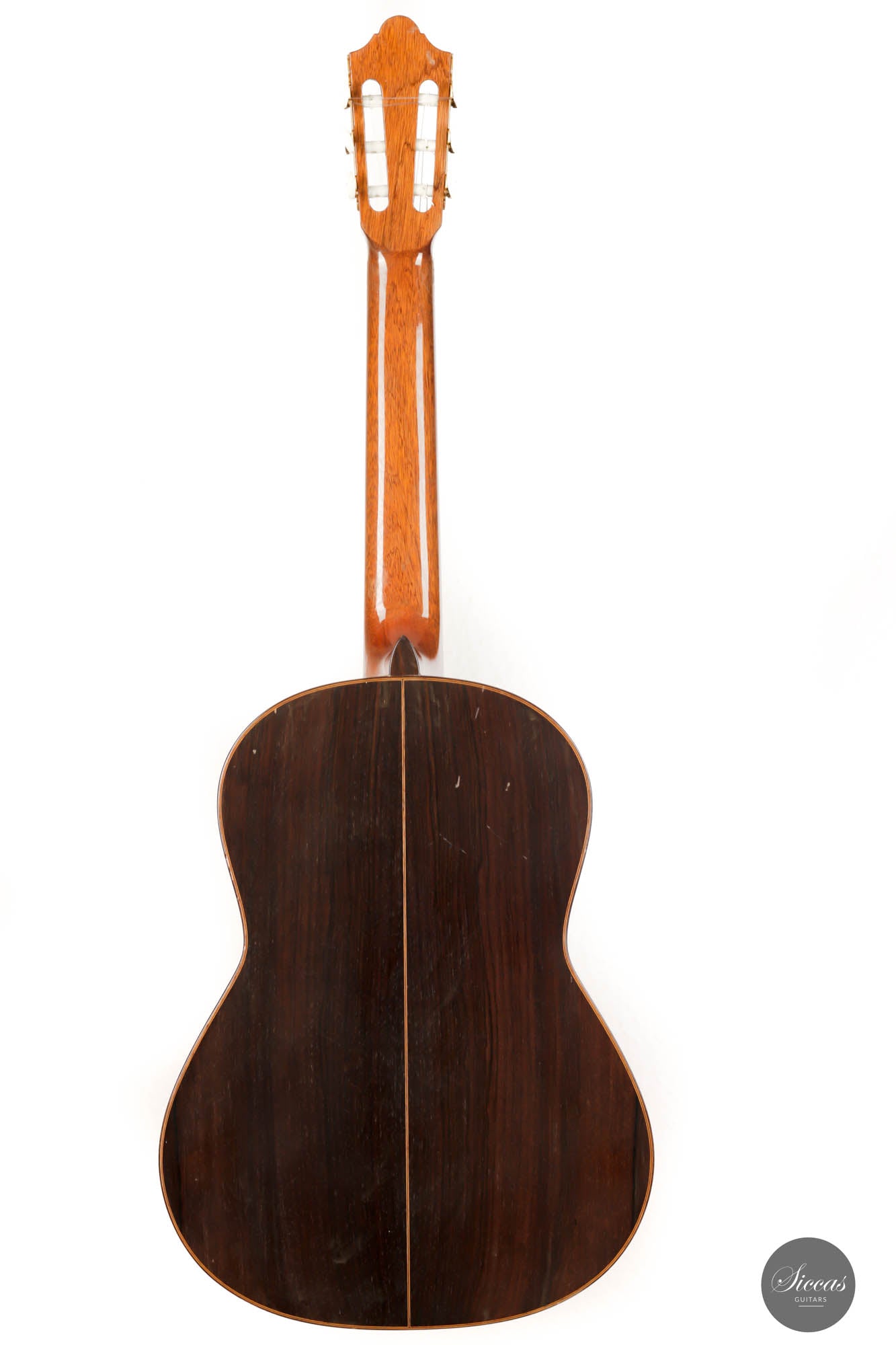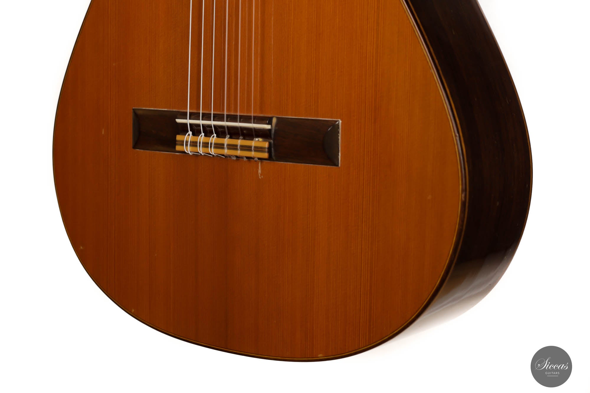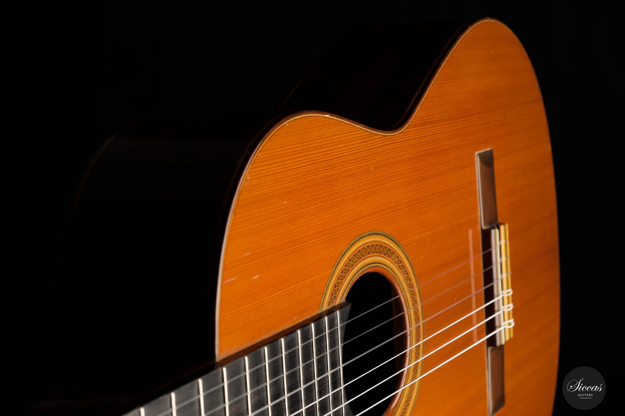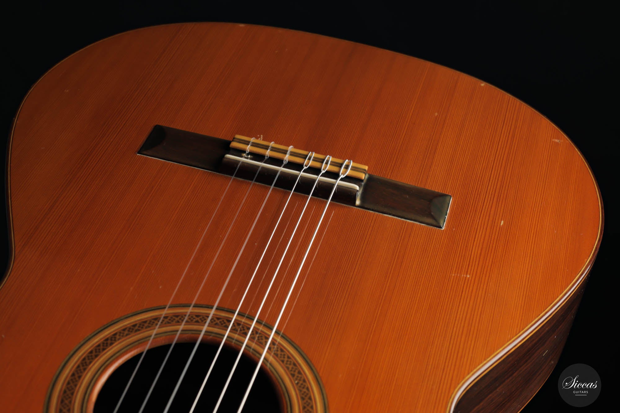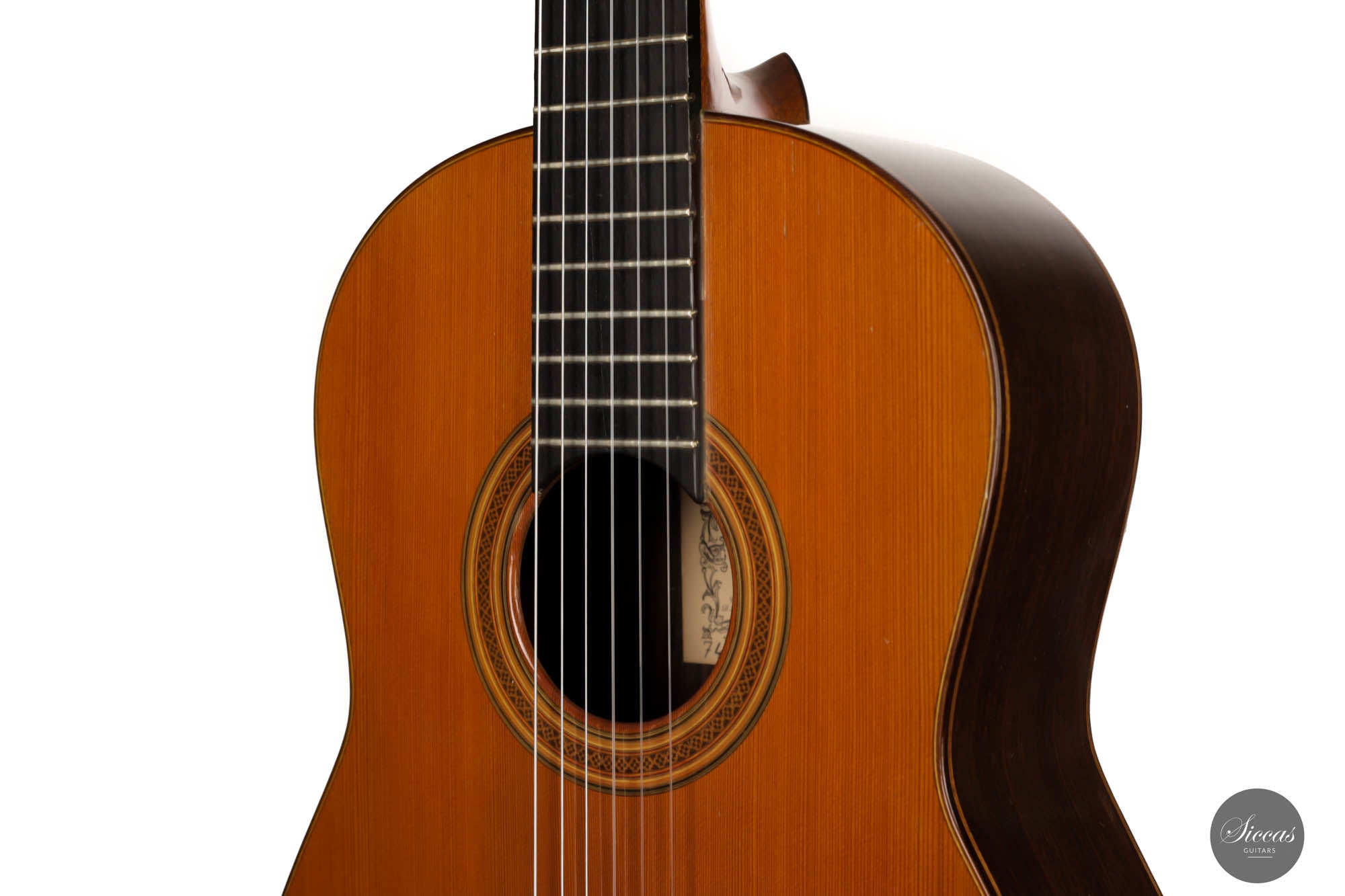 This magnificent guitar from 1975 is a perfect example of Daniel Lesueur's guitar at its finest. One can easily notice the similarities with Daniel Friederich's guitar. It is written on the label that this instrument is a copy of Daniel Friederich's guitar and authorized by Daniel Friederich himself ("Copie D. Friederich avec son autorisation"). Daniel Friederich started using cedar as a soundboard in 1973/1974. As this instrument from 1975 was also built using a cedar soundboard, it shows how close Daniel Friederich and Daniel Lesueur were. The guitar also comes with CITES-certified Brazilian rosewood back and sides, which is a true bargain for this price point. Acoustically, this instrument number 74 is a reminiscence of Daniel Friederich's guitar. It has a very similar timbre and sound character. The power and warmth of the tones are astonishing, and the color possibilities are inspiring. The complex-sounding trebles are to die for. This instrument is the chance for collectors and Friederich's guitars fan to own a very rare instrument at a very attractive price point.