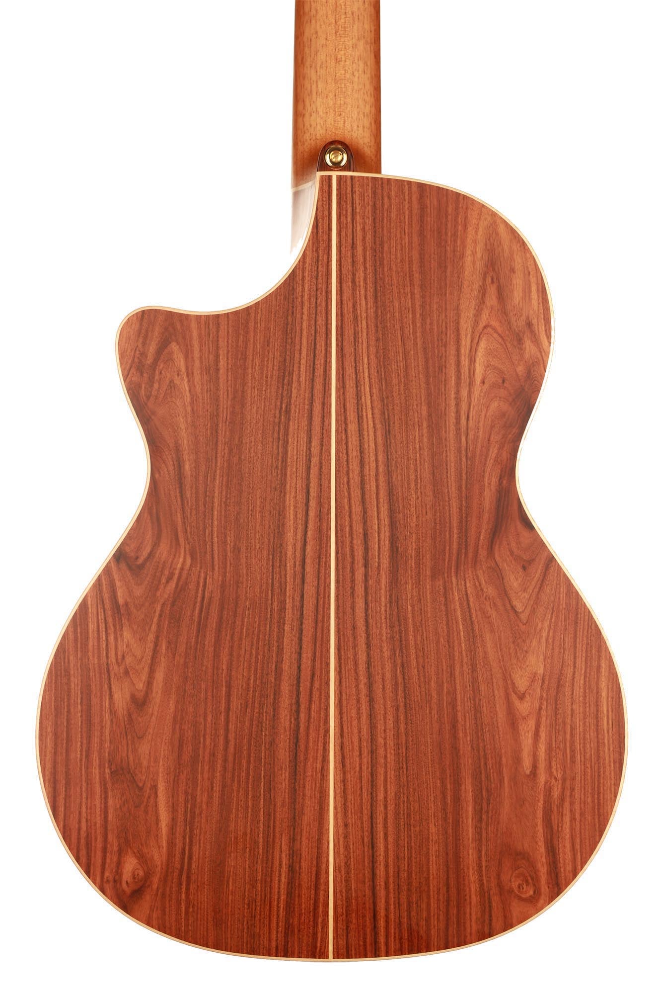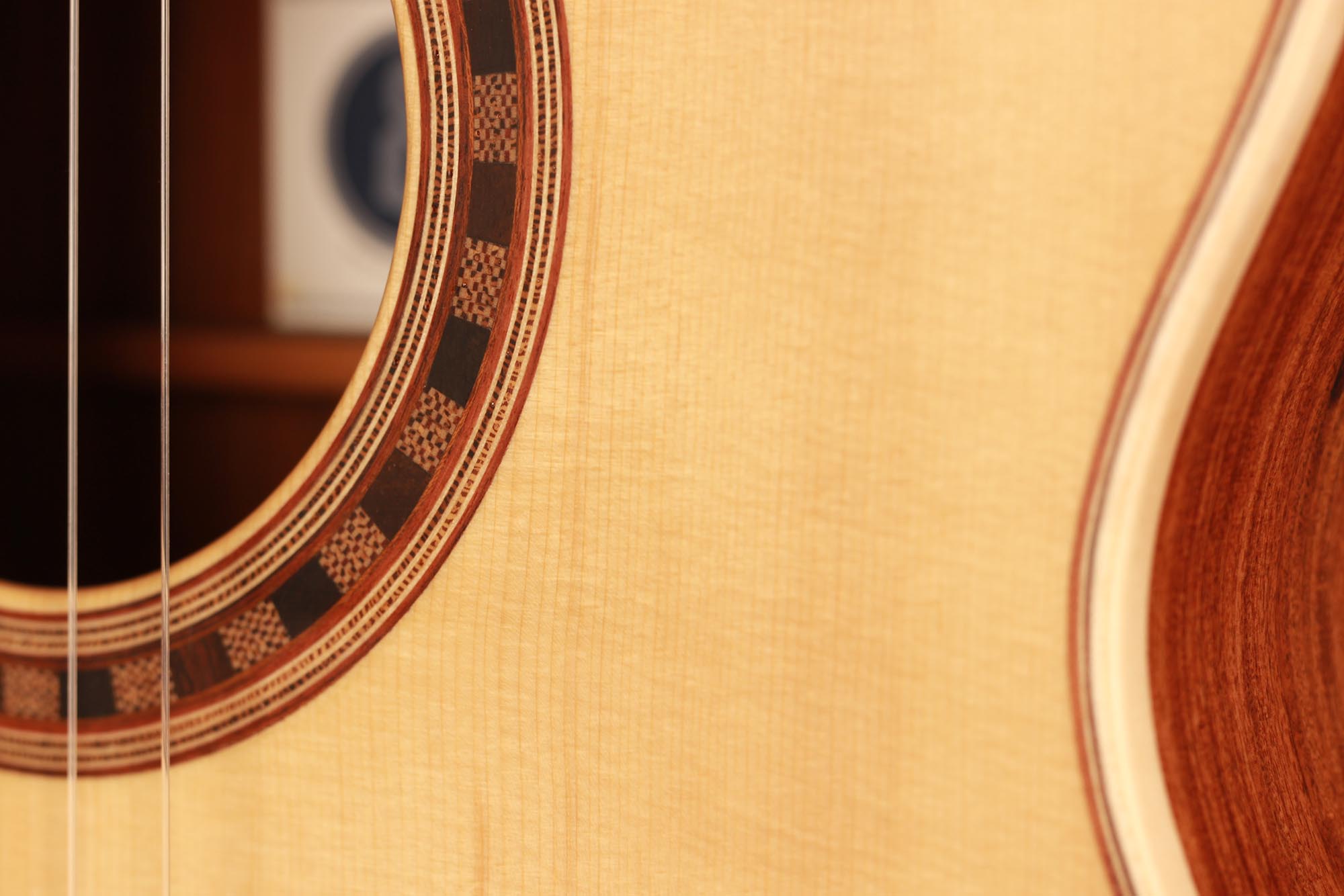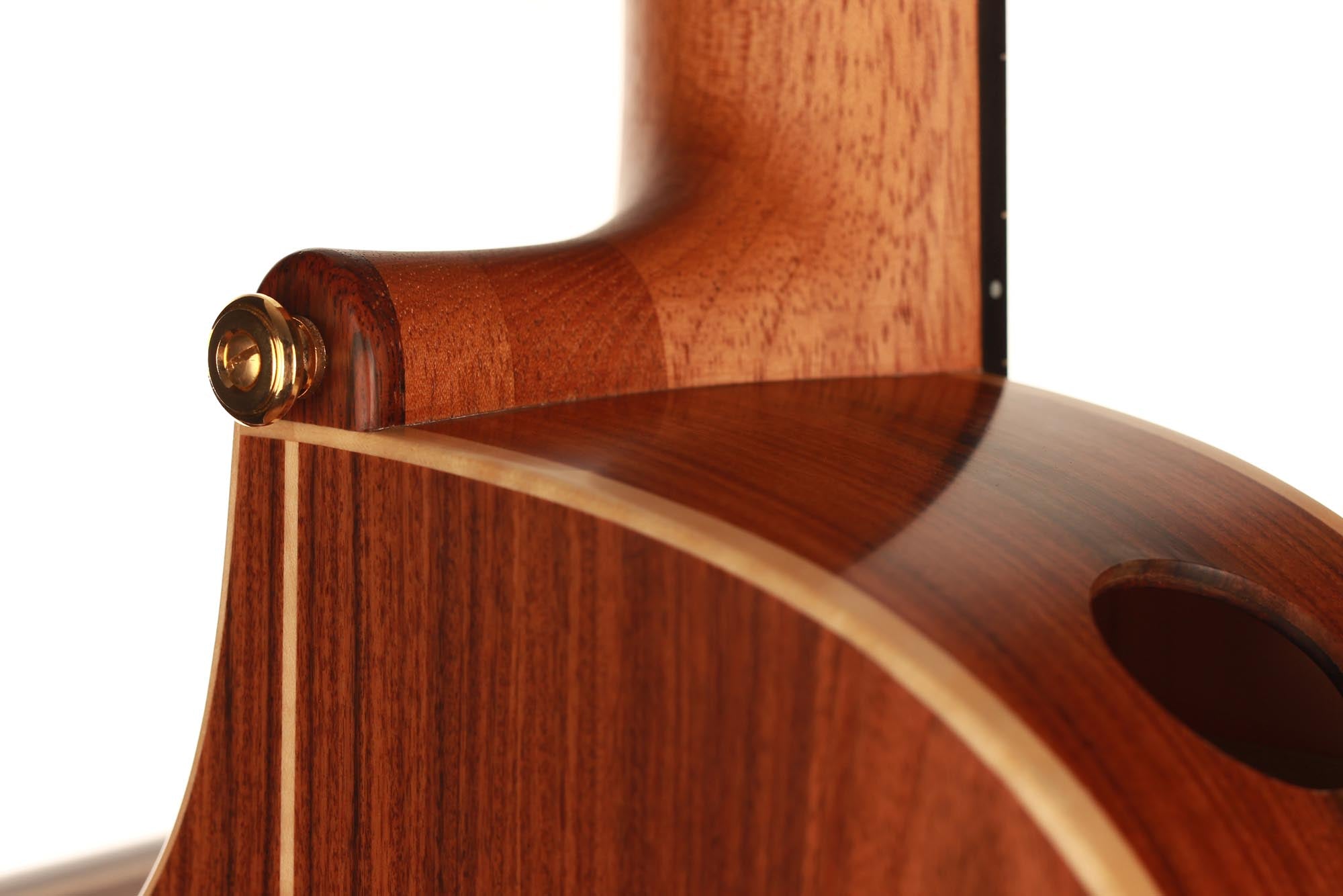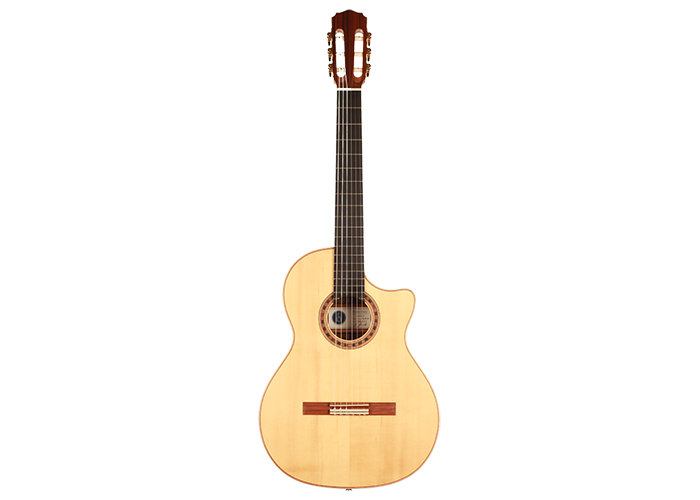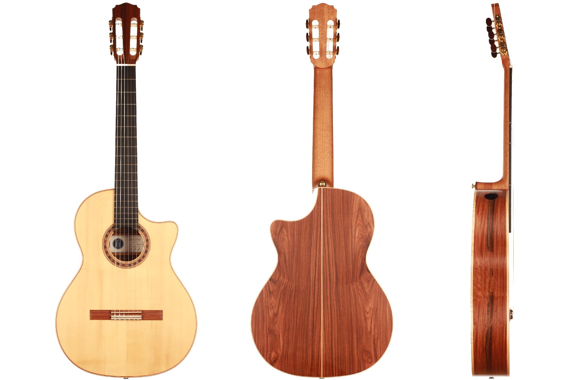 Darüber hinaus hat die Gitarre zusätzliches Zargen-Schallloch, so dass sich der Gitarrist beim Spielen selbst besser hören kann. Der Tonabnehmer ist ein hochwertige Carlos VIP DM, mit Untersattel-Koaxial-(VIP)-Wandler und Mini-Mikro, MONO-Ausgang, 3 Regler am Schallloch (Master, Ton, Mikroverstärkung). Dieses vielseitige Modell ist außerdem CITES-frei.