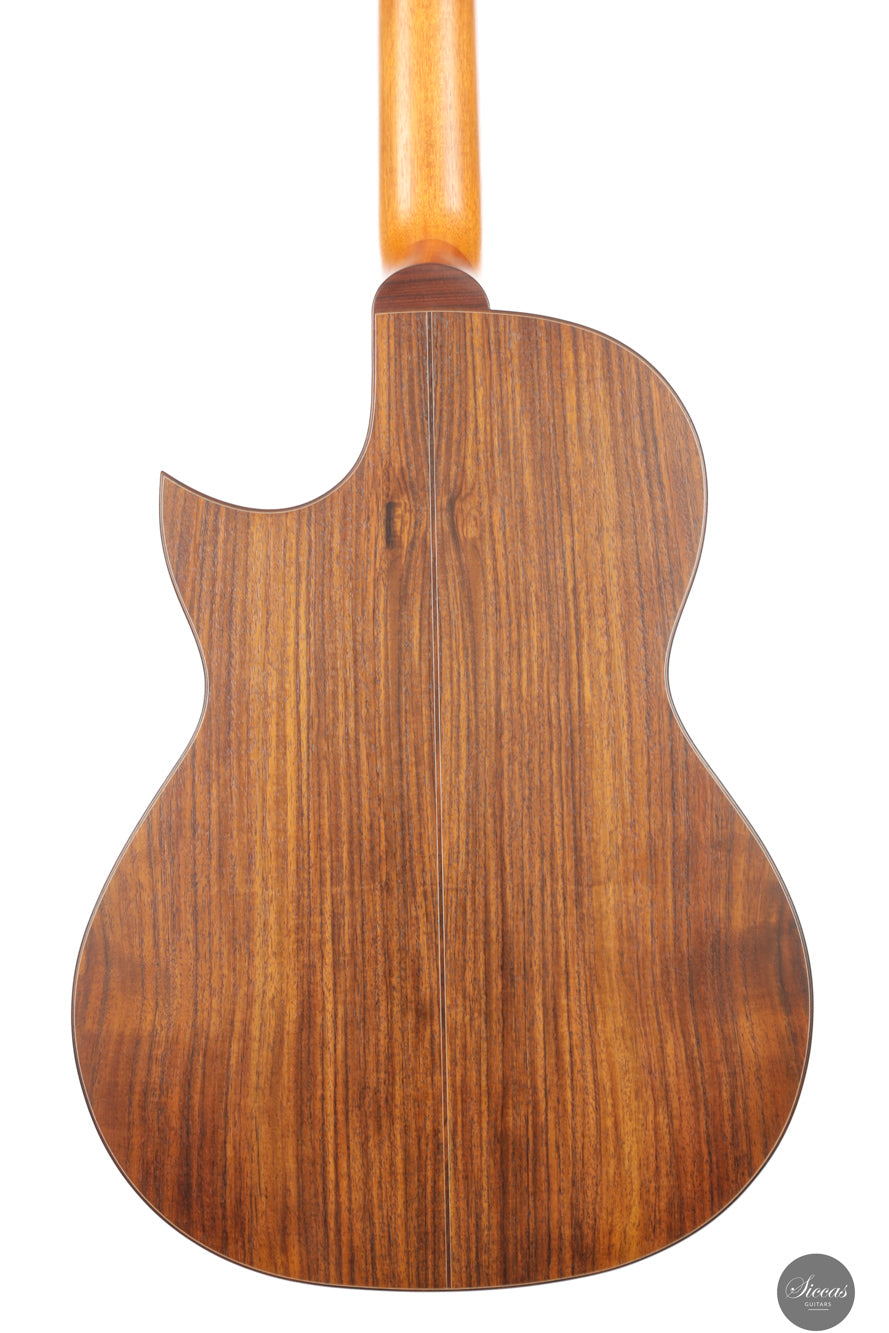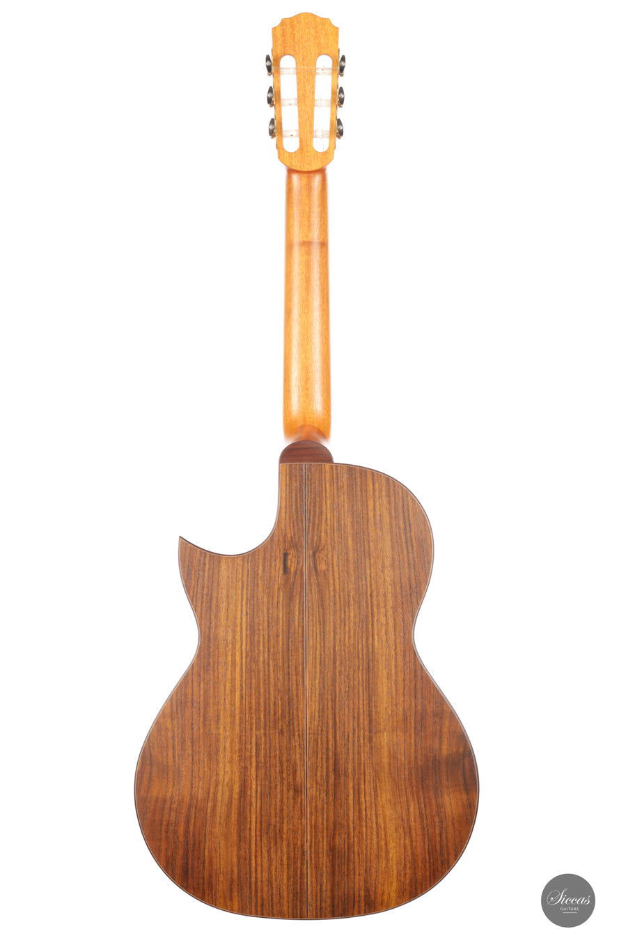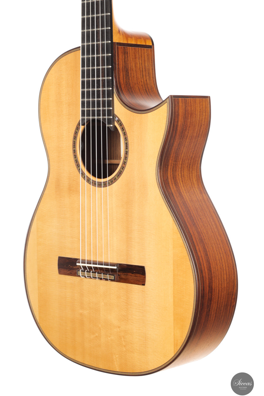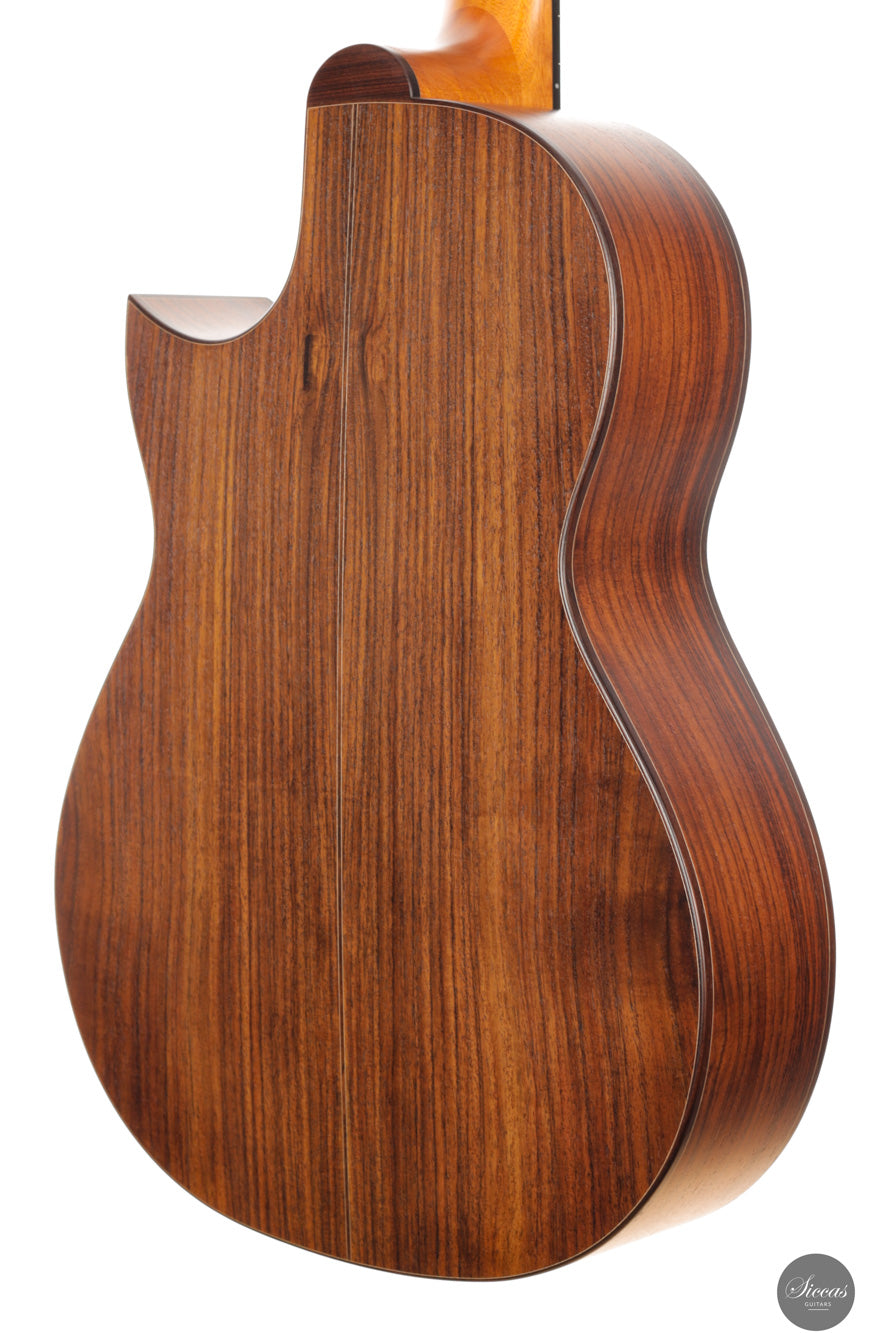 Die Kombination aus indischem Palisander für Boden und Zargen und einer Polyurethan-Lackierung sorgt für klare Projektion bei gleichzeitig warmer Tonalität. Der Cutaway ermöglicht freien Zugang zu den oberen Lagen und macht die Gitarre zur idealen Wahl für Solisten und Jazzgitarristen. Ausgestattet mit einem hochwertigen Carlos VIP DM Tonabnehmersystem, das einen koaxialen Wandler und ein Mini-Mikrofon mit Mono-Ausgang und diskreten Reglern am Schallloch kombiniert, eignet sich dieses Modell hervorragend für Bühne und Studio. Es vereint klassische Klangästhetik mit moderner Spielfreude.