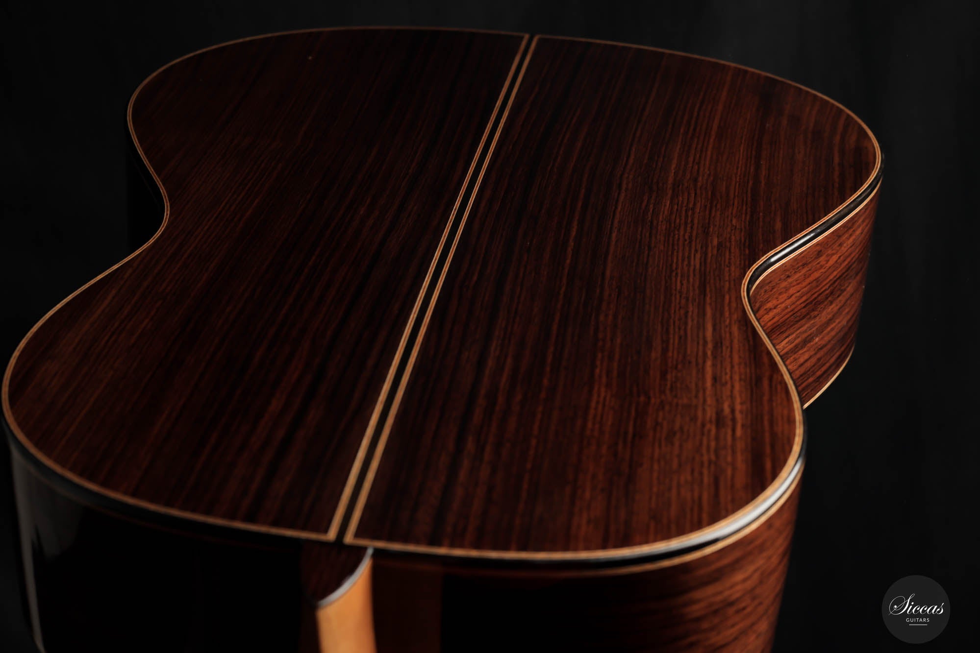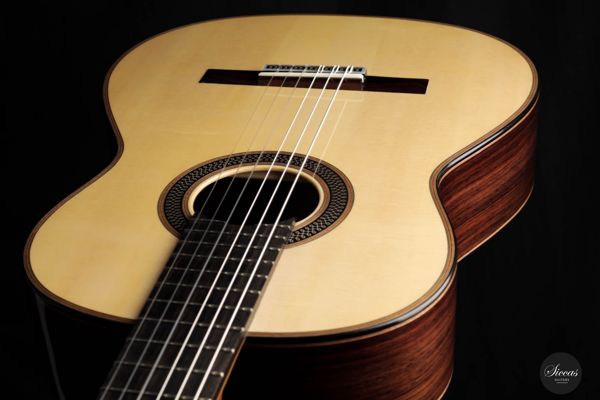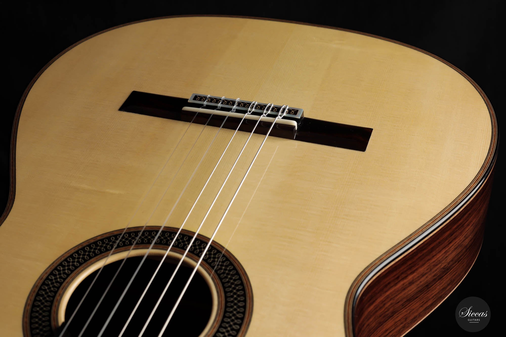 Diese Gitarre von Daniele Marrabello ist eine besonders reizvolle und edel gestaltete Gitarre mit einer absolut herausragenden Auswahl an Hölzern. Die Ästhetik dieses Instruments ist beeindruckend, und Daniele hat seine handwerkliche Kunstfertigkeit bei diesem Instrument vollständig ausgeschöpft. Die Kombination aus dreiteiligem indischem Palisander, einer federleichten, von Hand gespaltenen Decke aus Schweizer Fichte erster Klasse und einem intensiv geflammten Cedrela-Odorata-Hals mit einer Fülle von feinen und eleganten Verzierungen machen sie zu einem beeindruckenden Gesamtkunstwerk.
