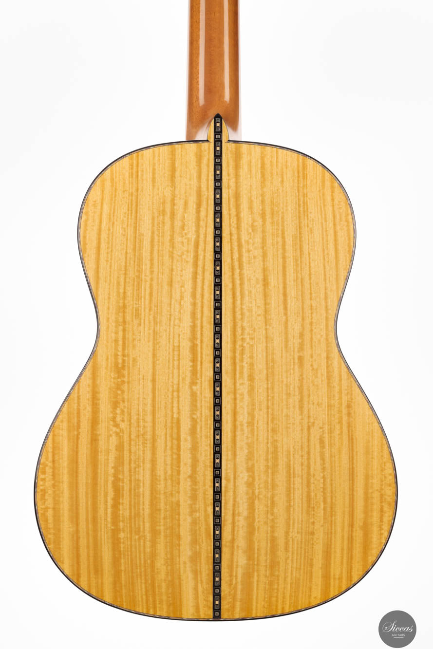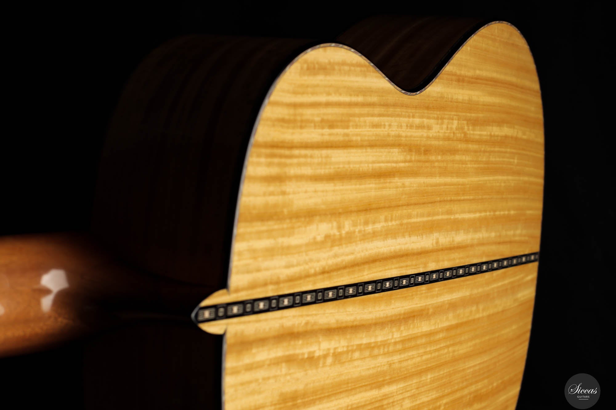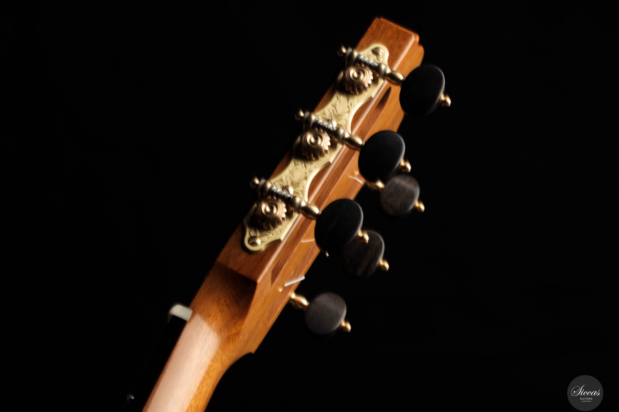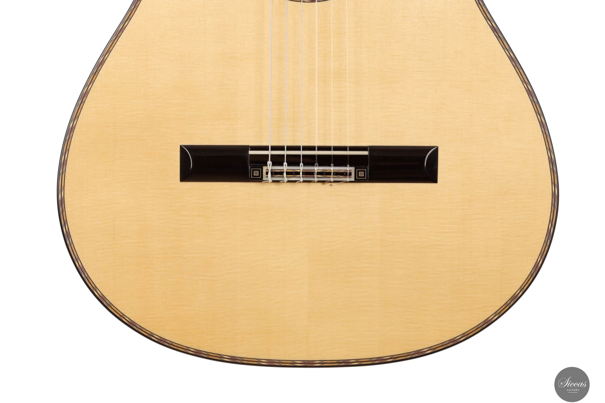 Die „Milano“ verfügt über einen hochwertigen Rücken und Seiten aus Satinholz, ergänzt durch eine handgespaltene Meisterklasse Schweizer Fichtendecke und einen sanft konturierten Hals aus honduranischem Mahagoni mit V-Verbindung. Das Rosetten-Design, inspiriert vom Pflaster der Mailänder Piazza del Duomo, beinhaltet konzentrische Quadrate und geometrische Figuren, umrahmt von einem farbenfrohen doppelten Halbherringbone aus Movingui, Purpurholz, Ahorn und Rosenholz, das eine Bewegungsillusion erzeugt, die den Betrachter fesselt. Diese Gitarre hat nicht nur eine beeindruckende Erscheinung, sondern überzeugt auch akustisch; sie erzeugt kristallklare Höhen und tiefe, resonante Bässe, mit einer F-Hauptresonanz, die eine solide, farbenfrohe Grundlage bildet. Die Höhen sind außergewöhnlich lebendig, klingen glockenartig und besitzen doch die Geschmeidigkeit von samtigem Leder. Dieses Instrument zu besitzen bedeutet nicht nur, ein hervorragendes musikalisches Werkzeug zu besitzen, sondern auch ein Kunstwerk, das tiefe ästhetische Forschung und innovative Handwerkskunst widerspiegelt.